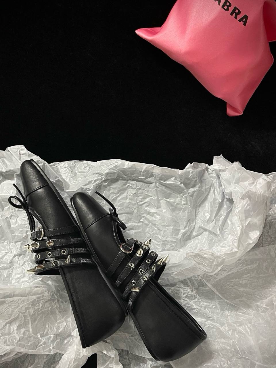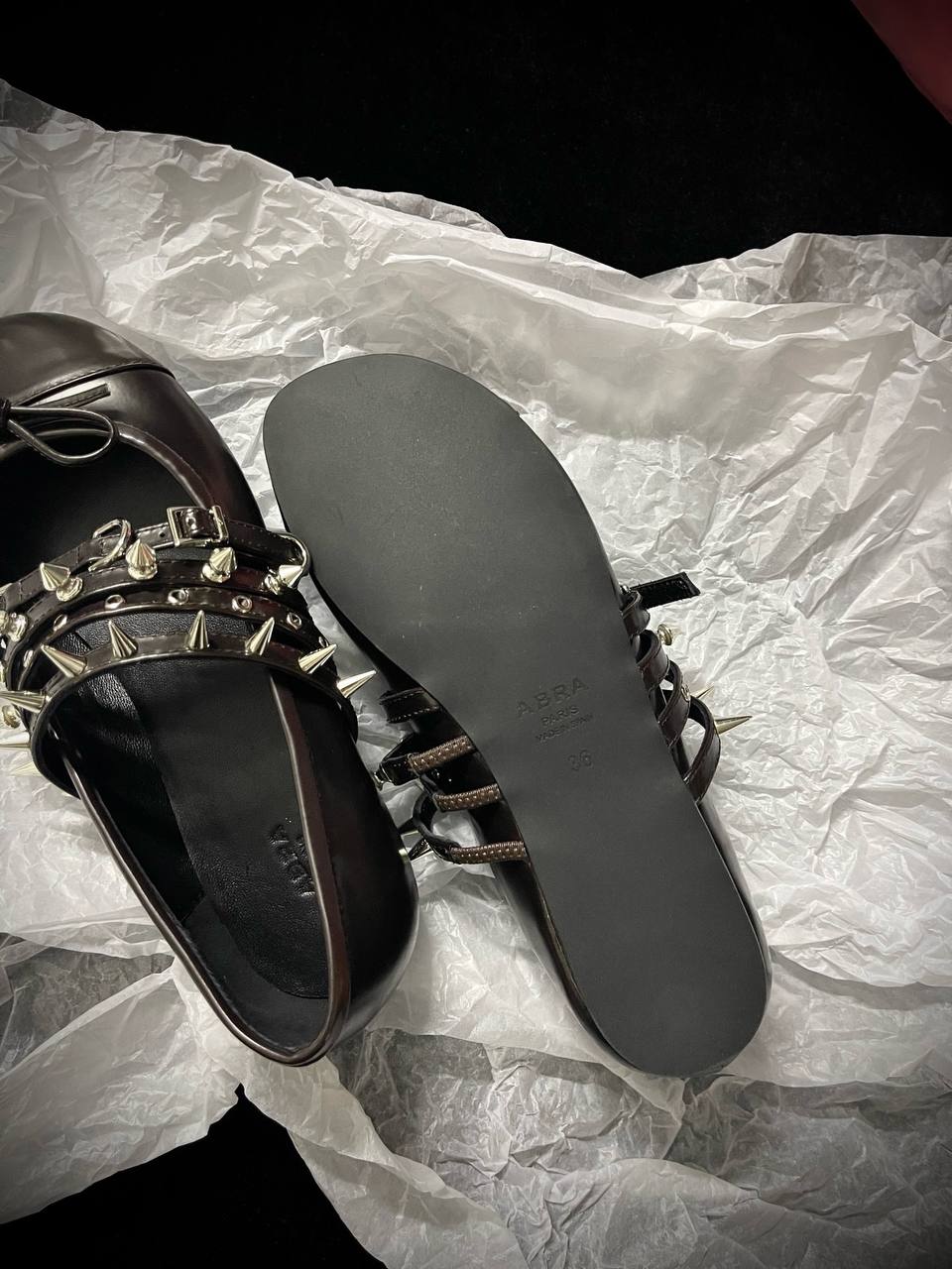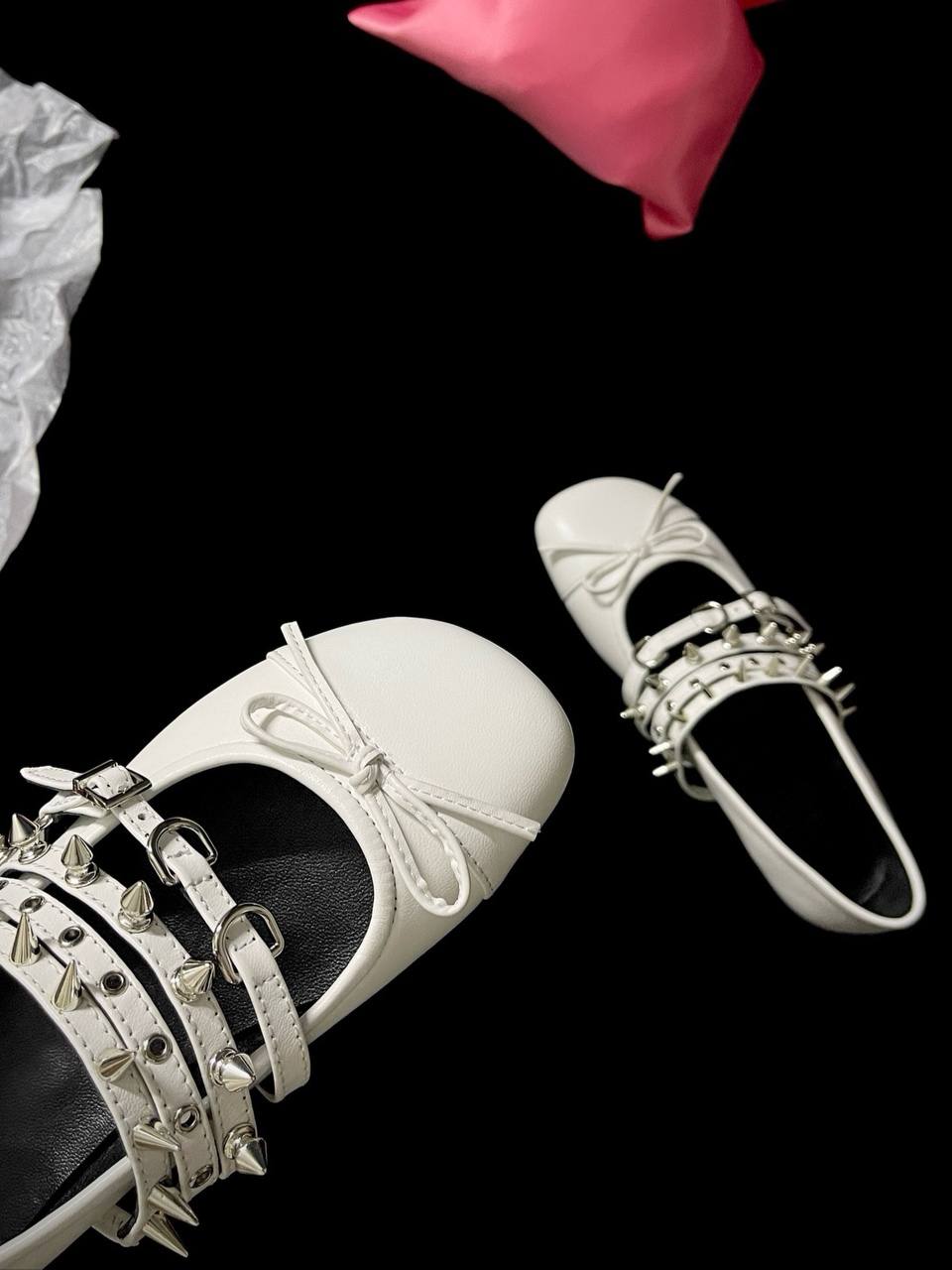 Балетки ABRA Spike выполнены из натуральной кожи. Они имеют круглый носок и украшены бантом в цвет. Кожаные ремешки сверху с заклепками и контрастными серебристыми люверсами.