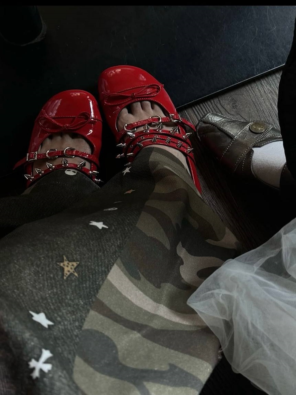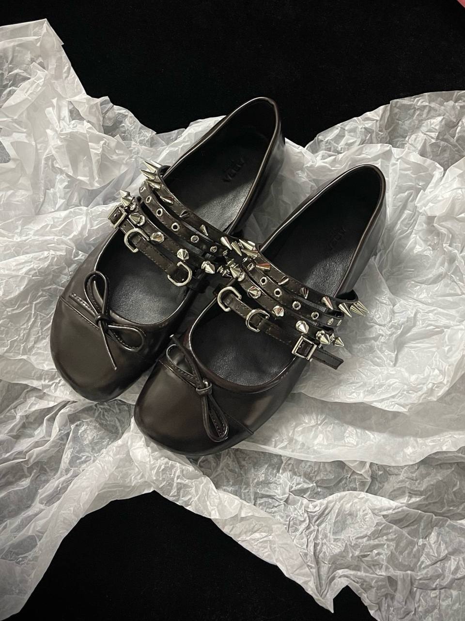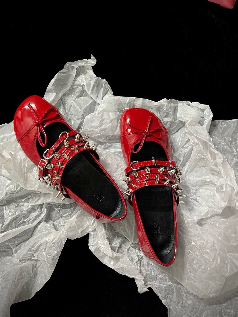 Балетки ABRA Spike выполнены из натуральной кожи. Они имеют круглый носок и украшены бантом в цвет. Кожаные ремешки сверху с заклепками и контрастными серебристыми люверсами.