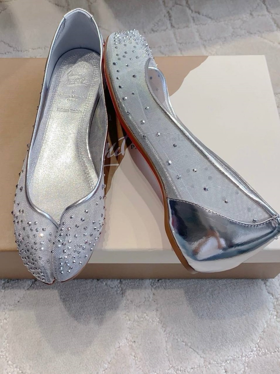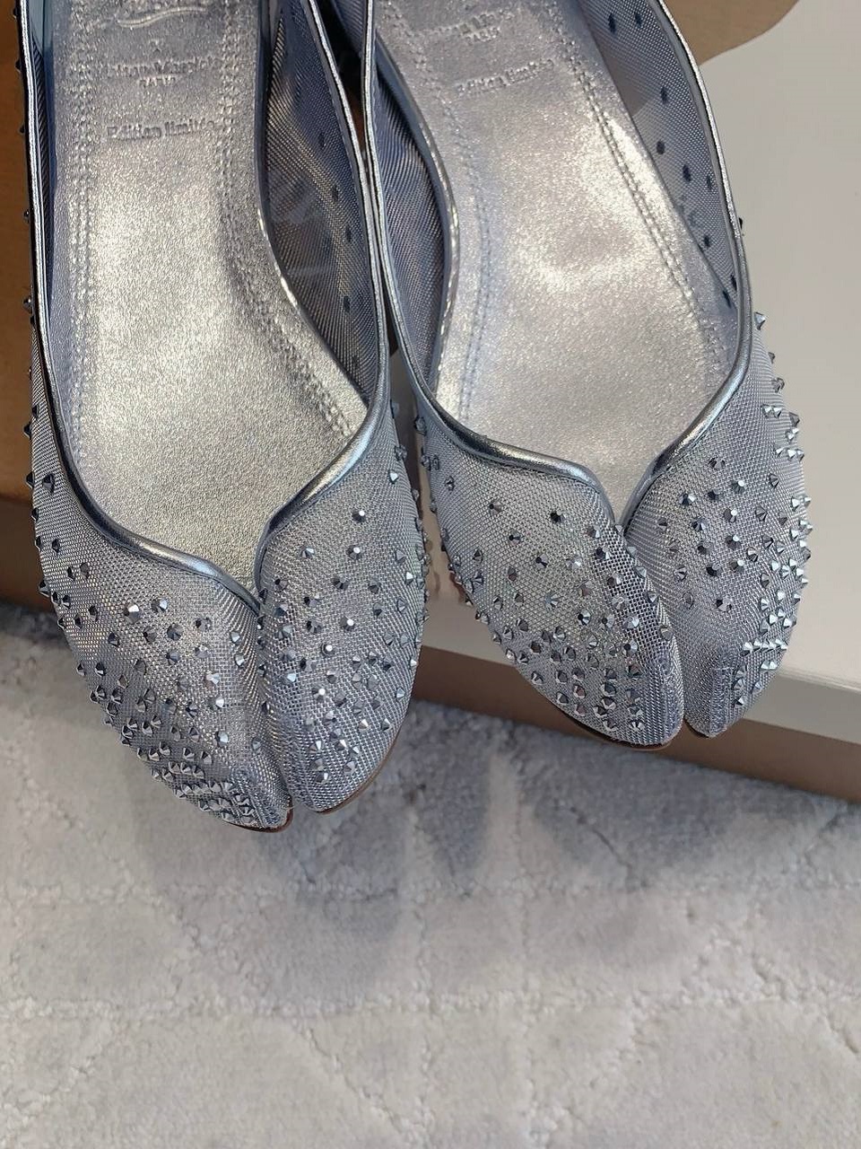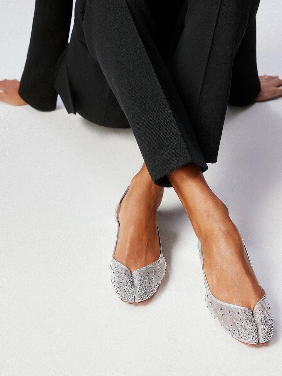 Балетки от Christian Louboutin x Maison Margiela Ballerina смоделированы по образцу классических пуантов. Они сделаны в Италии из мятой лакированной кожи и сетки в стразах, которая позволяет обуви адаптироваться к естественному изгибу вашей стопы, и имеют квадратные носки с разрезом таби. Носите их с чем угодно: от платьев до джинсов.