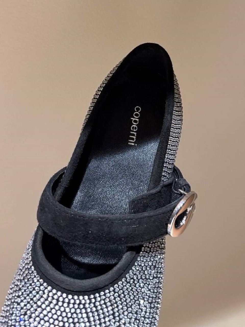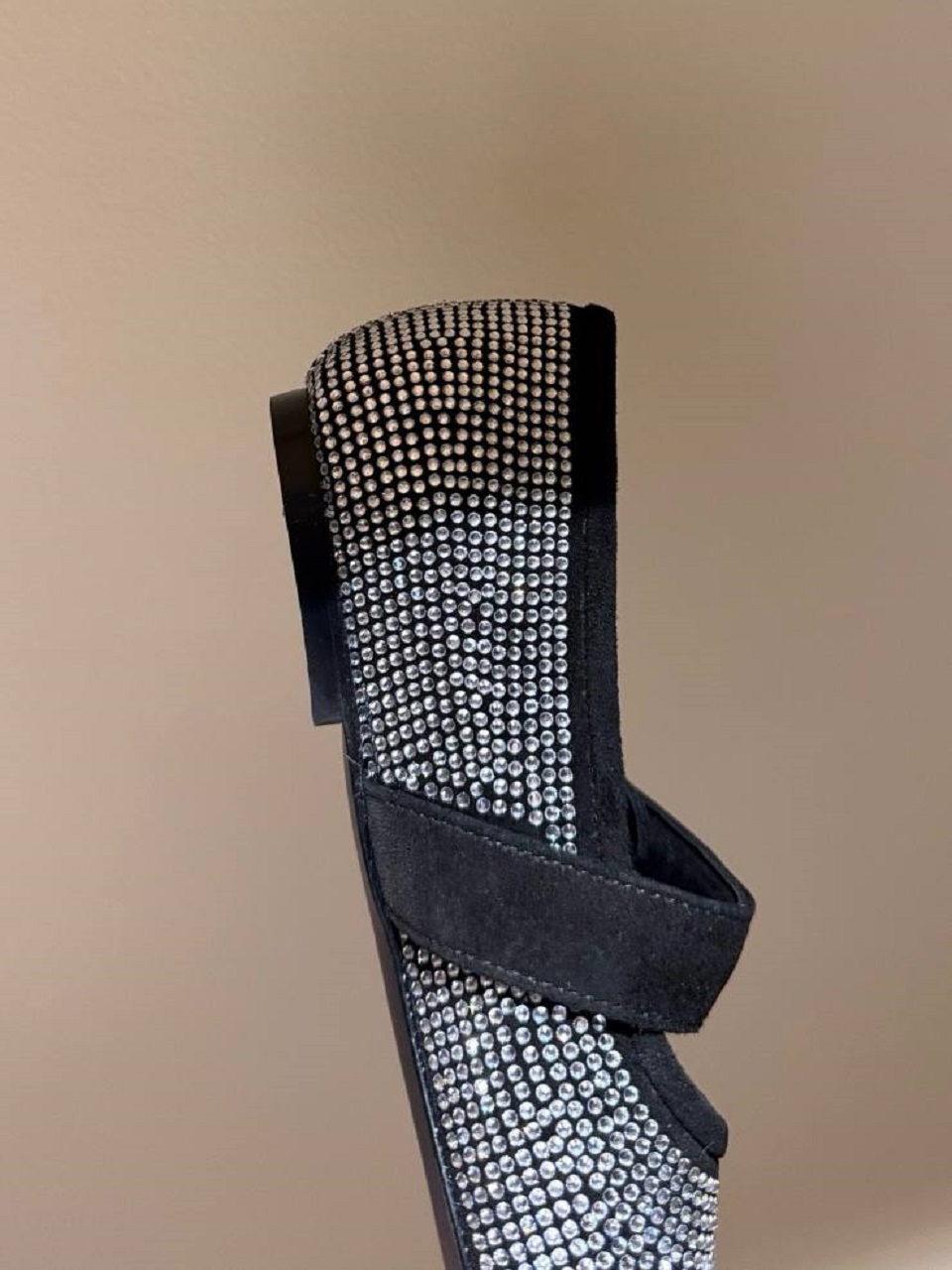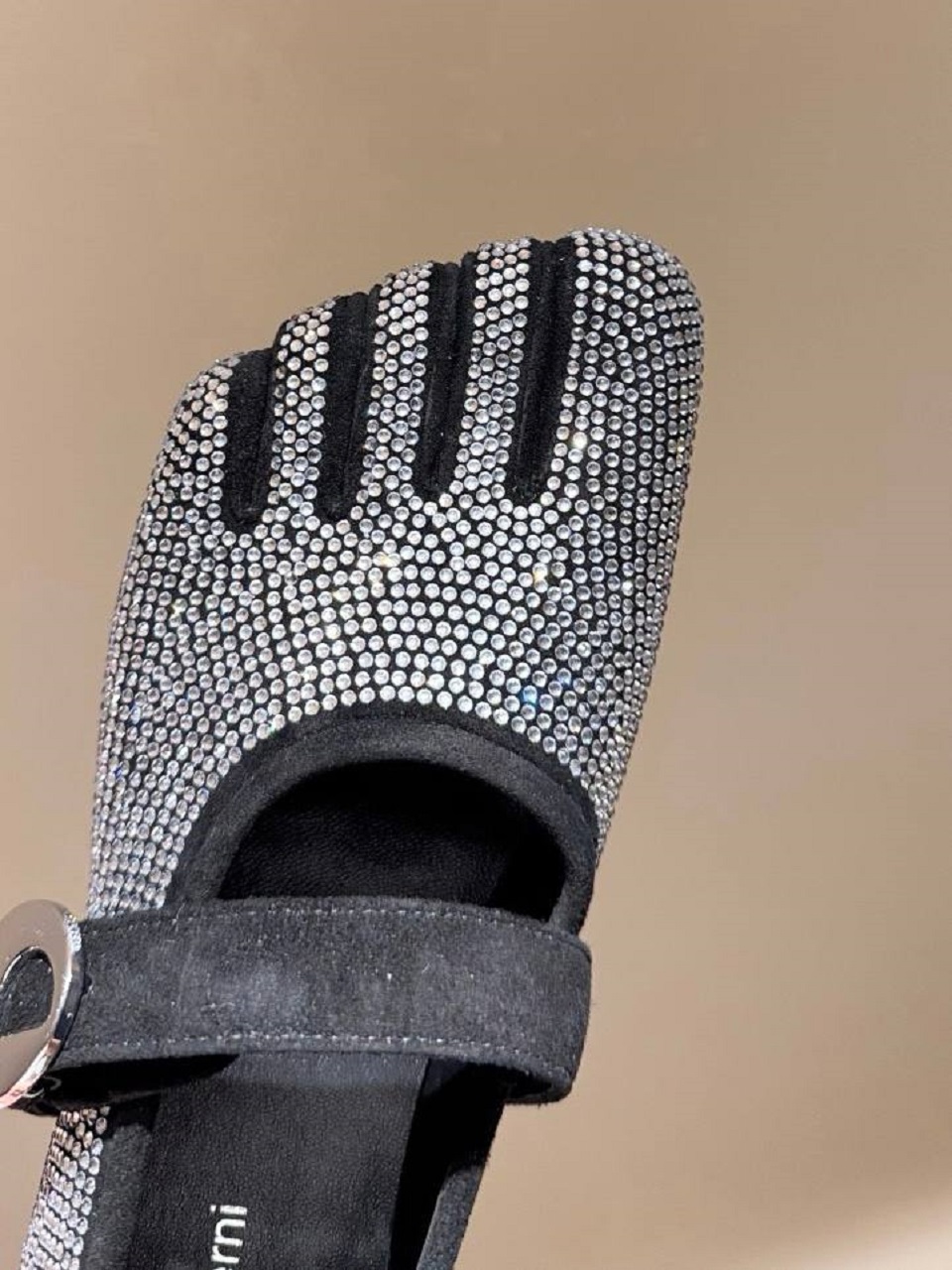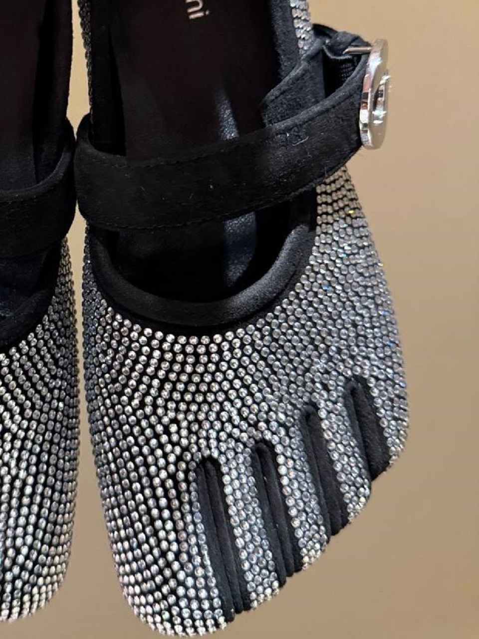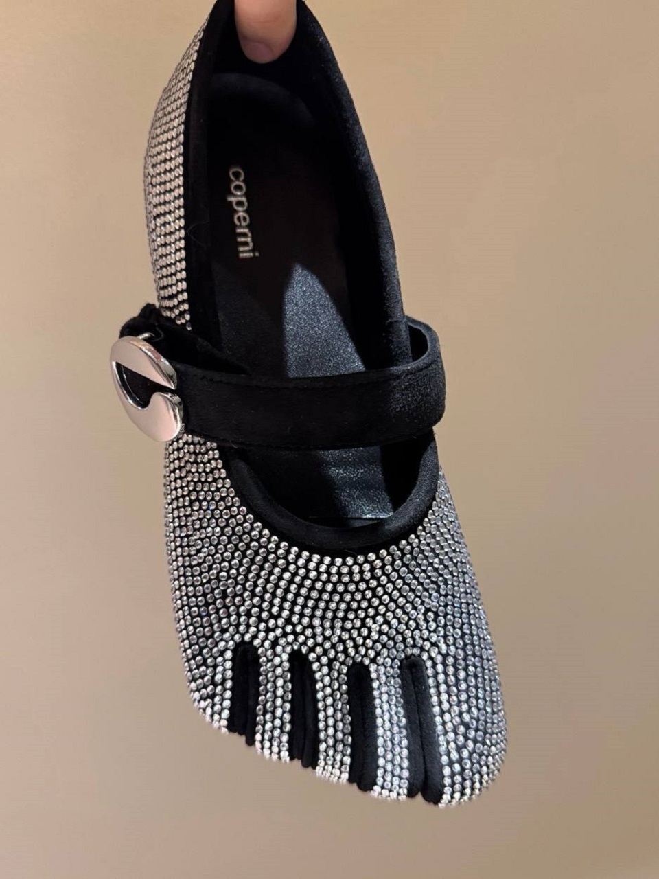 Кожаные балетки черного цвета с носком в виде пальцев выполнены с внутренней отделкой из кожи, дополнены регулируемым ремешком, а также резиновыми каблуком. Украшены балетки кристаллами полностью.