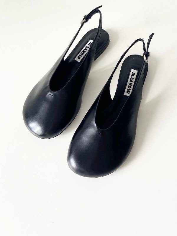 Балетки Jil Sander с открытой пяткой сделаны из натуральной кожи. Данная модель с закругленным носком, сзади на застежке. Купить балетки можно в трех цветах: чёрный, золото, металлик.