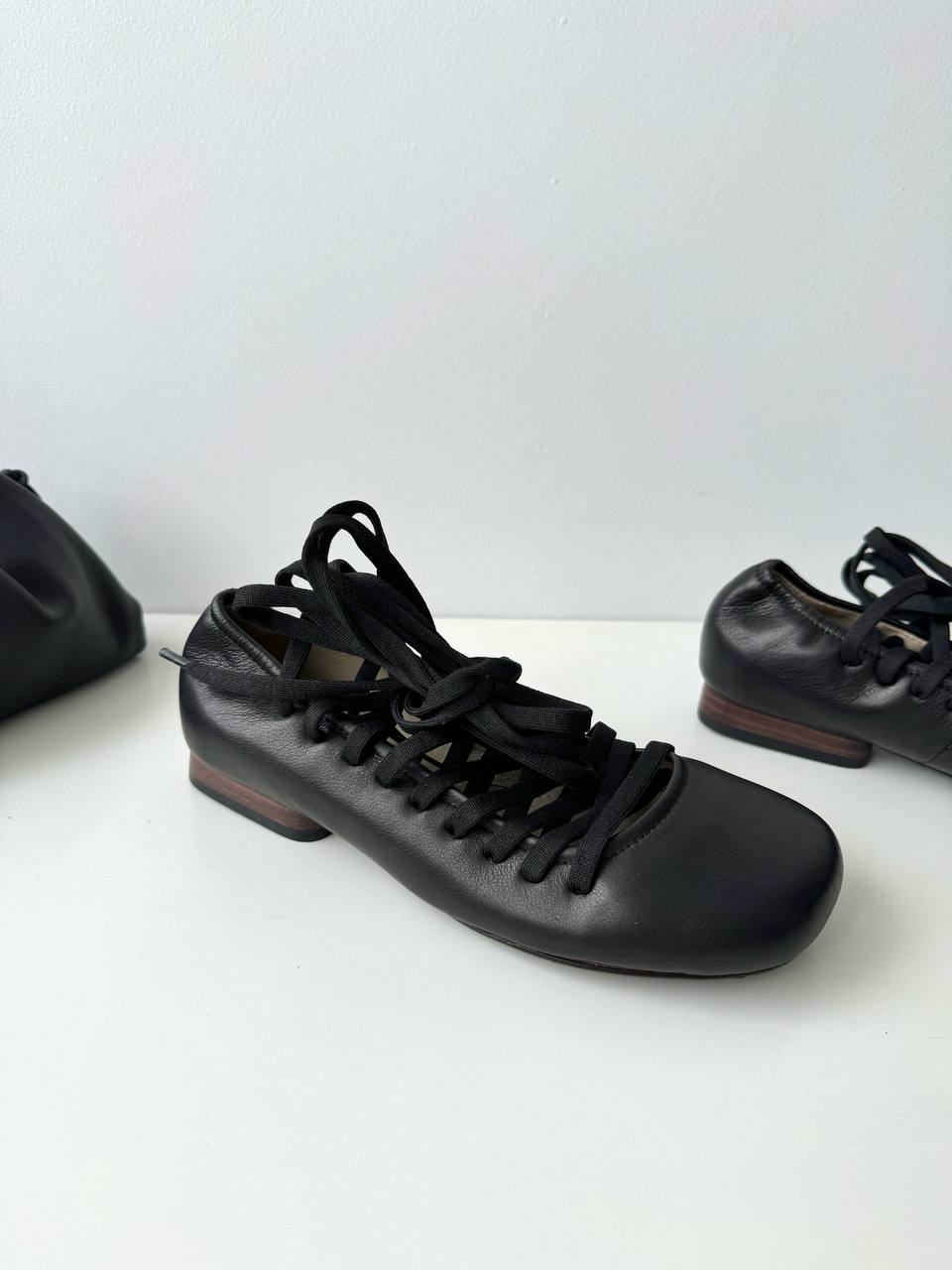 Балетки Lemaire сделаны из натуральной кожи на завязках. Данная модель в черном цвете с закругленным носком и небольшим каблуком. Купив балетки вы дополните свой образ.