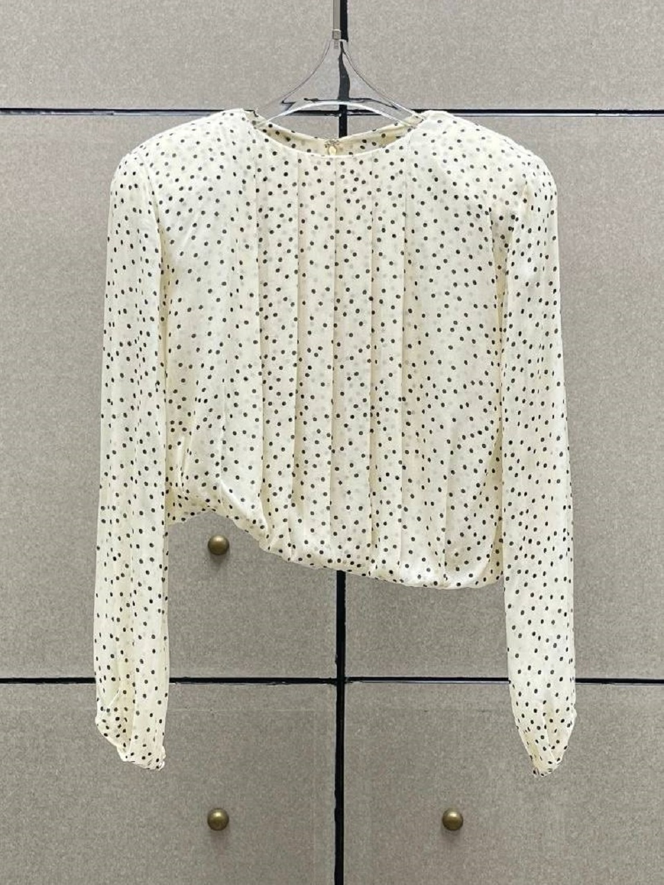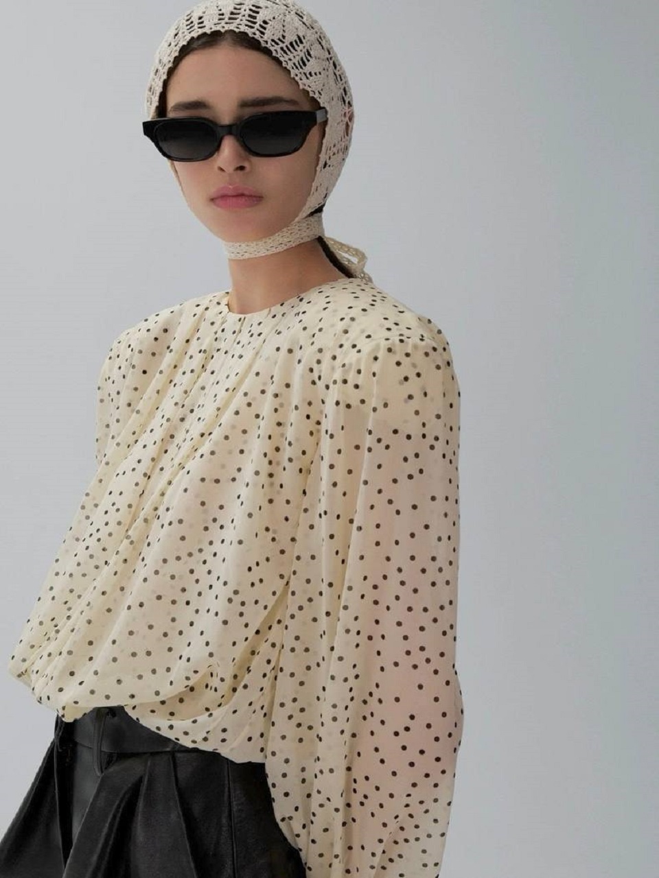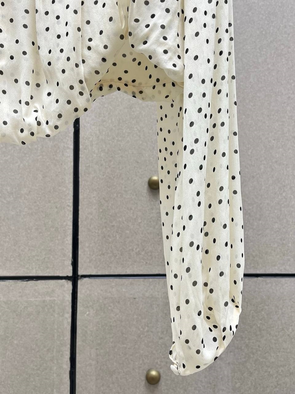 Блузка в крестьянском стиле от Magda Butrum имеет причудливое, воздушное ощущение. Она белого цвета в горошек выполнена из вискозы в волнистой форме и дополнена резинками на рукавах и талии.