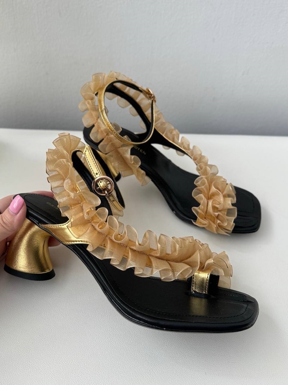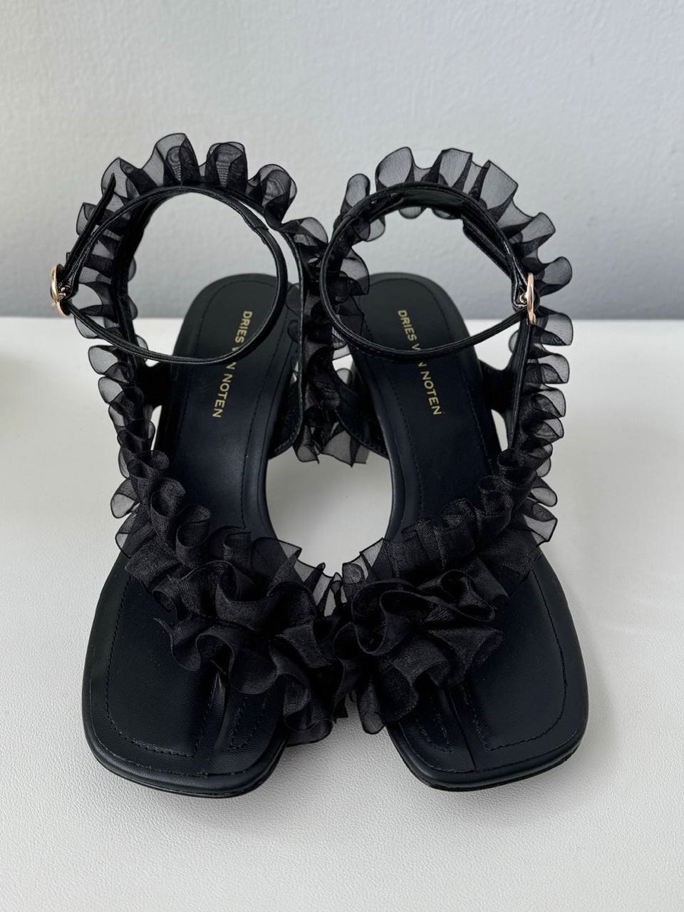 Dries Van Noten играет с текстурой, размером и скульптурными формами, чтобы создать эти неожиданные босоножки. Сделанные из тюля и кожи, они имеют гофрированные ремешки и изогнутые блочные каблуки. Они мгновенно украсят даже самый минималистичный наряд.