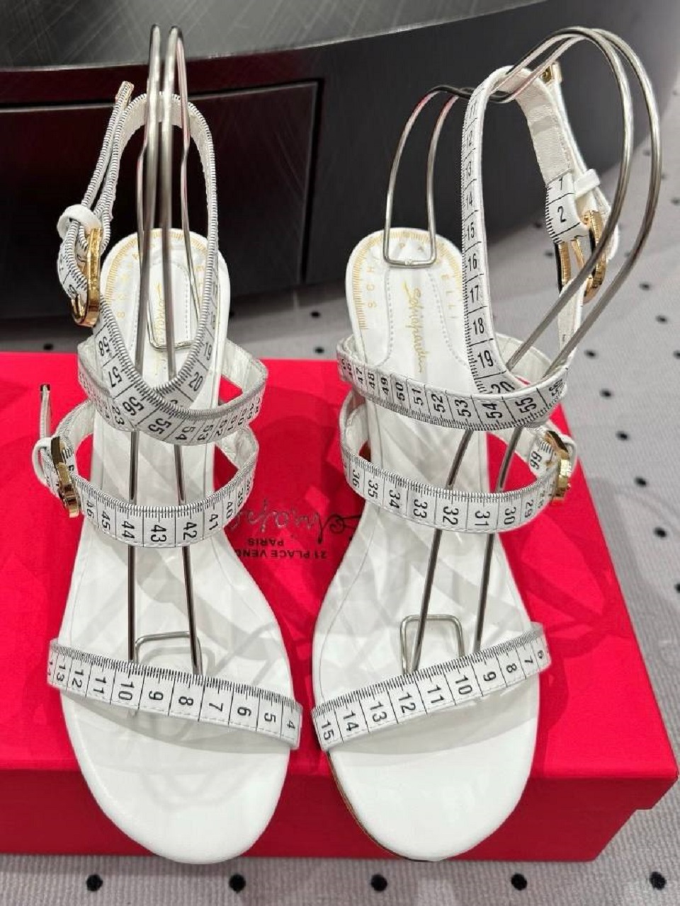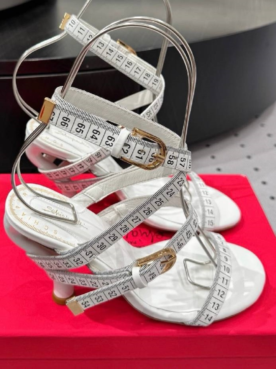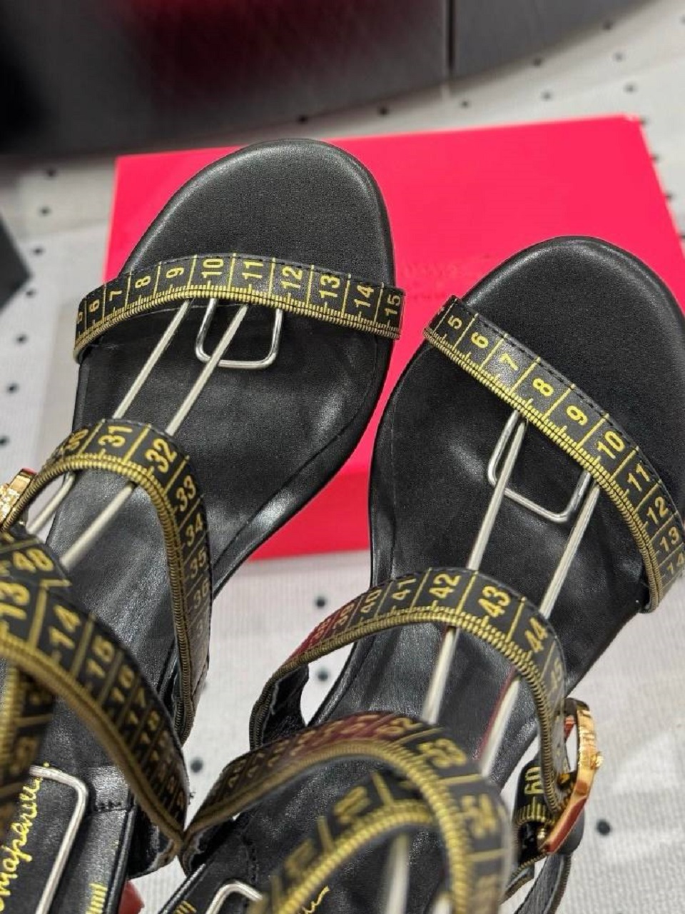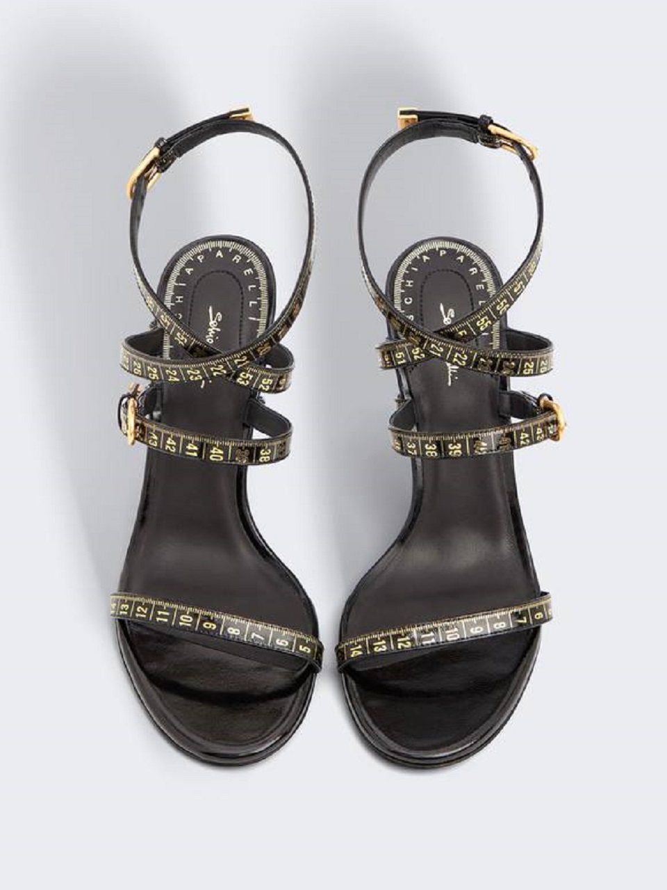 Босоножки Schiaparelli выполнены из натуральной кожи. Они на высоком каблуке и имеют полосы в виде метра. Завершите образ глянцевым педикюром.