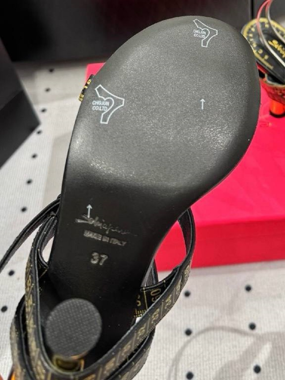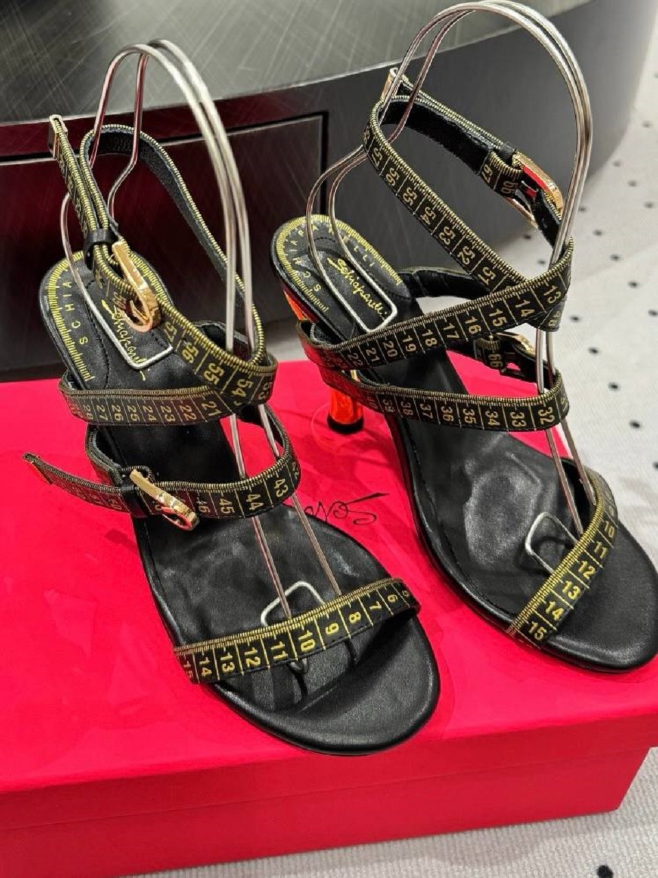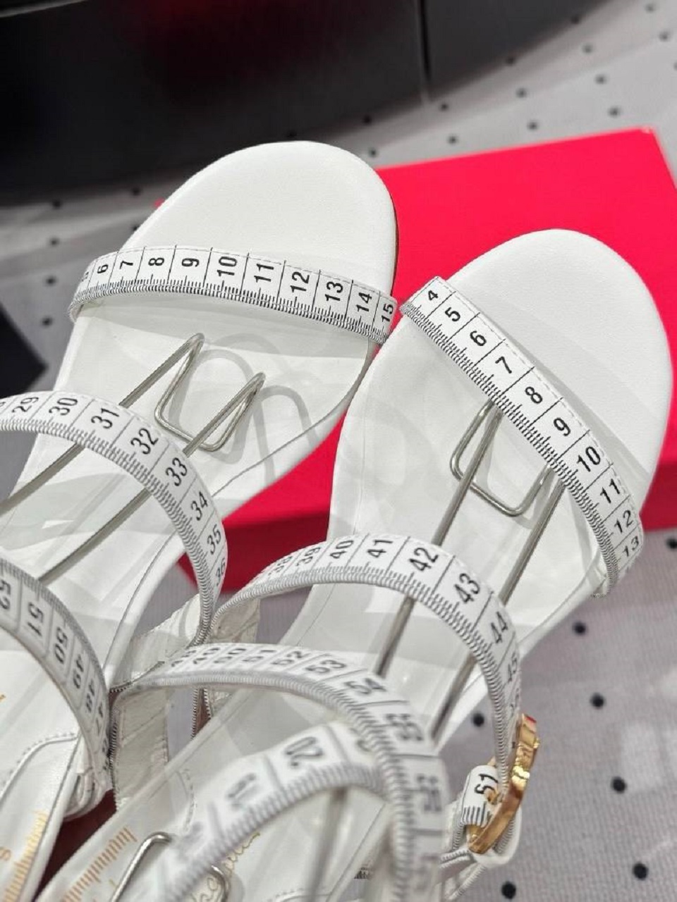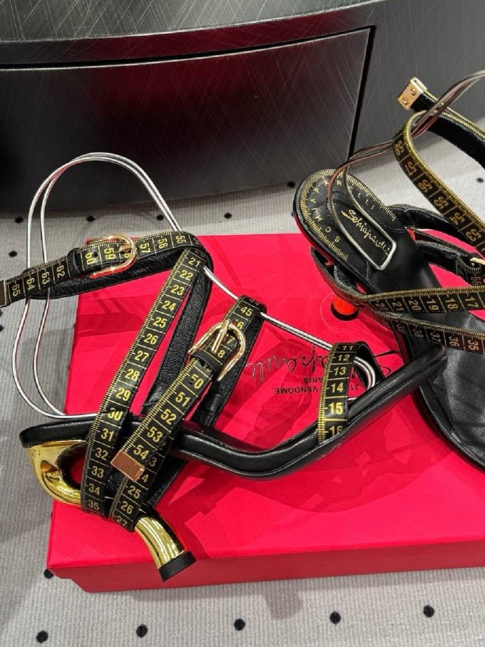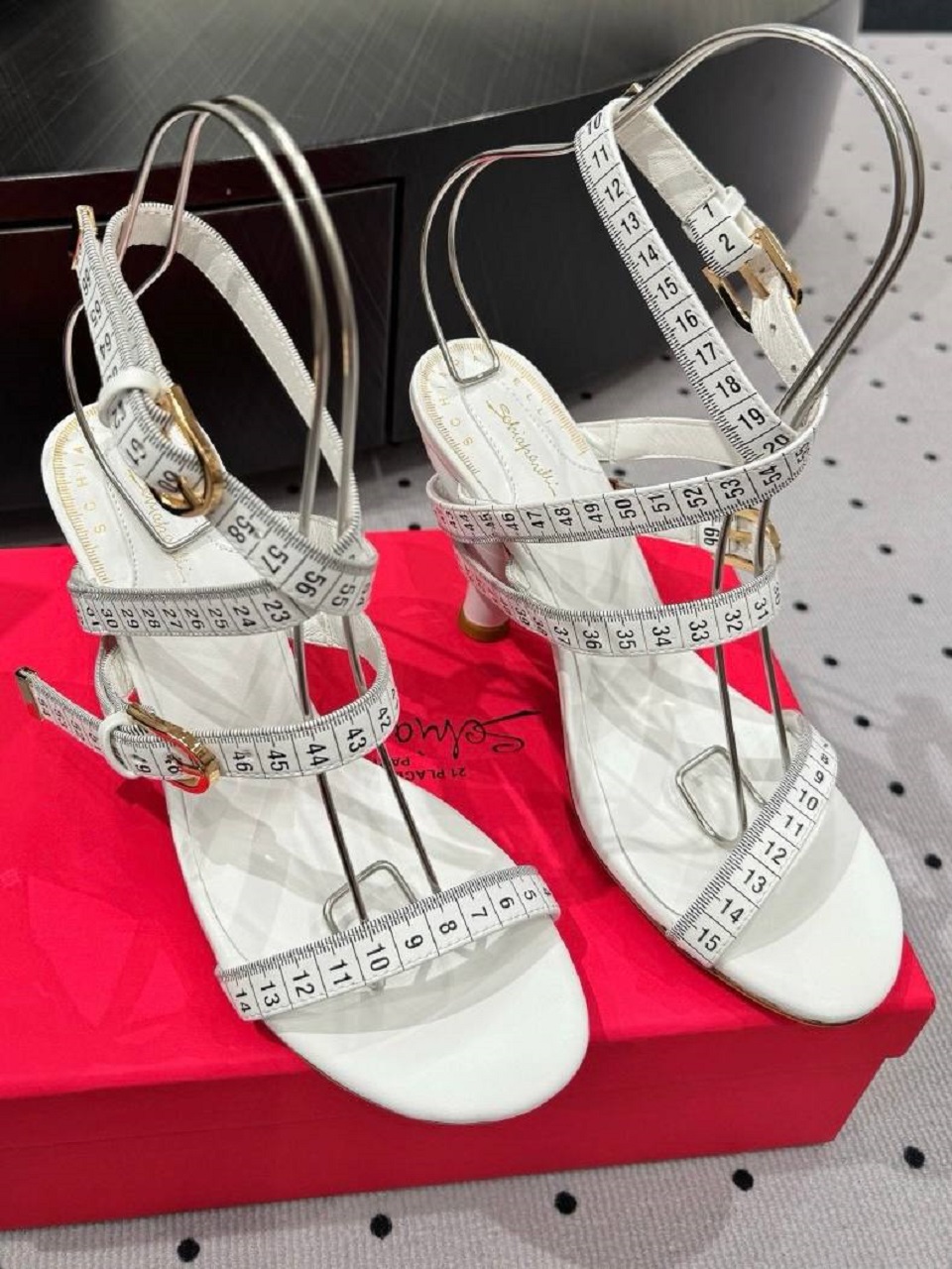 Босоножки Schiaparelli выполнены из натуральной кожи. Они на высоком каблуке и имеют полосы в виде метра. Завершите образ глянцевым педикюром.
