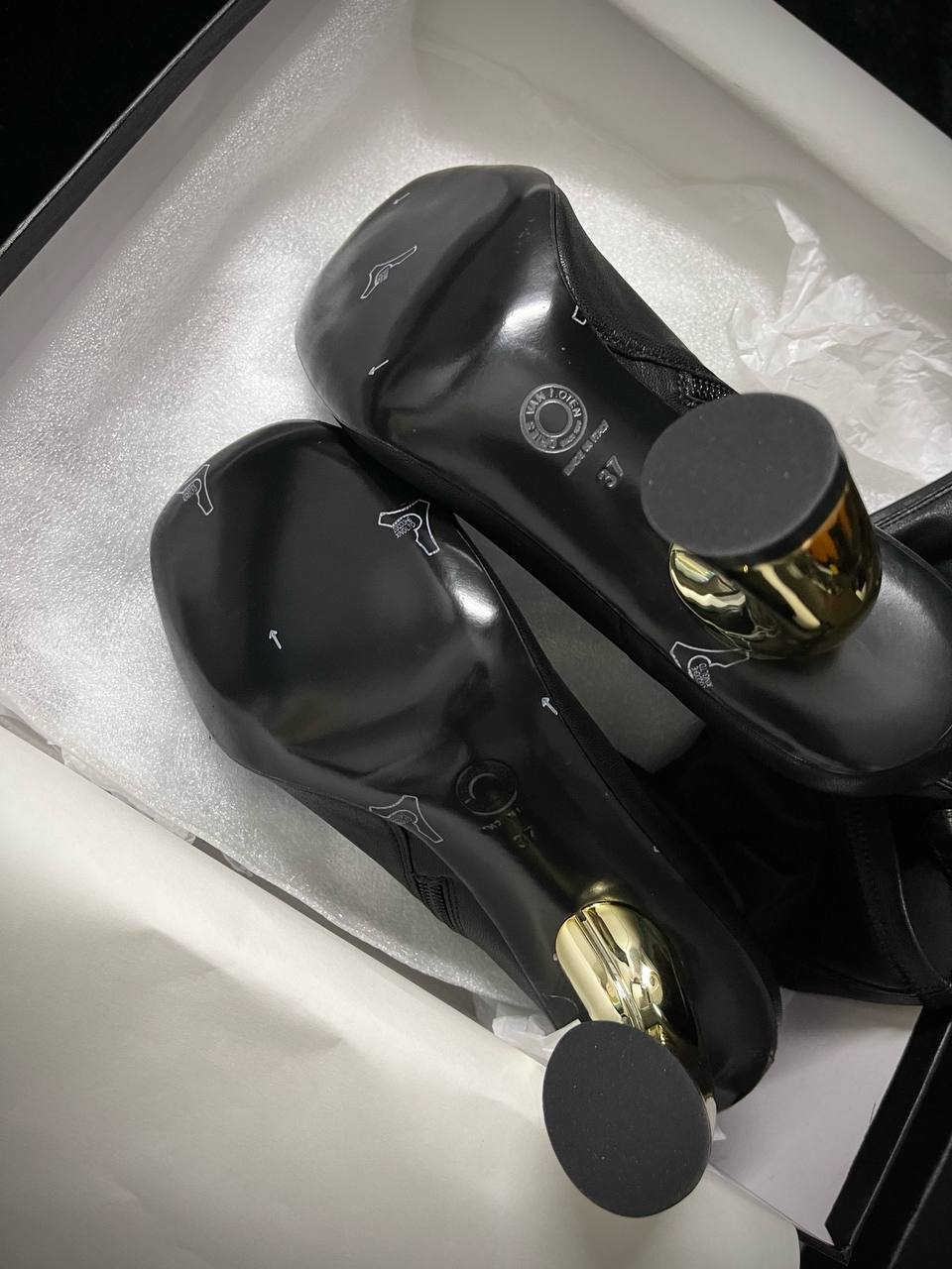 Ботильоны Dries Van Noten сделаны из натуральной кожи. Данная модель на каблуке в золотом цвете, сами ботильоны черные с квадратным мягким носком. Купив ботильоны вы дополните свой образ.