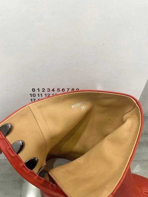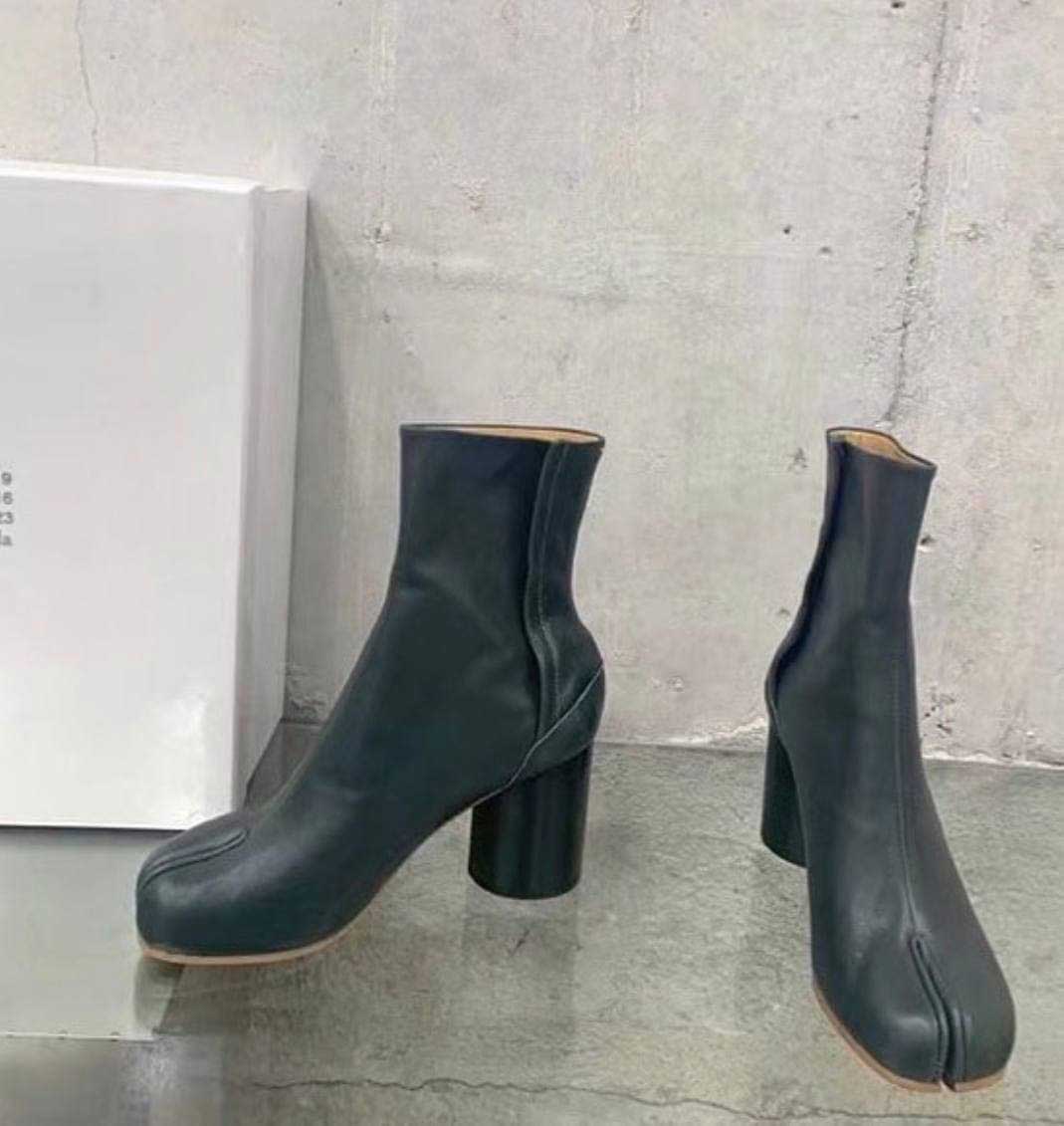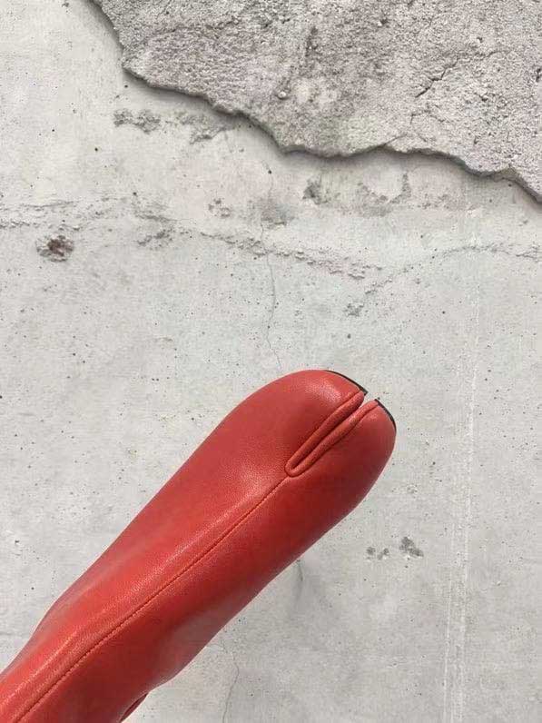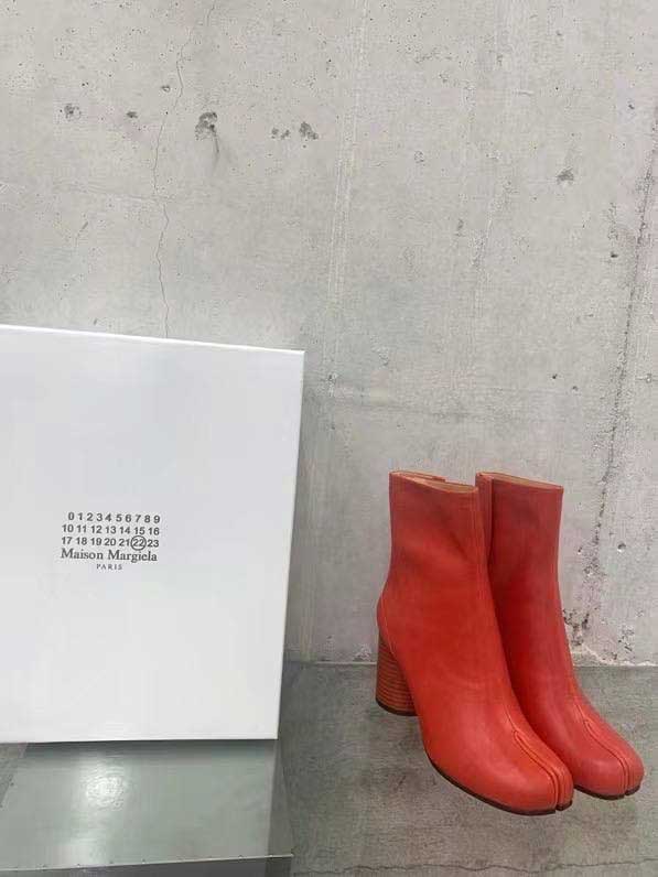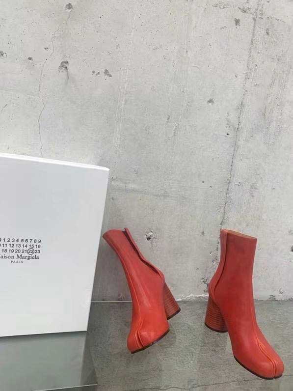 Ботильоны Maison Margiela Tabi из телячьей кожи. Знаковый логотип-стежок, знаковый раздвоенный носок Tabi, застежка на молнии сбоку, стелька с логотипом и наборный каблук средней высоты 7,5 см. Цвета: красный, зеленый.