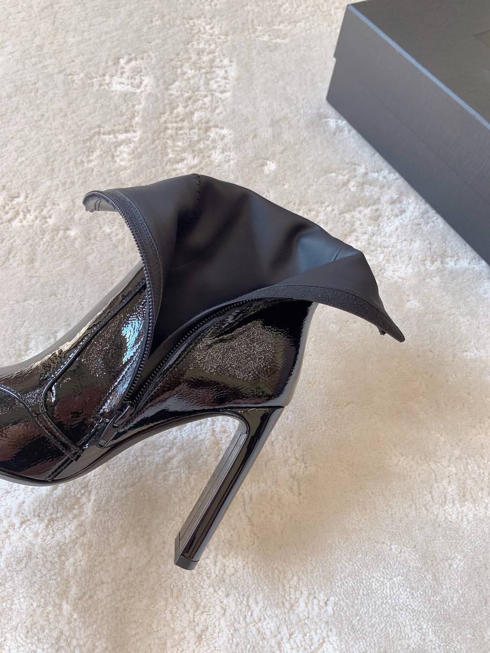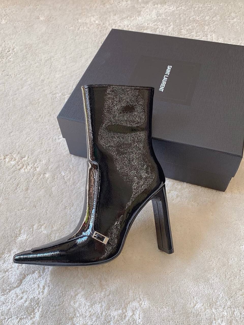 Ботильоны Saint Laurent сделаны из натуральной лаковой кожи. Данная модель на каблуке с длинным острым носком. Купив невысокие ботильоны вы дополните свой образ.