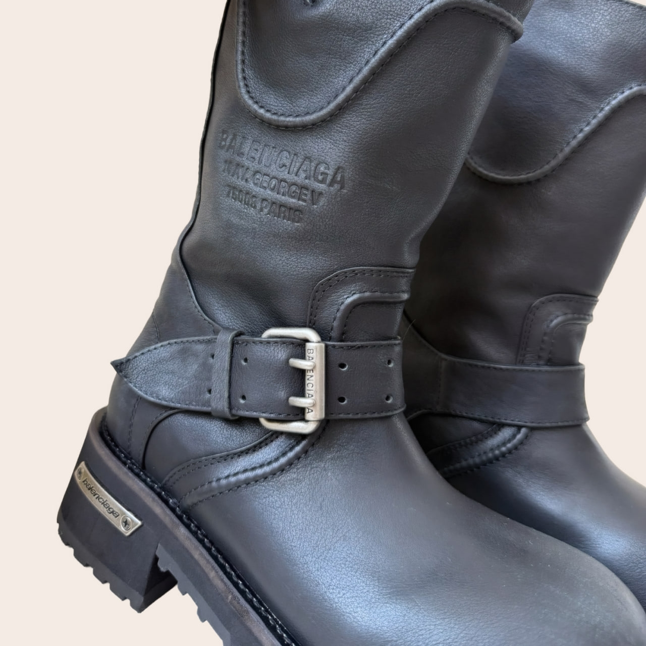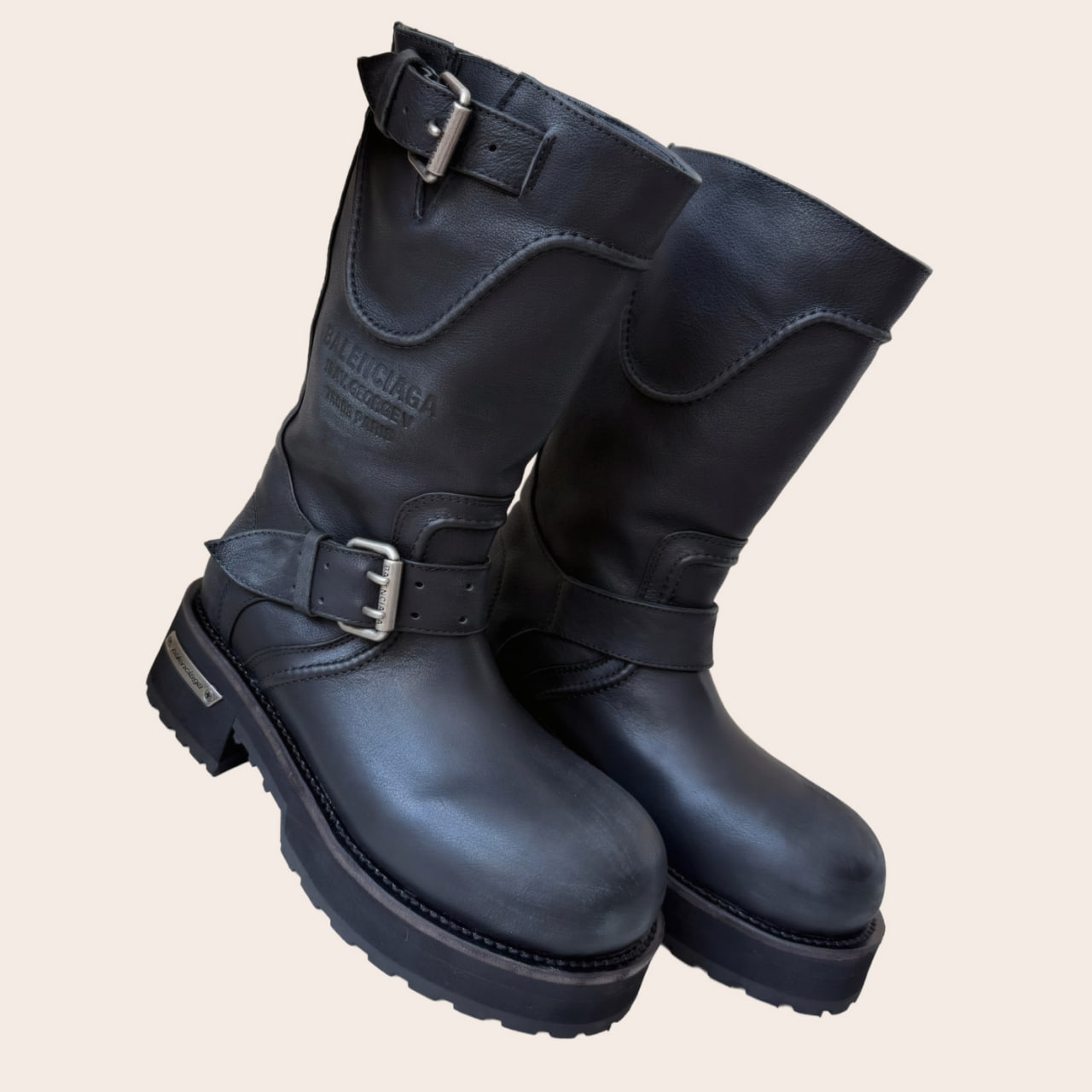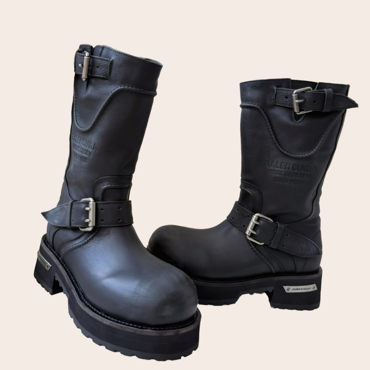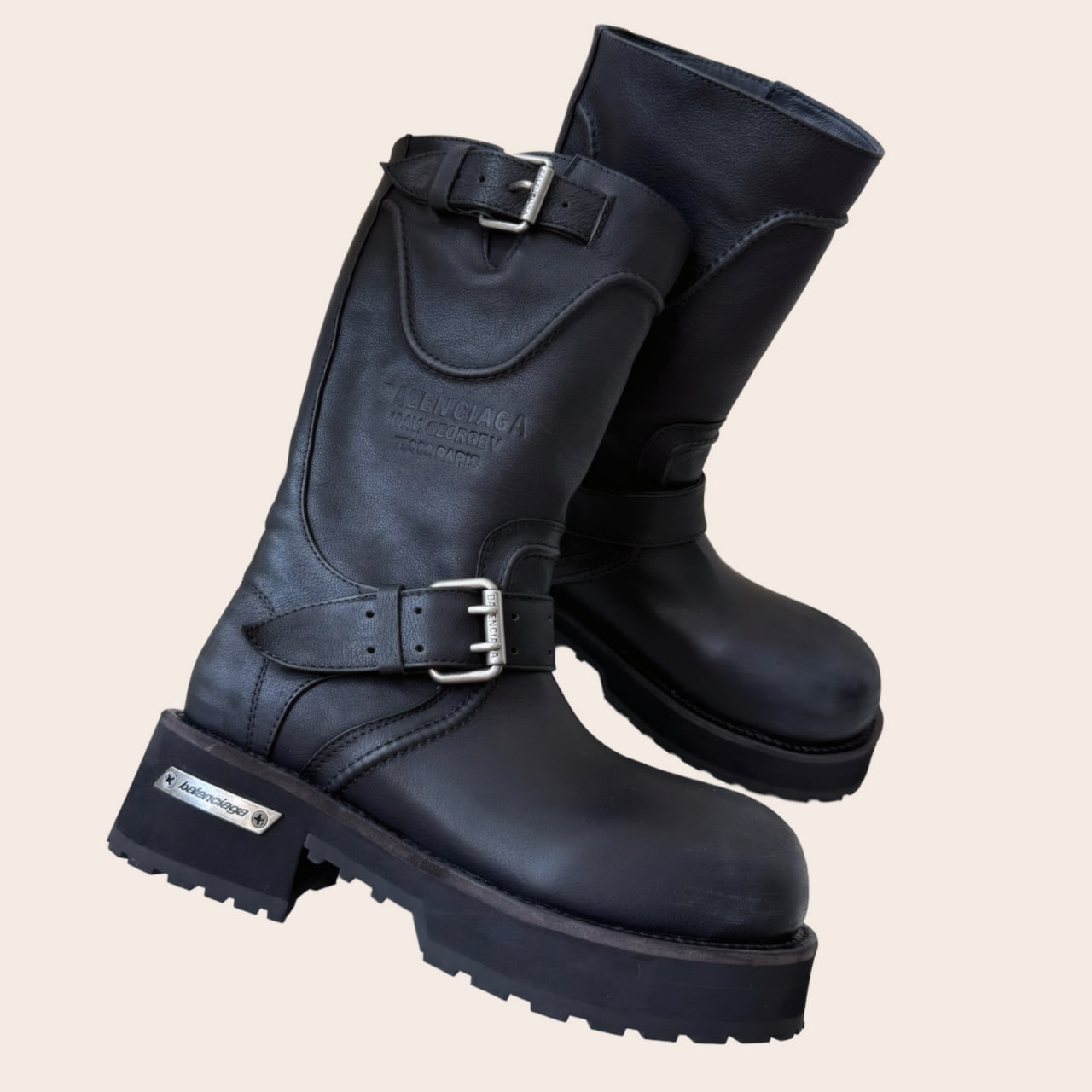 Кожаные армейские ботинки Venom от Balenciaga воплощают смелую эстетику бренда благодаря пряжкам, массивной подошве и металлическим табличкам с логотипом. Их поношенный дизайн отличается свободным силуэтом и деталями с выгравированным логотипом.