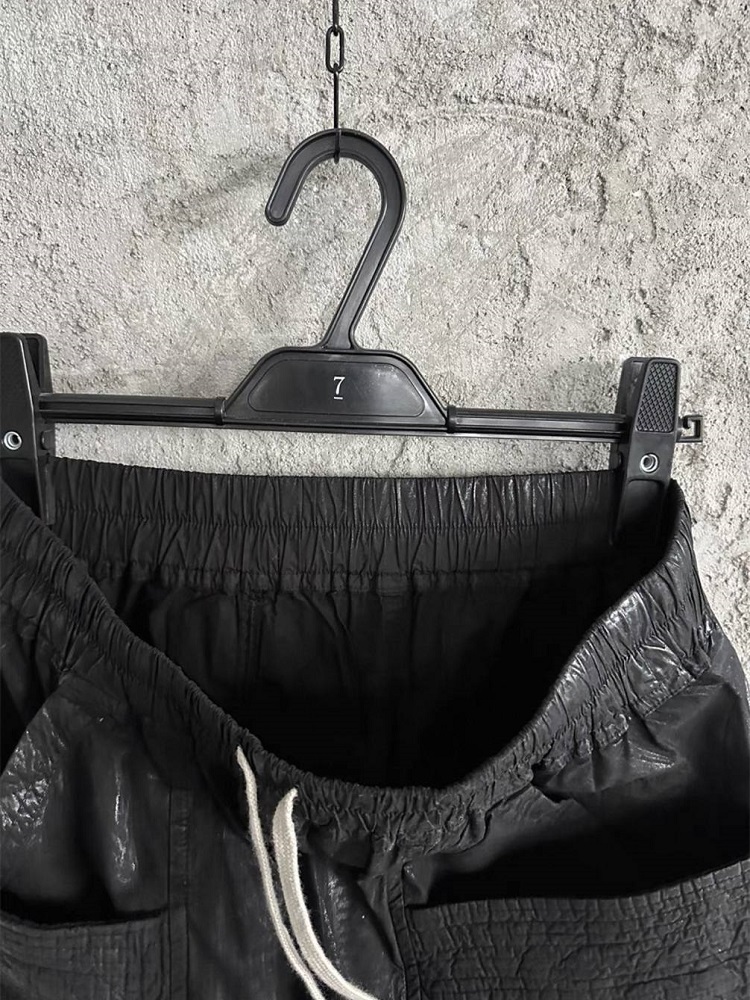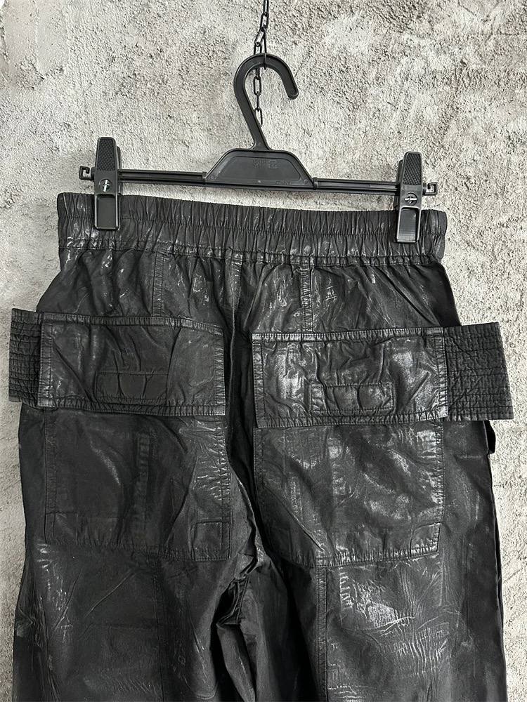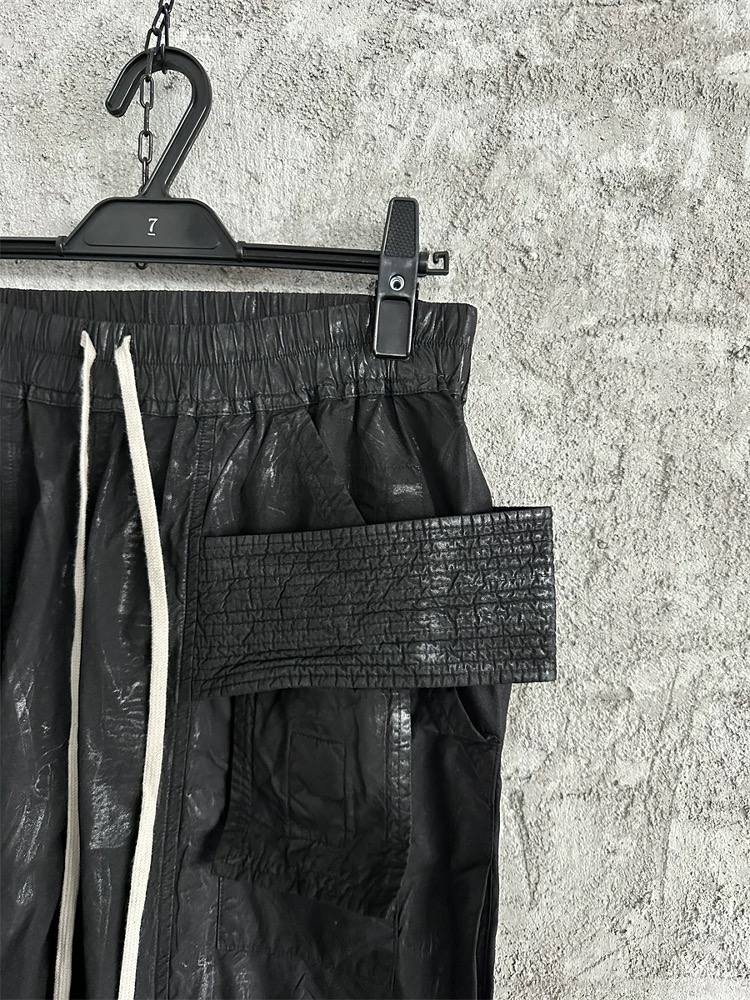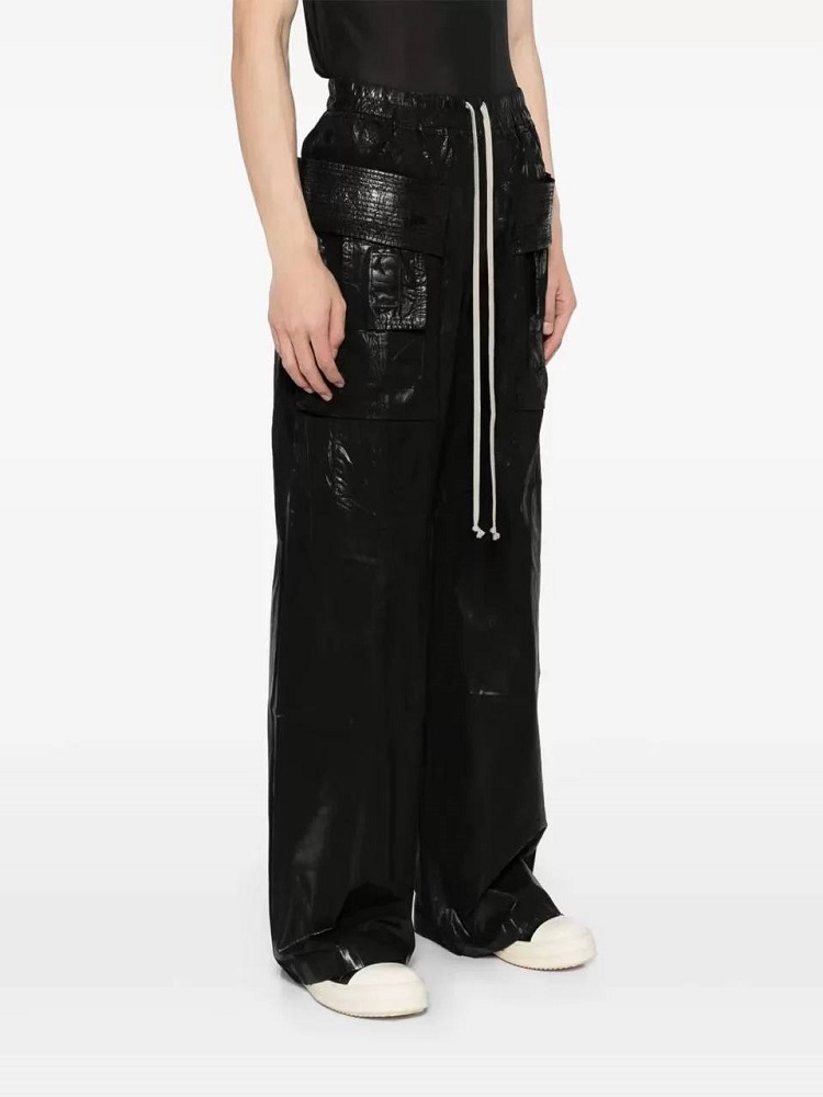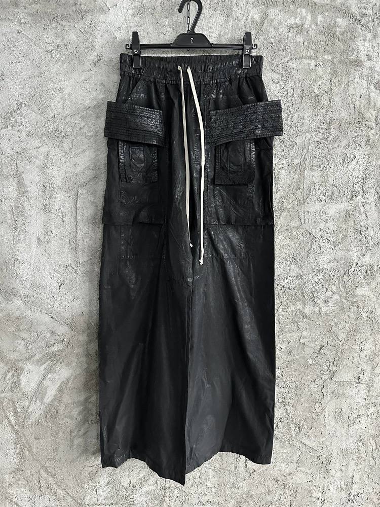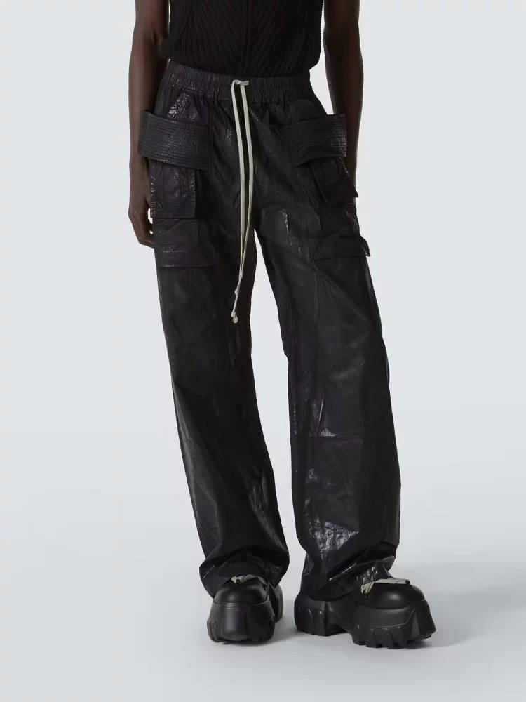 Брюки-карго Рика Оуэнса имеют блестящую отделку и струящуюся драпировку, поэтому они кажутся более возвышенным вариантом утилитарных стилей. Они имеют драматичные завязки на талии и ниспадают до широких штанин.