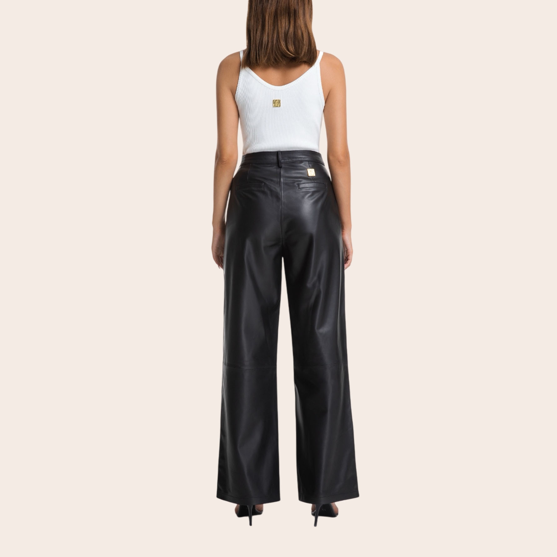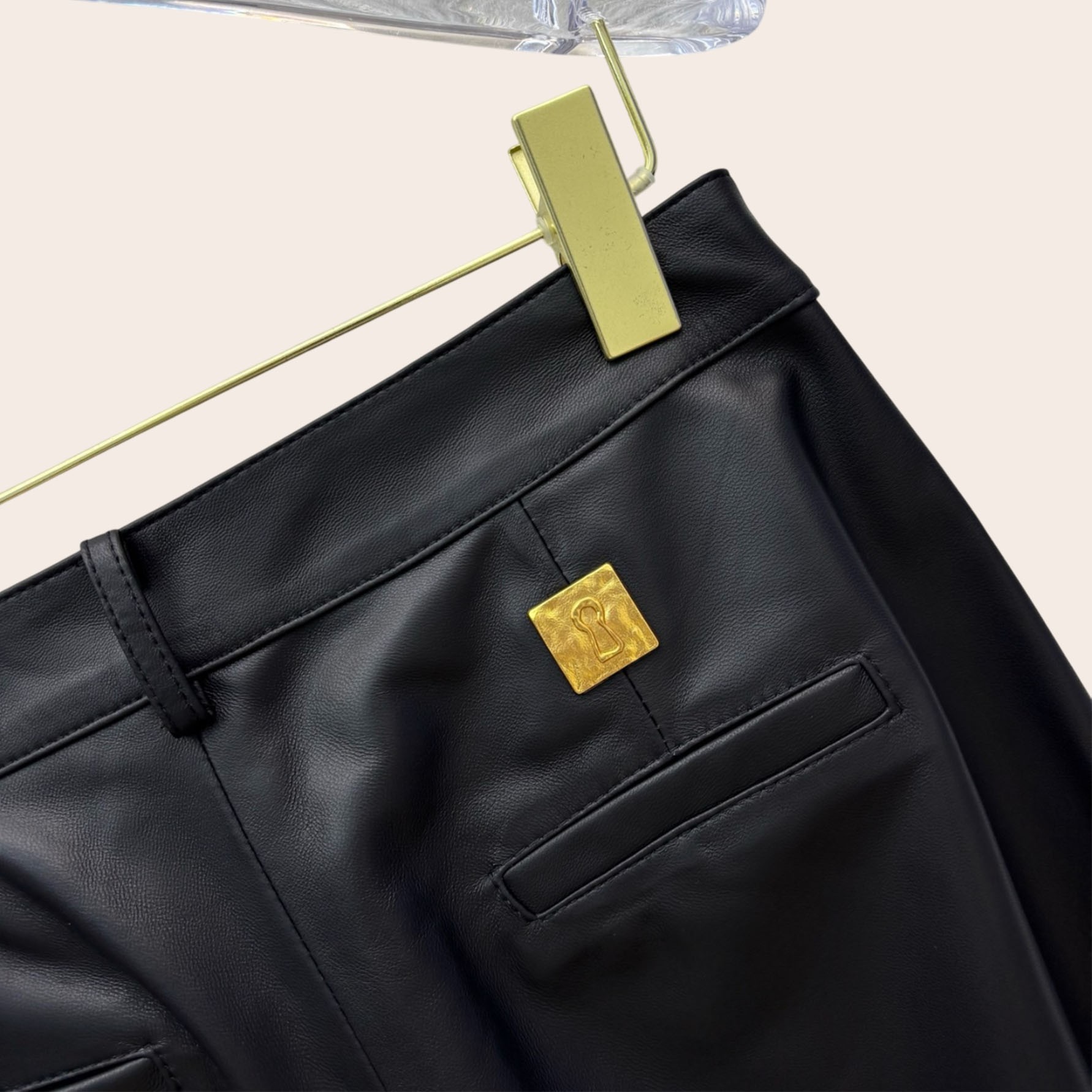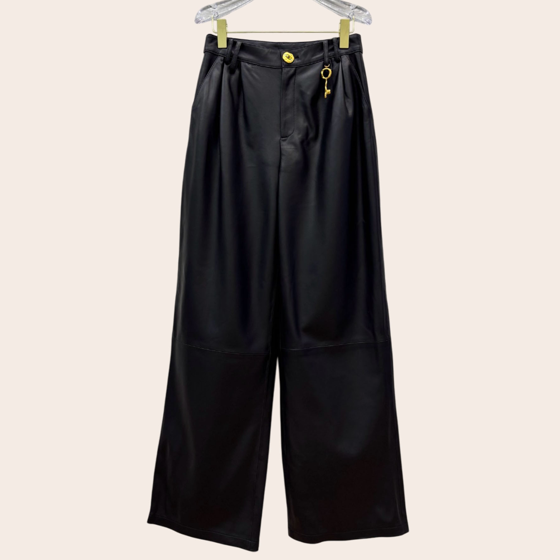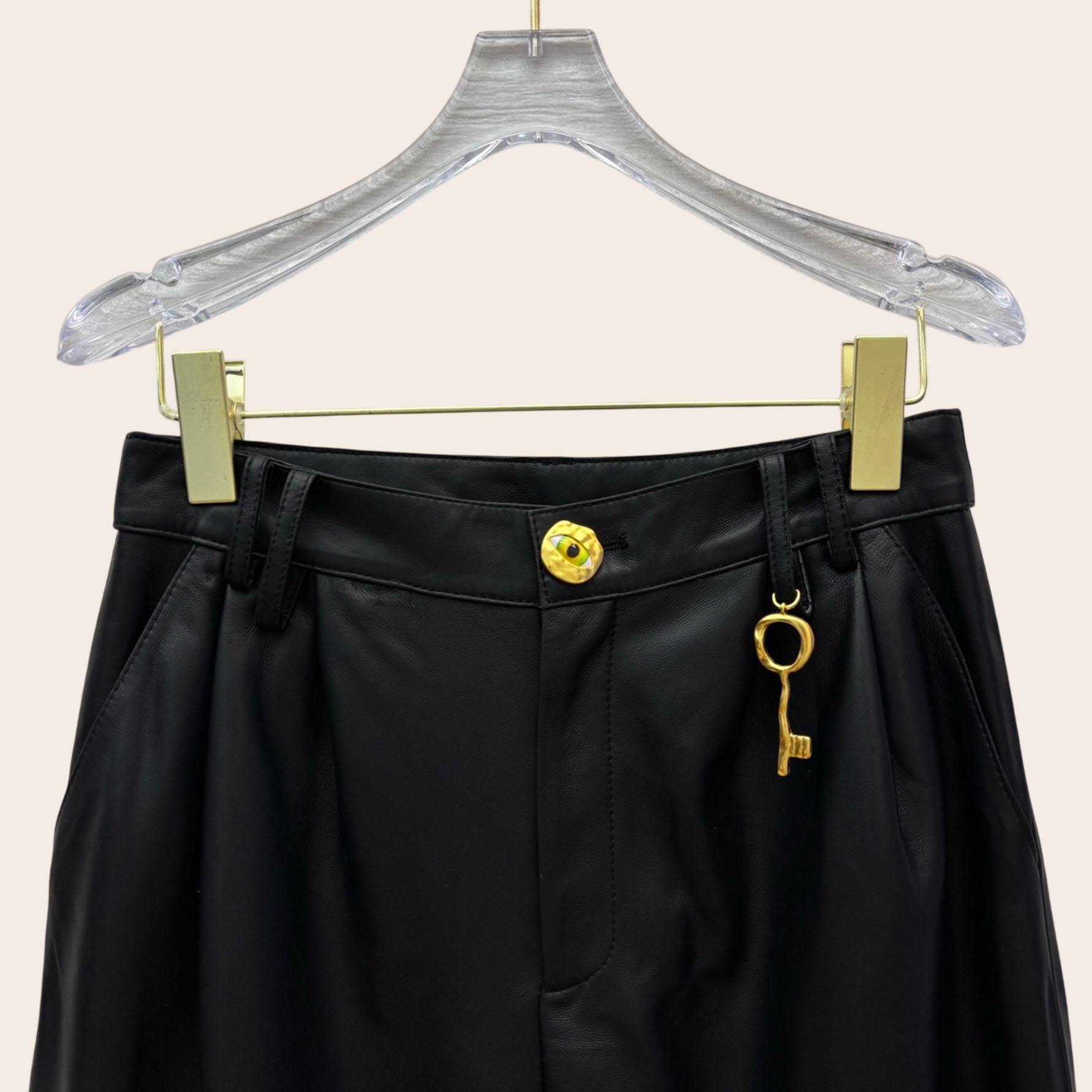 Брюки Schiaparelli выполнены из натуральной кожи. Широкие брюки с завышенной талией украшены золотой большой пуговицей и замком на талии.