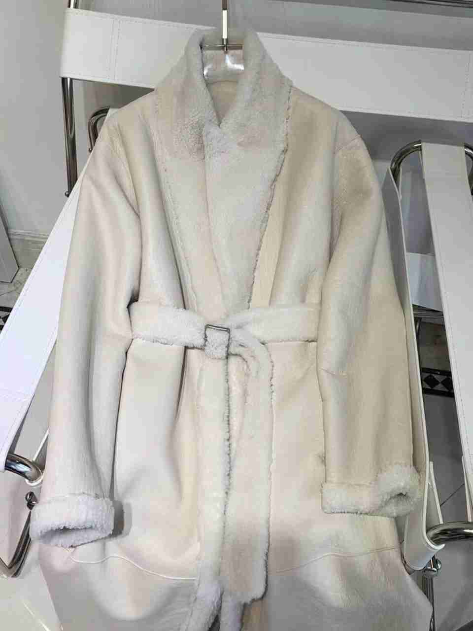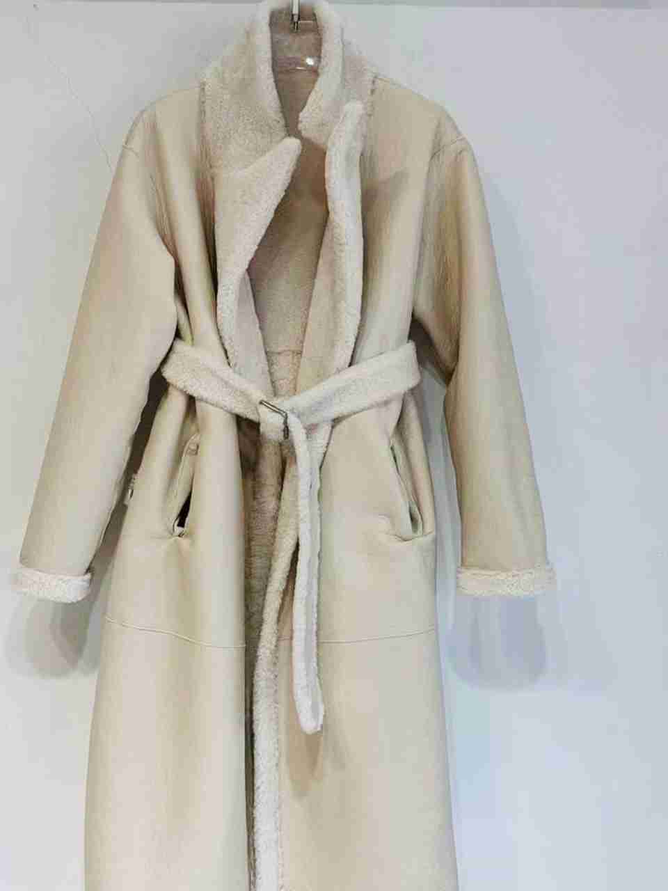 Дублёнка двусторонняя из осенне-зимней коллекции бренда. Натуральная кожа с одной стороны, вторая сторона представлена коротковорсовым и густым мехом овчины, заостренные лацканы, благодаря поясу в тон изделия можно создать приталенный силуэт, два прорезных кармана спереди, длинный рукав, контуры изделия обрамлены белым мехом, застегивается при помощи пояса. Вы можете купить дублёнку двустороннюю и носить ее в зависимости от погоды ворсовой стороной наружу или же кожаной.