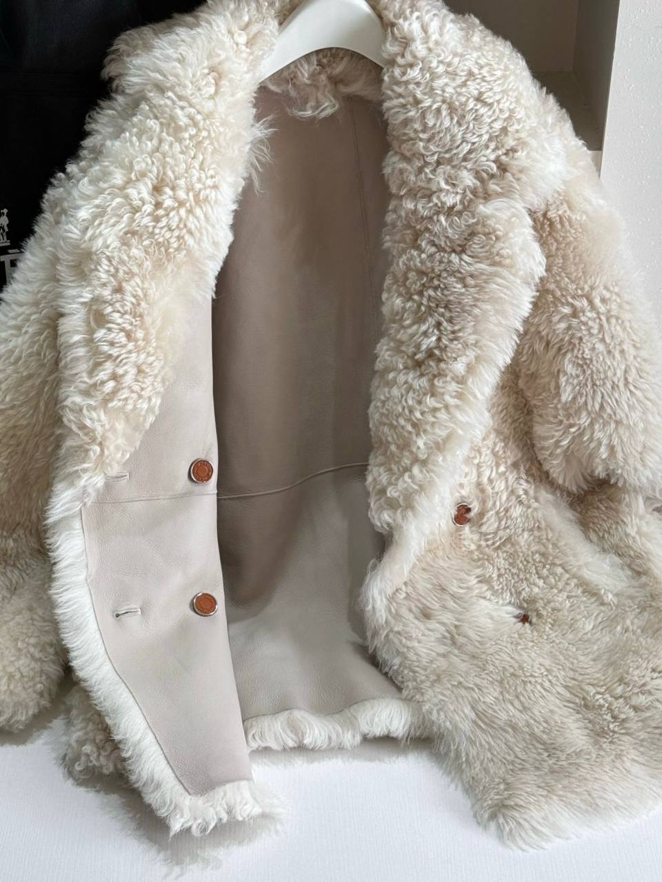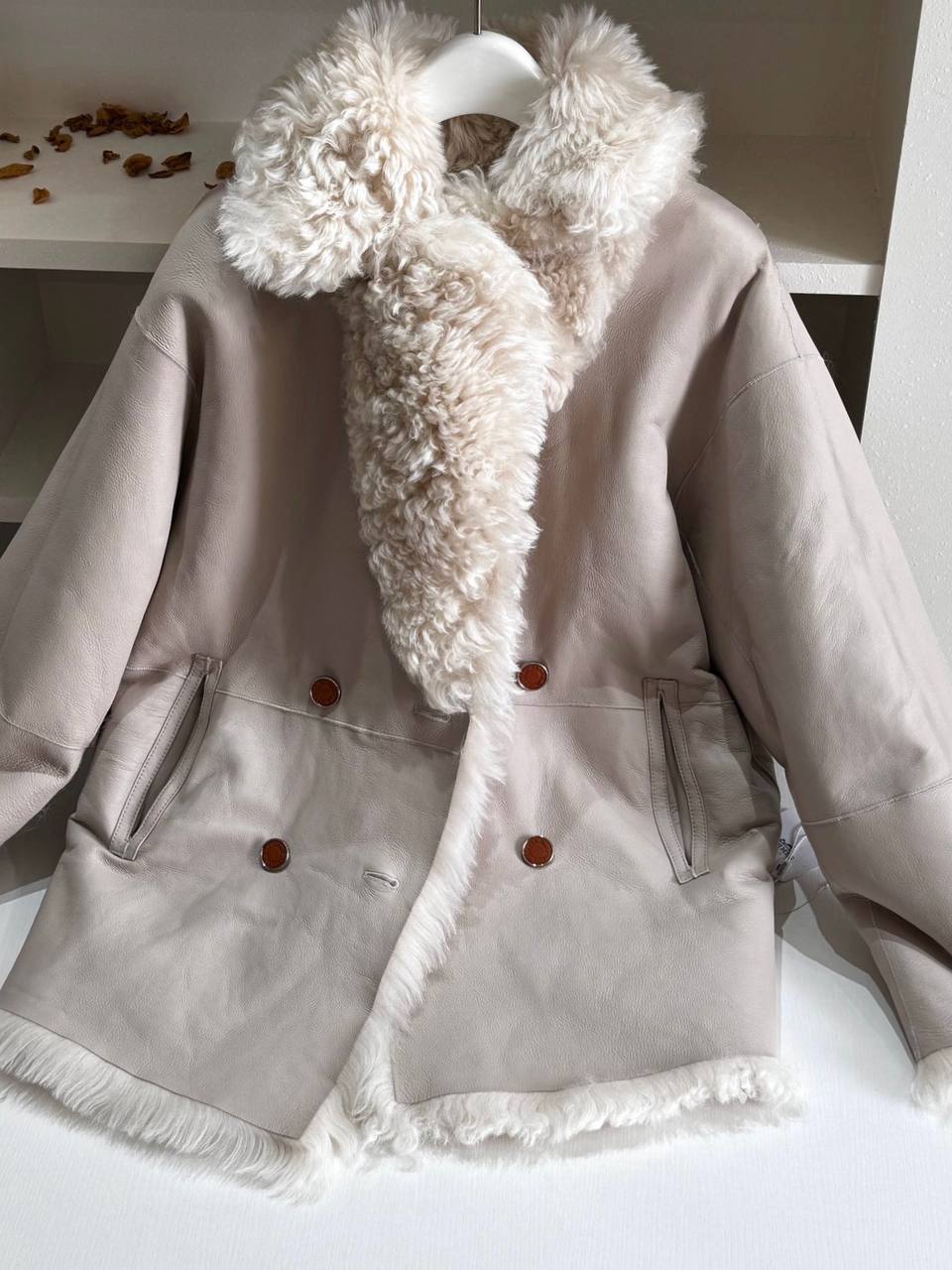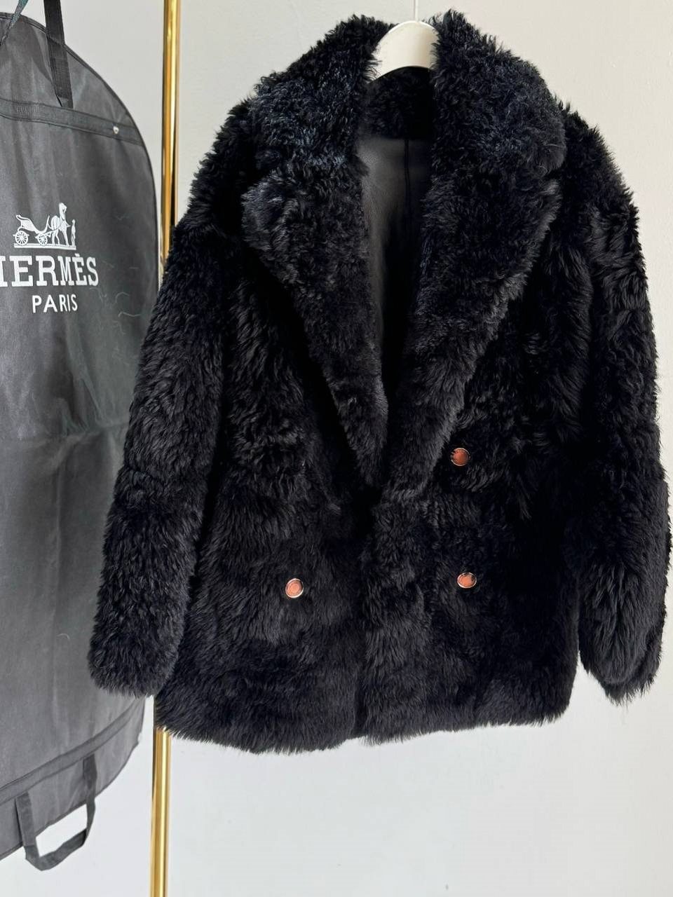 Дублёнка двусторонняя Hermes сделана из натуральной кожи и овчины. Данная модель с откидным воротником и карманами украшена золотыми пуговицами. Купить дубленку можно в двух цветах: молочный, черный.