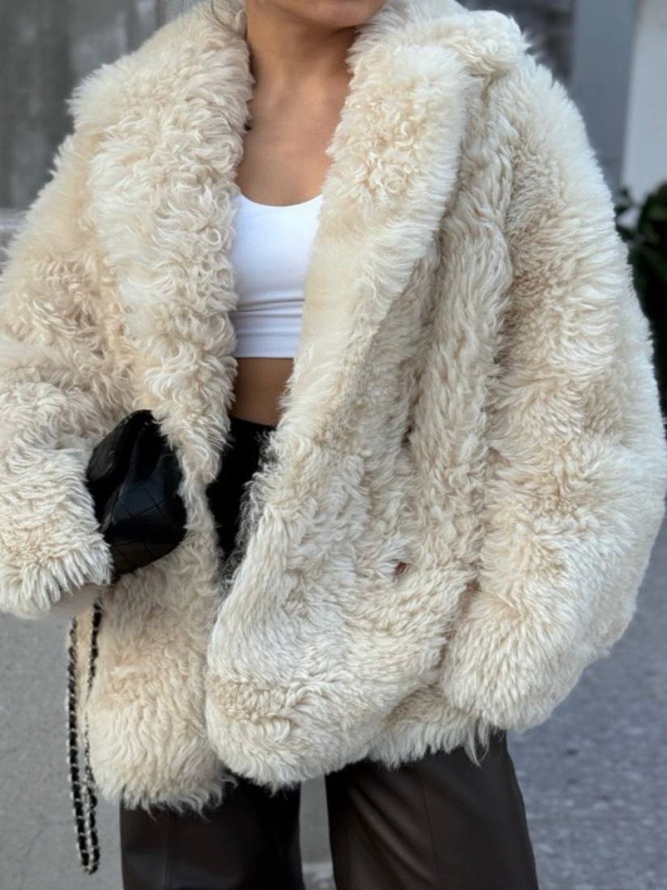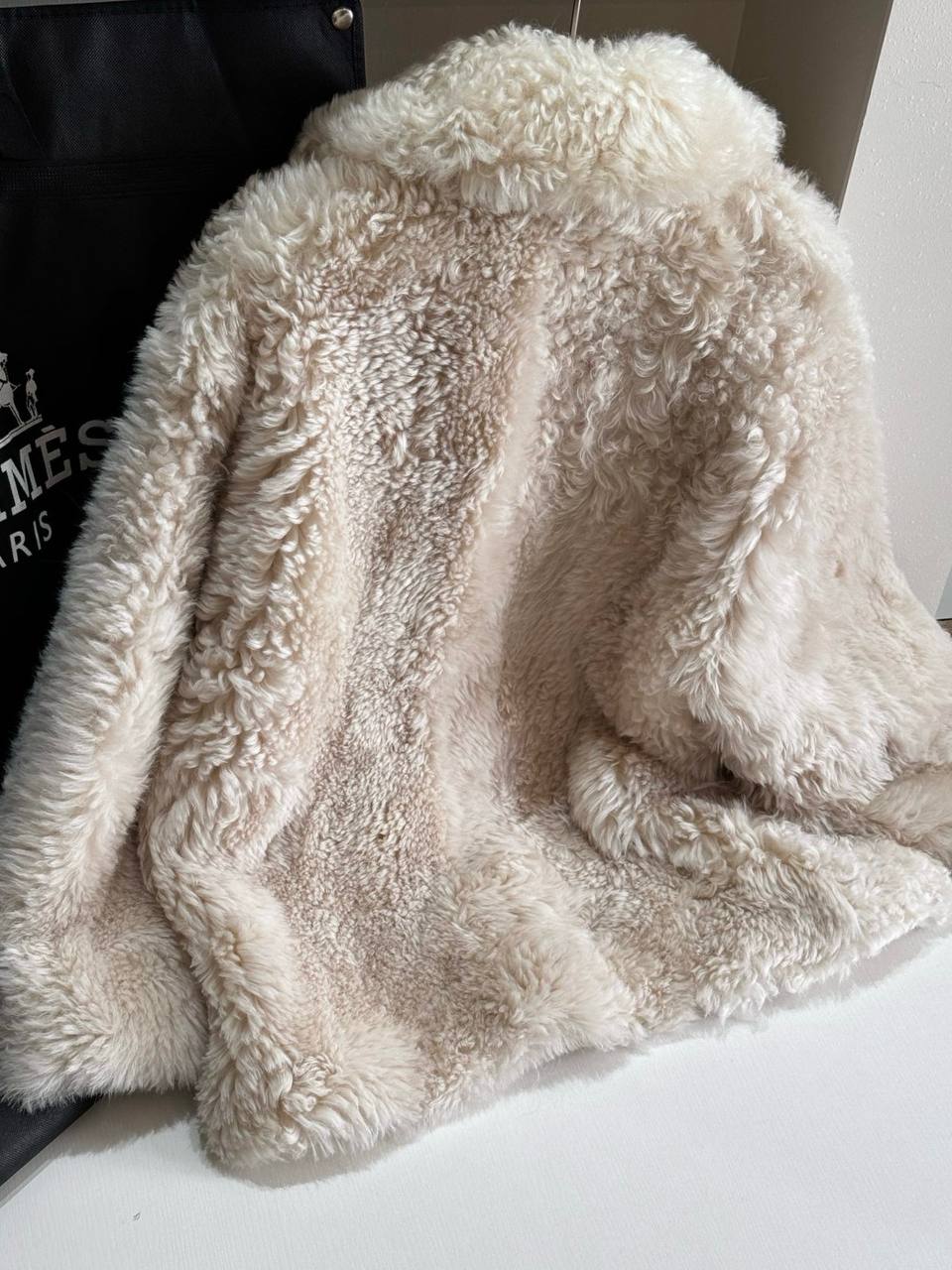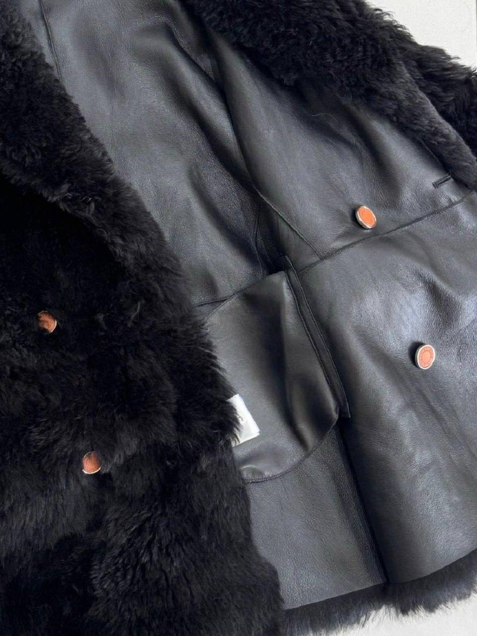 Дублёнка двусторонняя Hermes сделана из натуральной кожи и овчины. Данная модель с откидным воротником и карманами украшена золотыми пуговицами. Купить дубленку можно в двух цветах: молочный, черный.