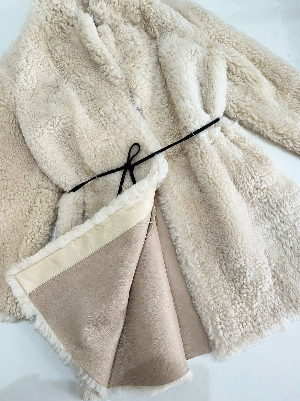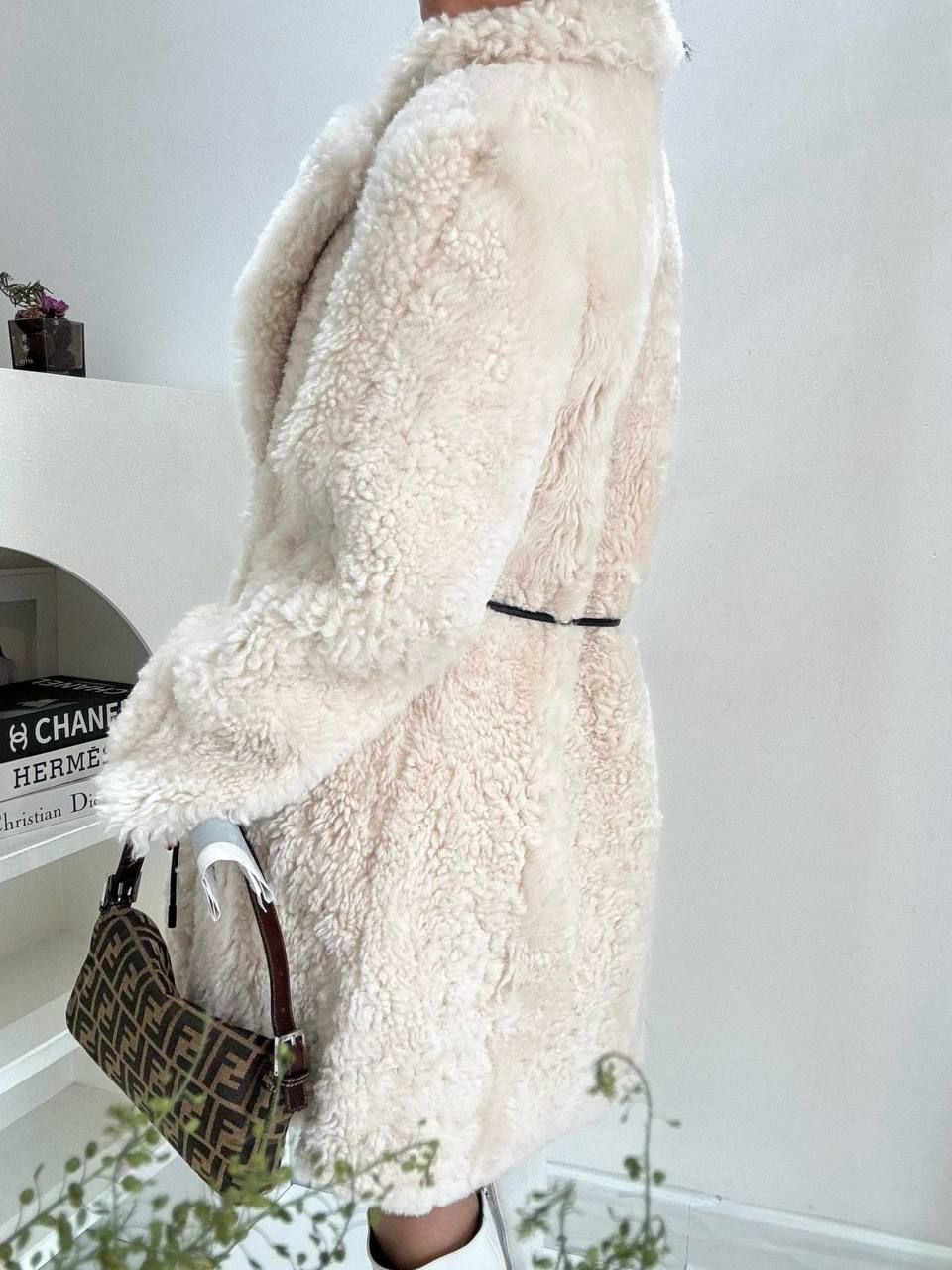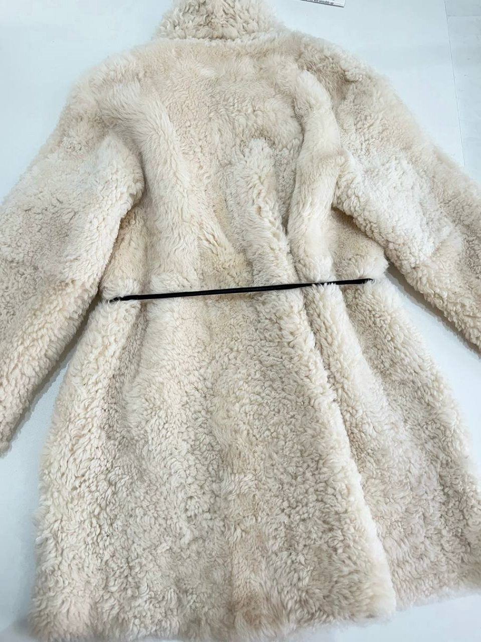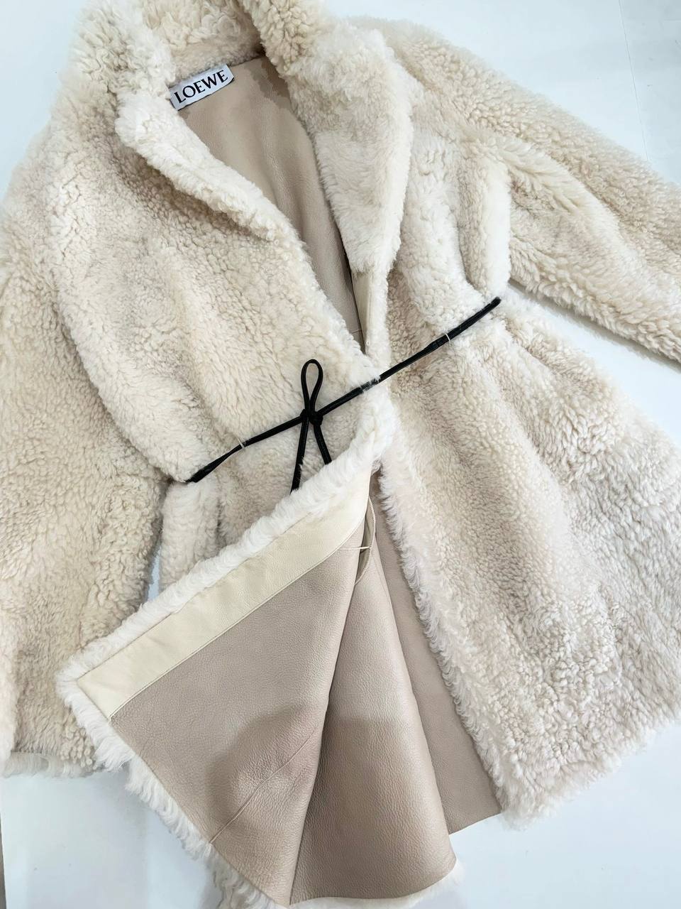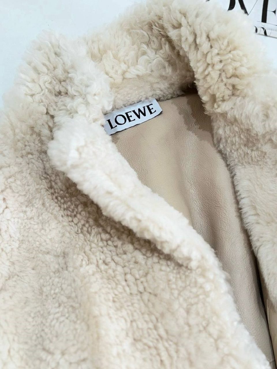 Дублёнка Loewe сделана из натуральной кожи и овчины в молочном цвете. Данная модель с воротником и скрытыми карманами, украшена черным ремешком на талии. Купив дубленку вы дополните свой образ.