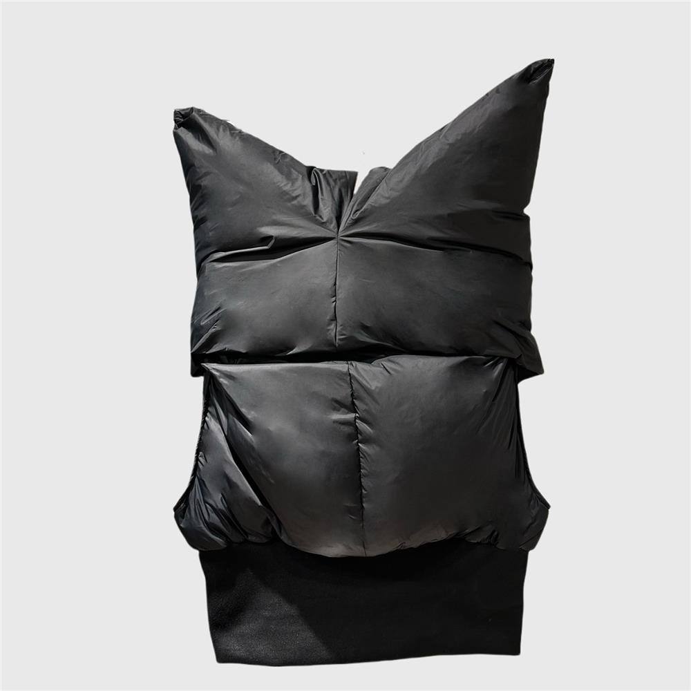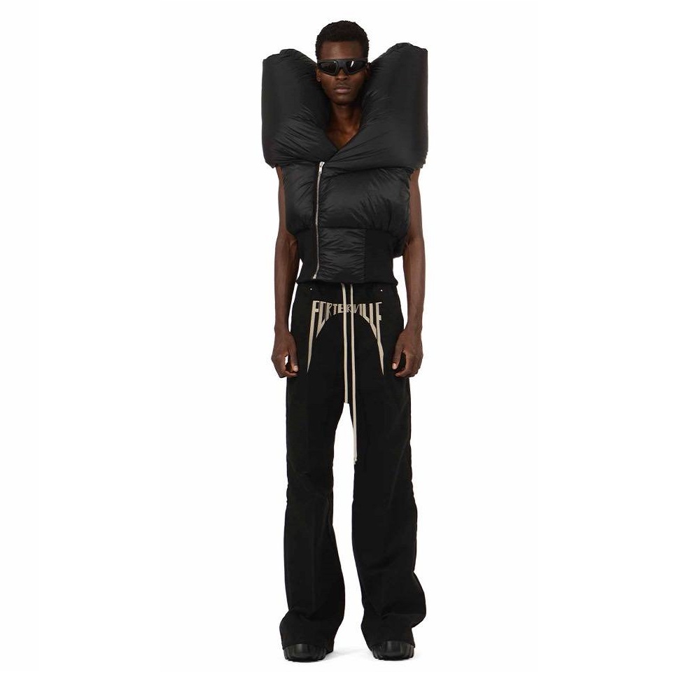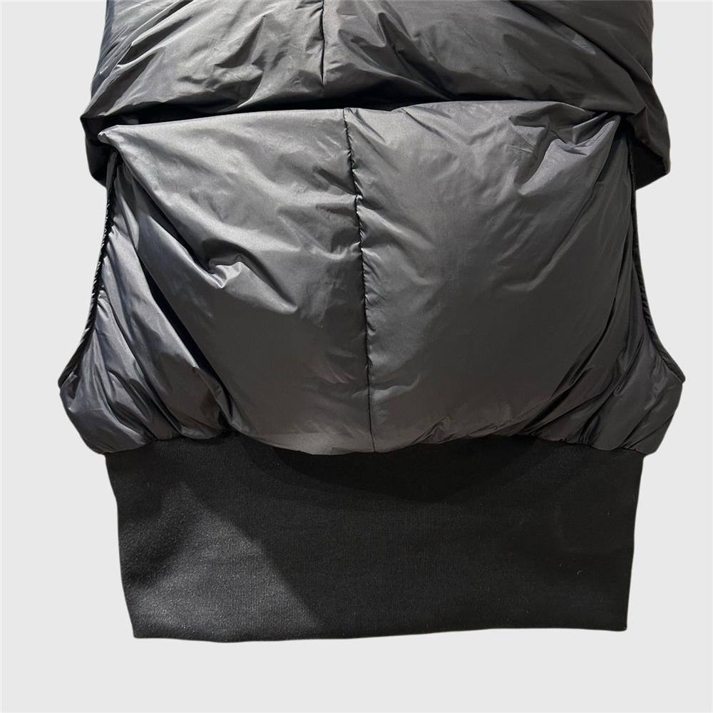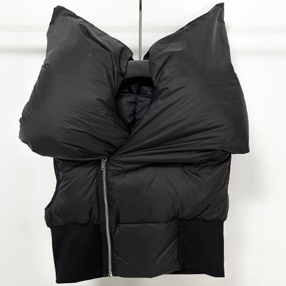 Дутый жилет Rick Owens с наполнителем пух перо. Данная модель с высоким большим воротником, застегивается на молнии, внизу широкая резинка. Купив жилет вы дополните свой образ.