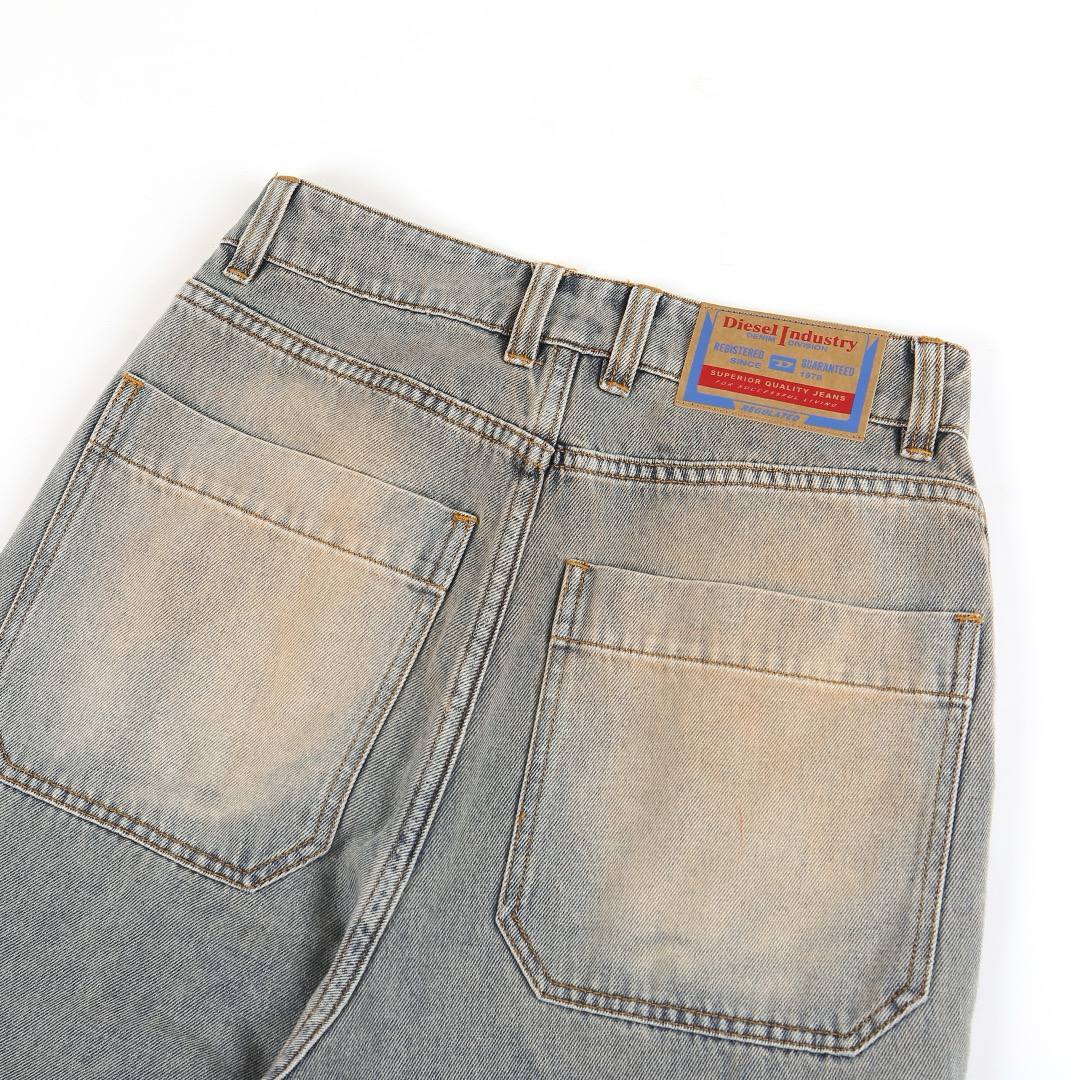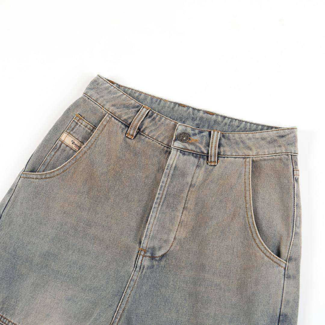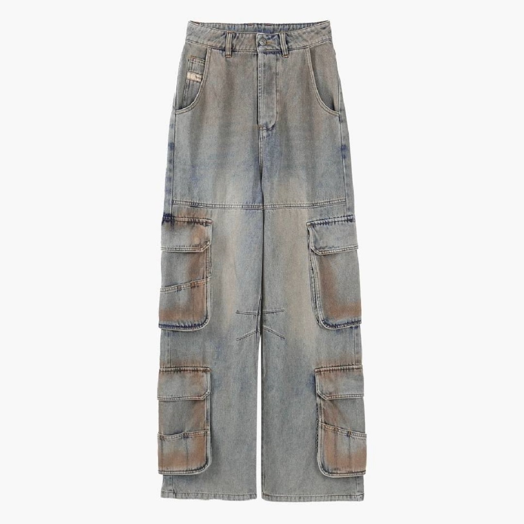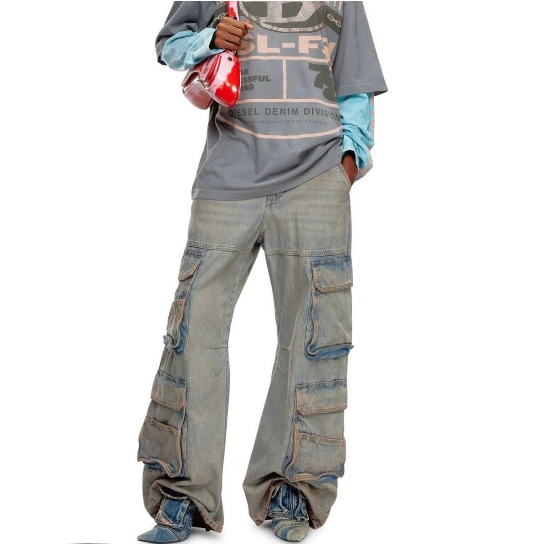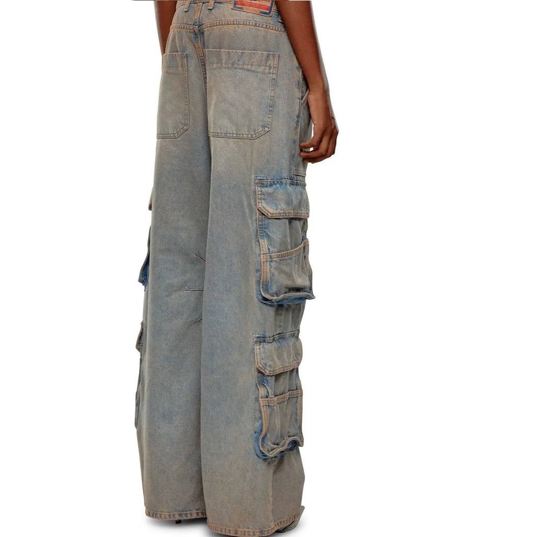 Эти голубые джинсы сшиты с накладными карманами. Широкий пояс для комфортной посадки, а чтобы движения не были скованы они сшиты в свободном силуэте.