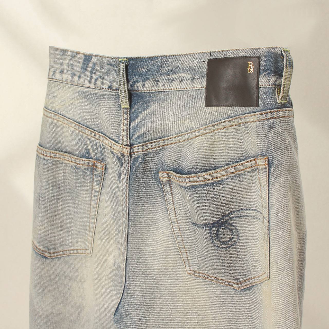 Светлые джинсы R13 сделаны из натурального хлопка в голубом цвете. Данная модель средней посадки с большими карманами и необычным расположением пуговицы и молнии впереди.