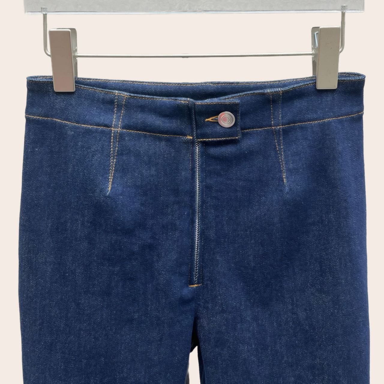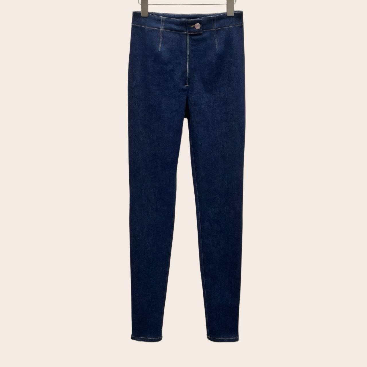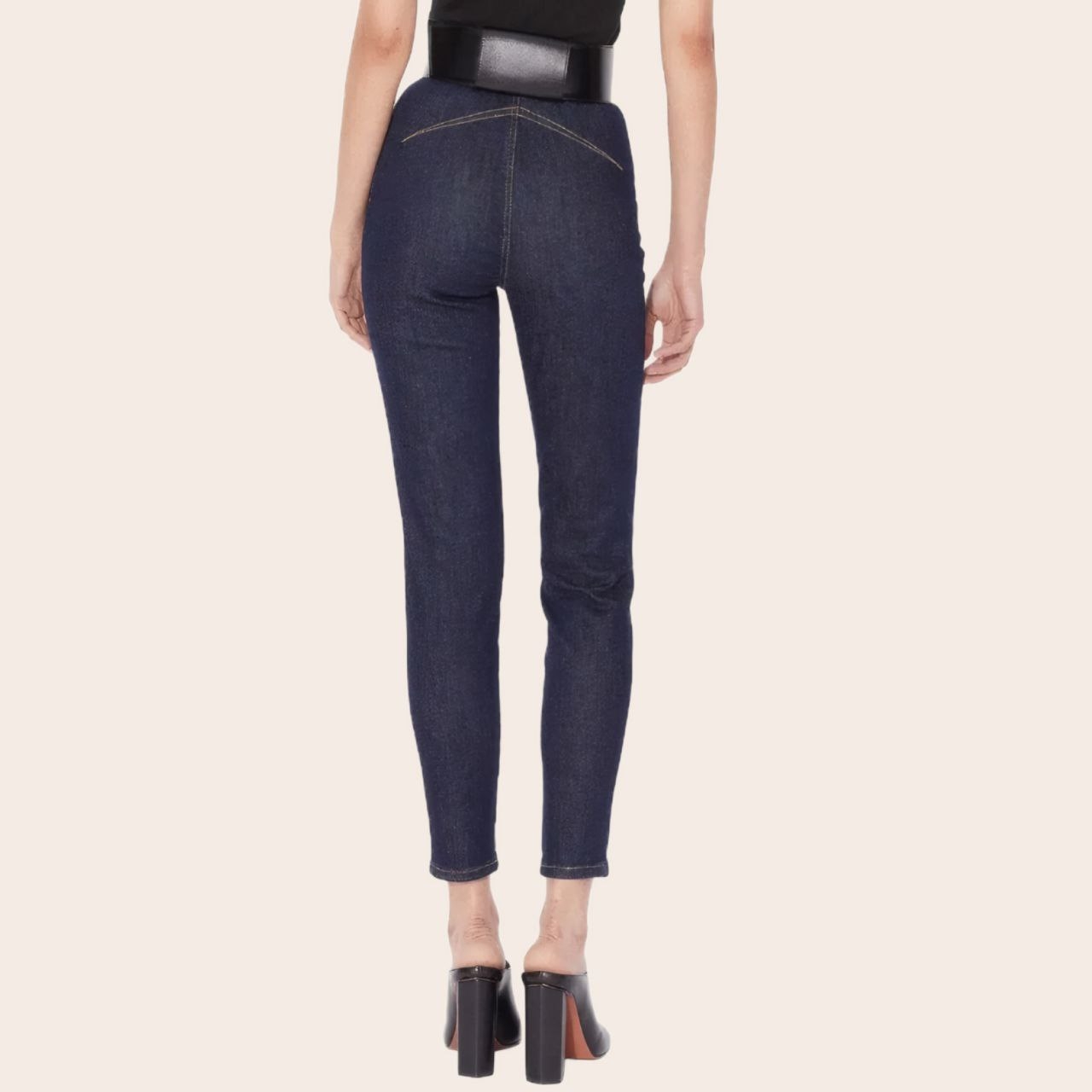 Джинсы Alaia имеют модный зауженный силуэт. Они сшиты из денима синего цвета и имеют уникальные угловатые швы сзади. Носите их с укороченной блузкой или свитером.