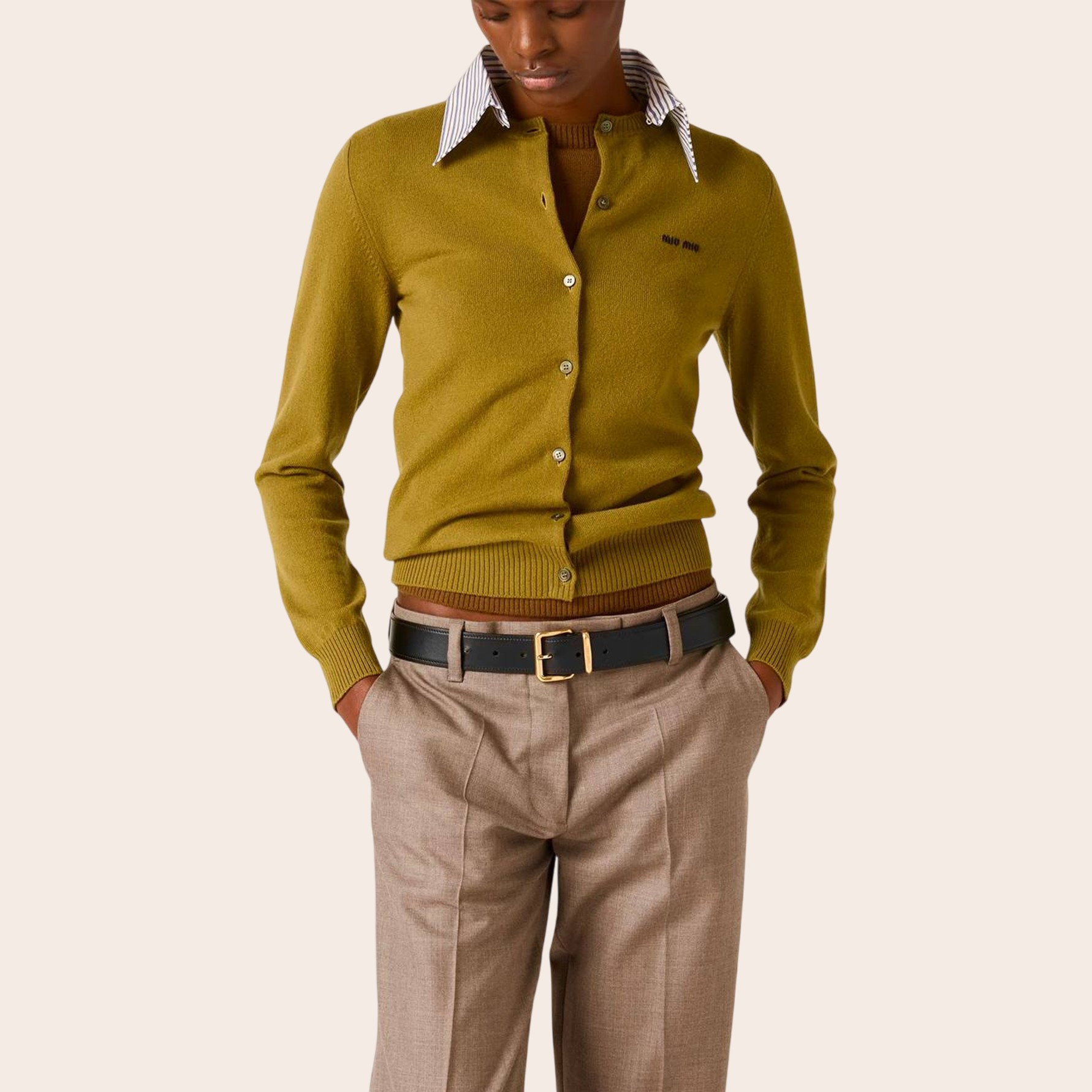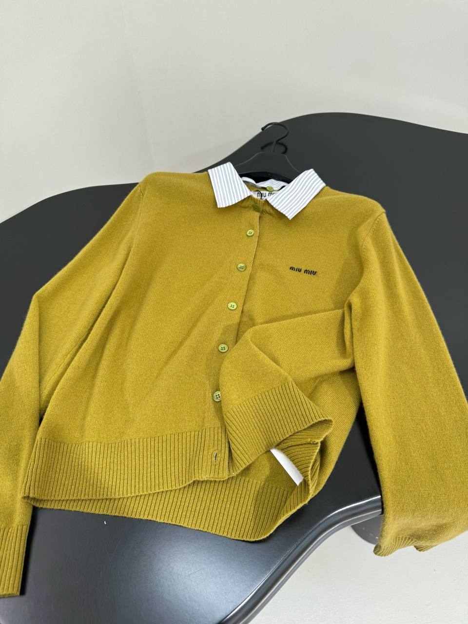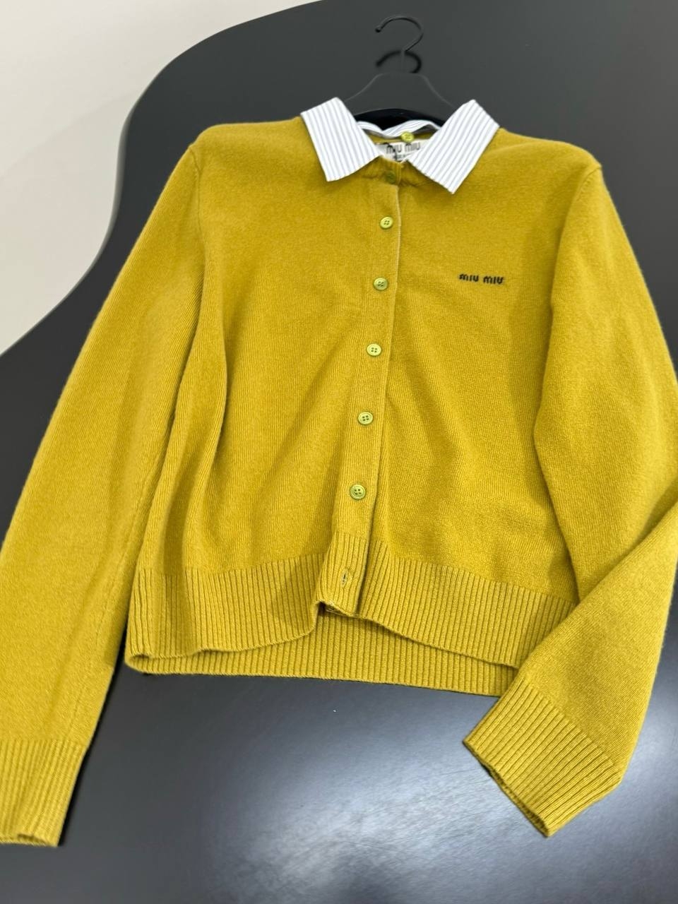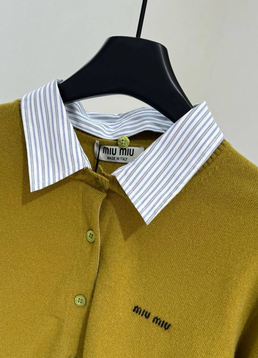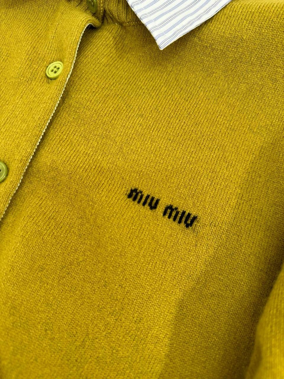 Кардиган Miu Miu выполнен из кашемира. Модель на пуговицах со съемным воротником, манжеты в рубчик. Украшен кардиган вышитым логотипом бренда.