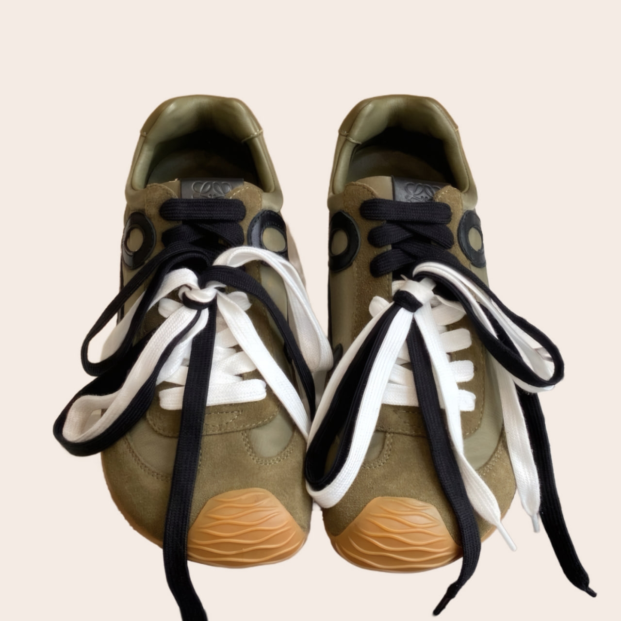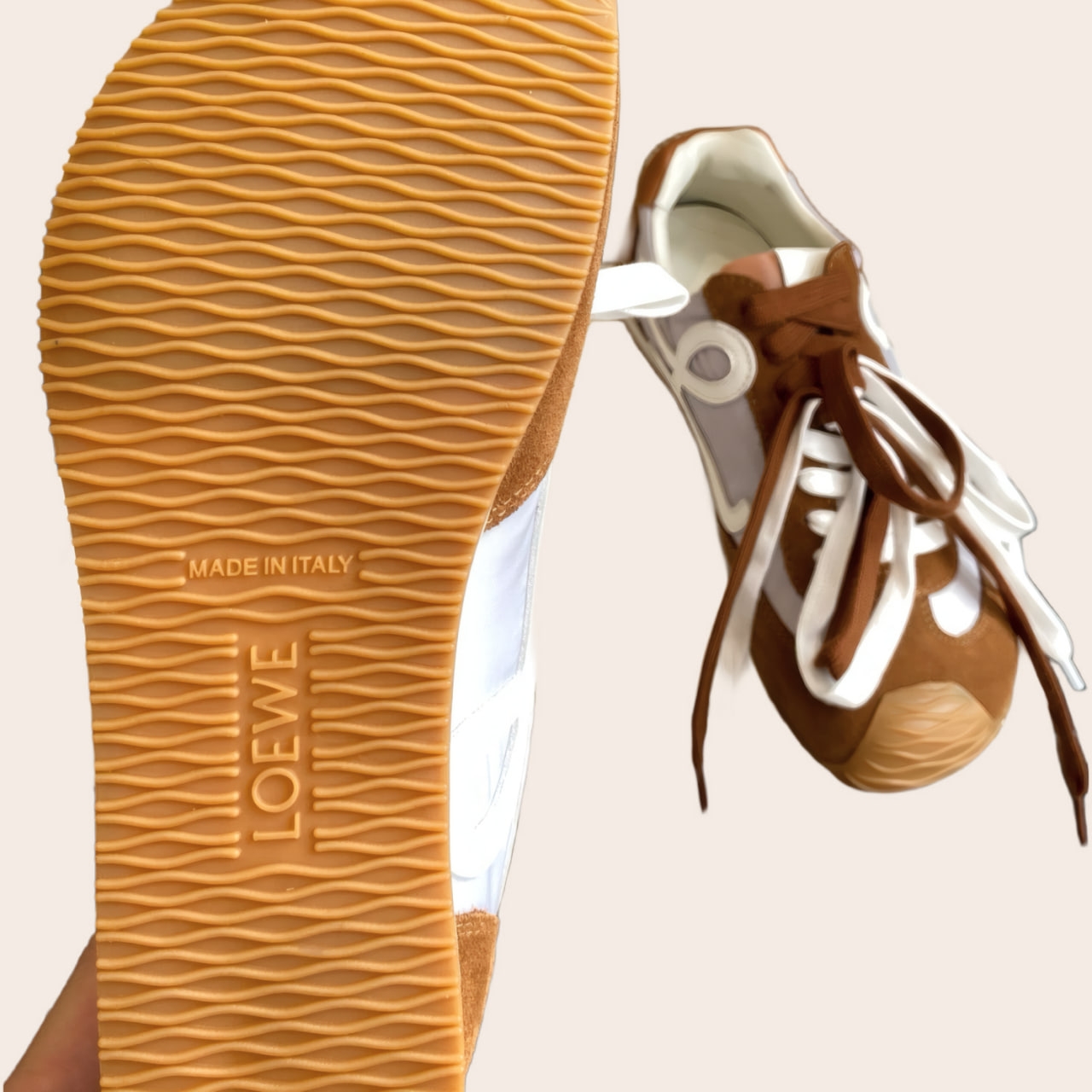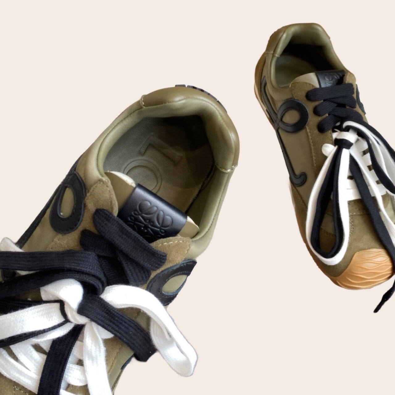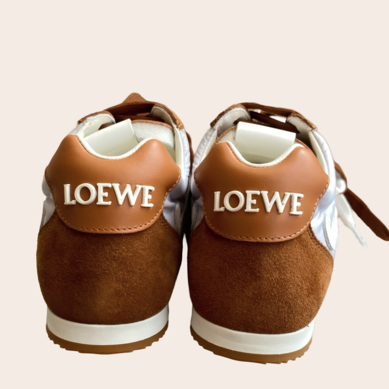 Кроссовки Loewe Runner украшены закрученными аппликациями с изображением эмблемы бренда «Анаграмма». Созданные в стиле ретро, они были изготовлены из кожи и замши с кожаными вставками. Подошва из вспененной резины проходит вдоль носка и пятки.