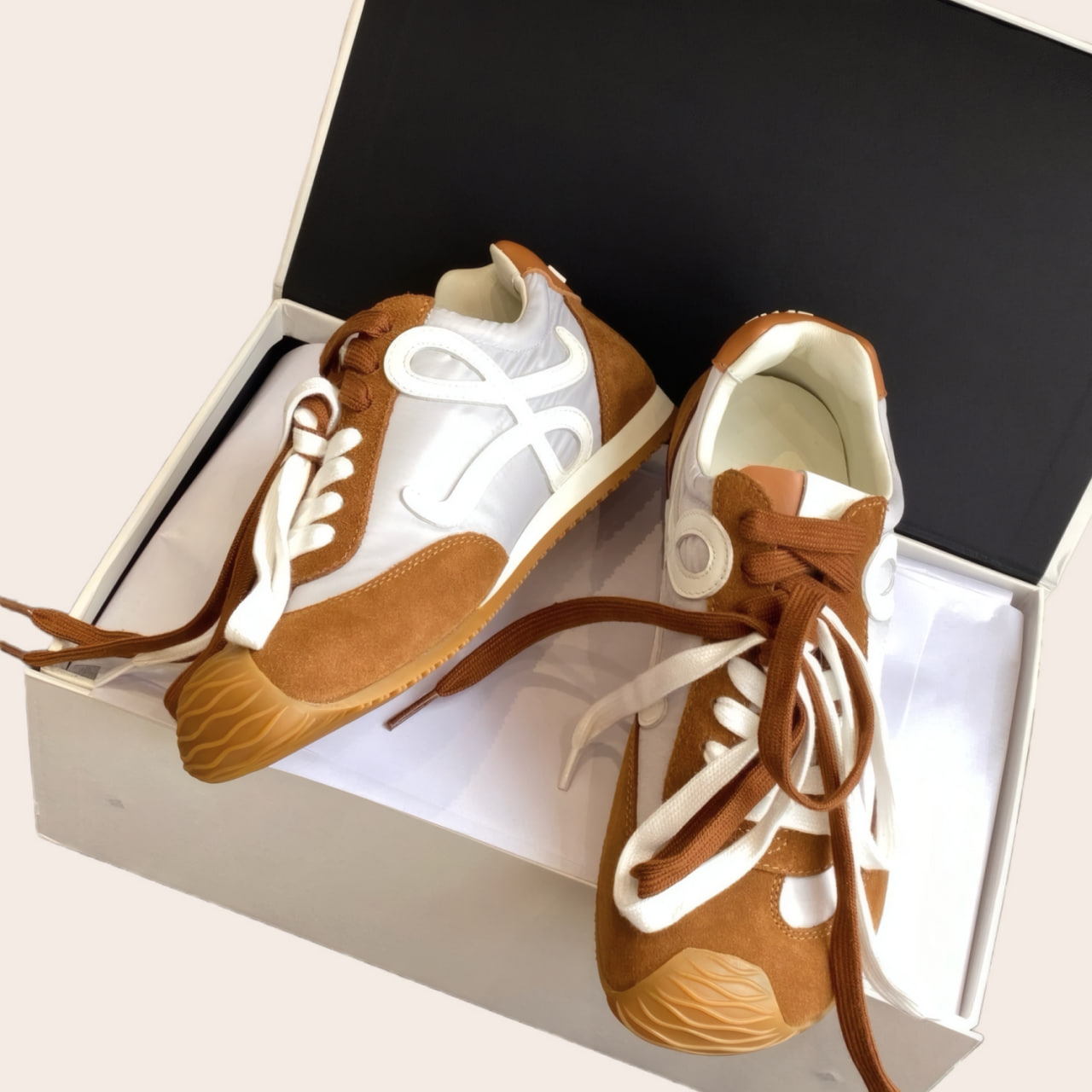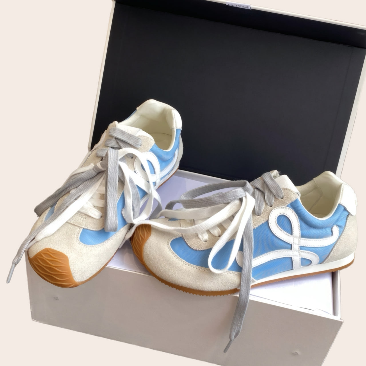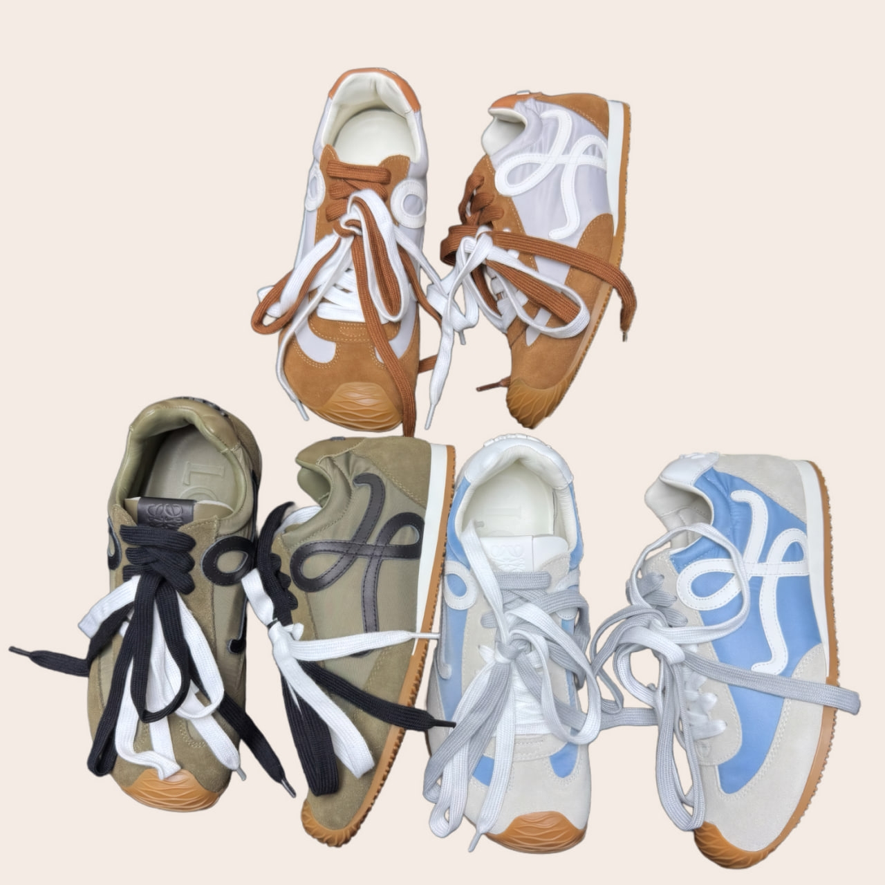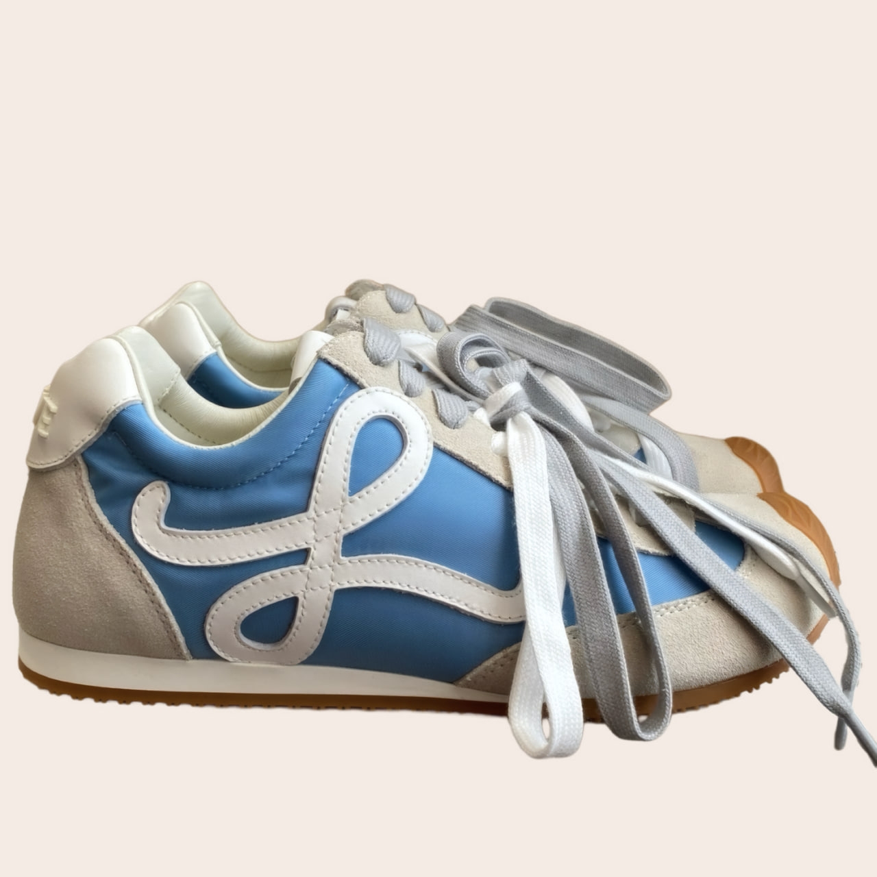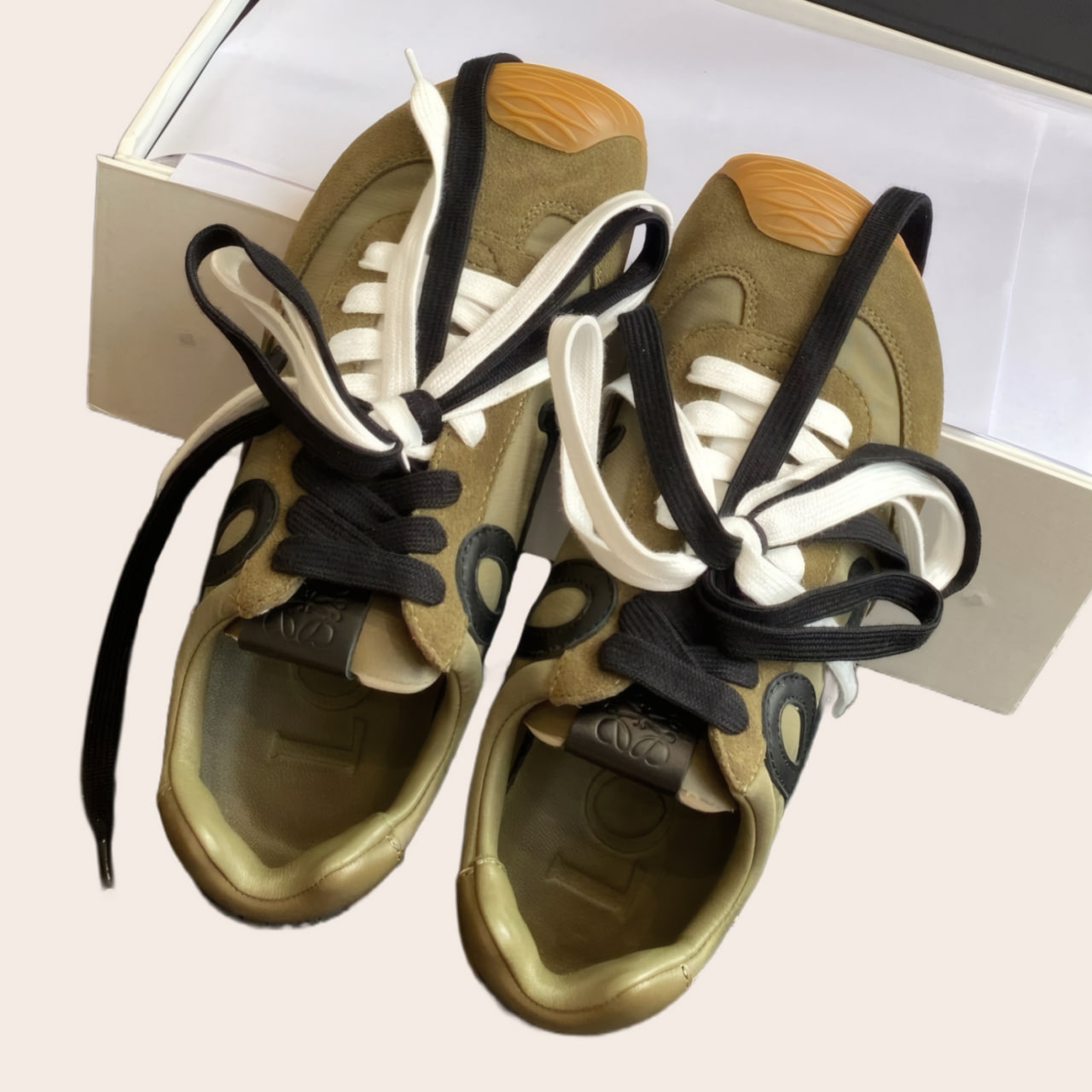 Кроссовки Loewe Runner украшены закрученными аппликациями с изображением эмблемы бренда «Анаграмма». Созданные в стиле ретро, они были изготовлены из кожи и замши с кожаными вставками. Подошва из вспененной резины проходит вдоль носка и пятки.