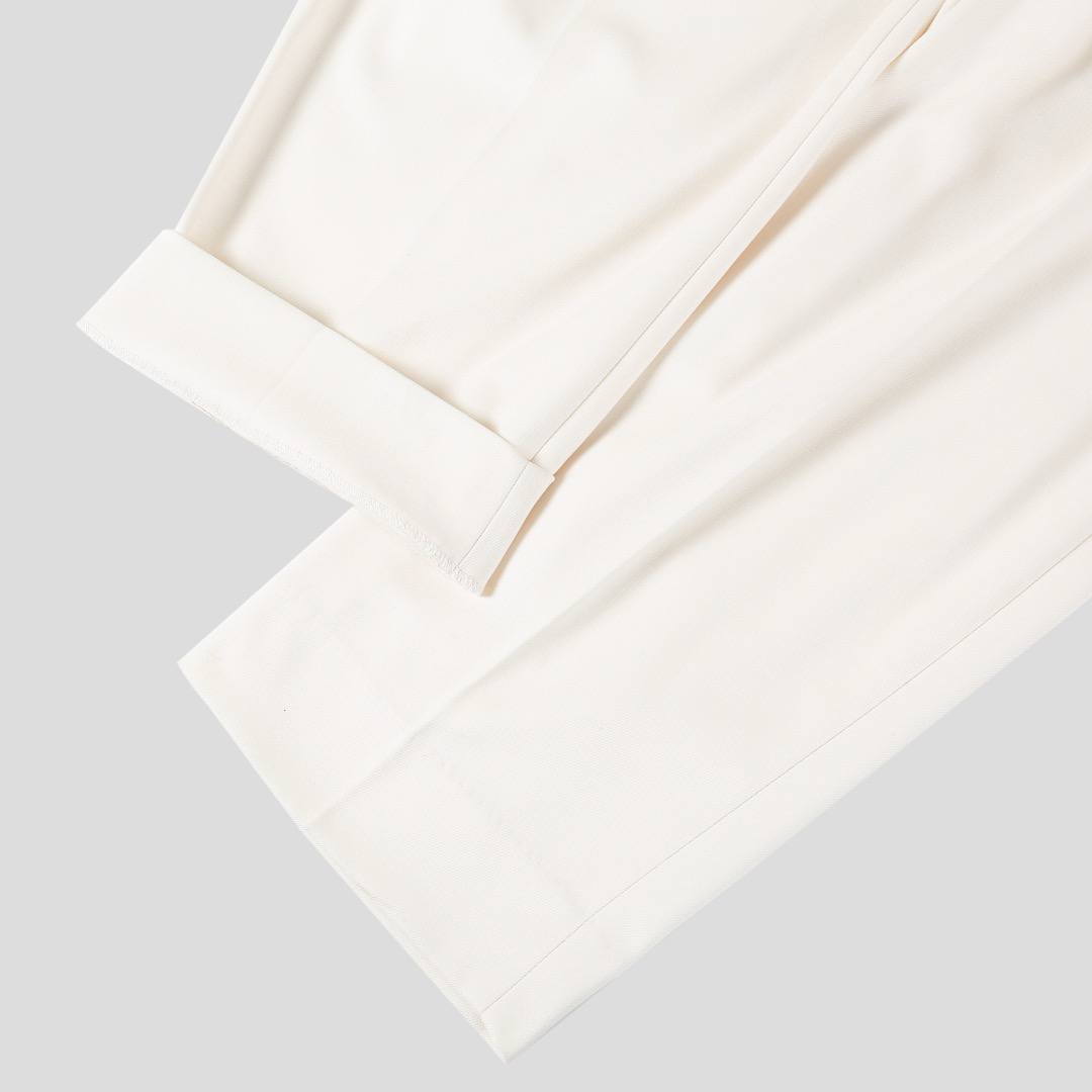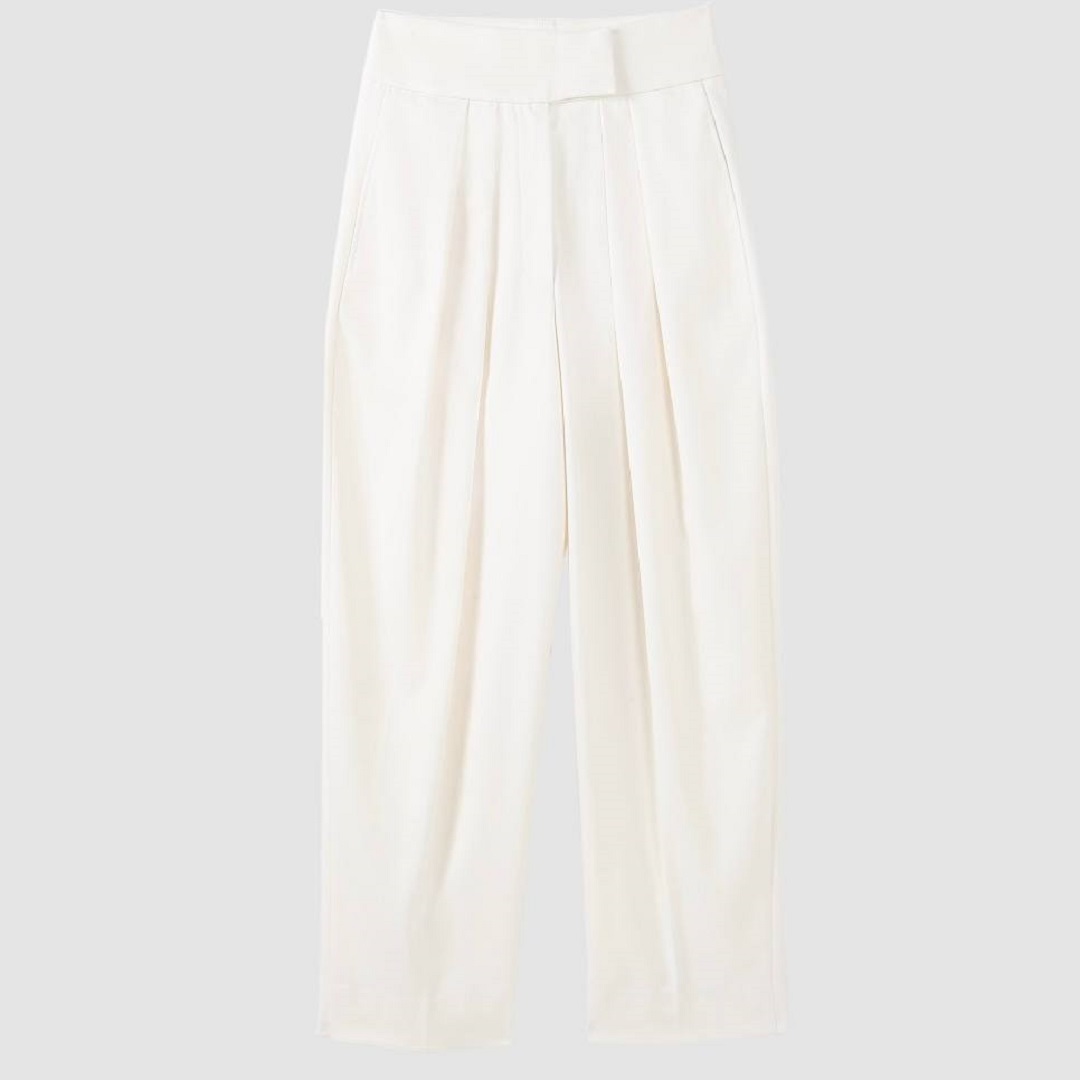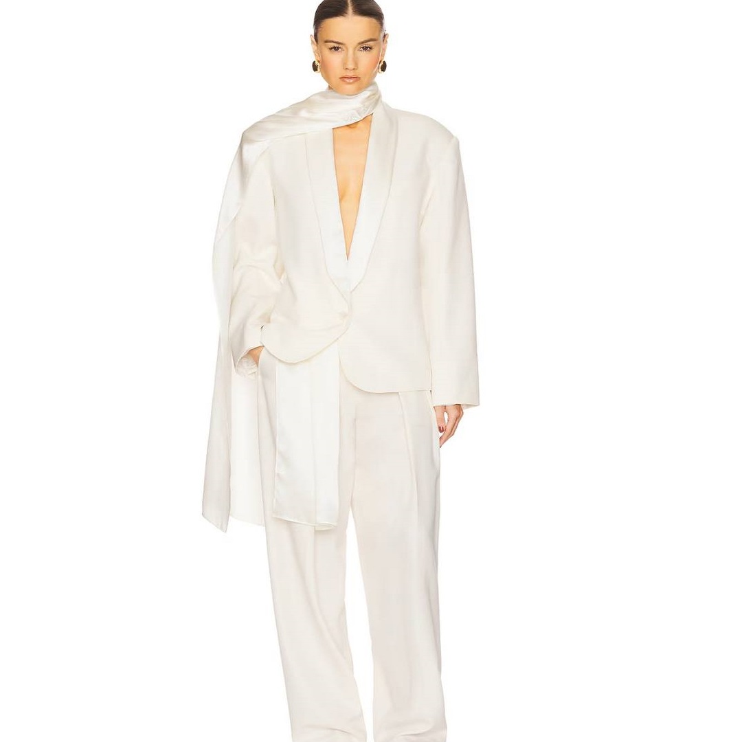 Костюм HELSA выполнен из шелка и шерсти в белом цвете. Он состоит из пиджака и брюк с широким свободным кроем. Носите его с большими сережками и обувью на каблуке.