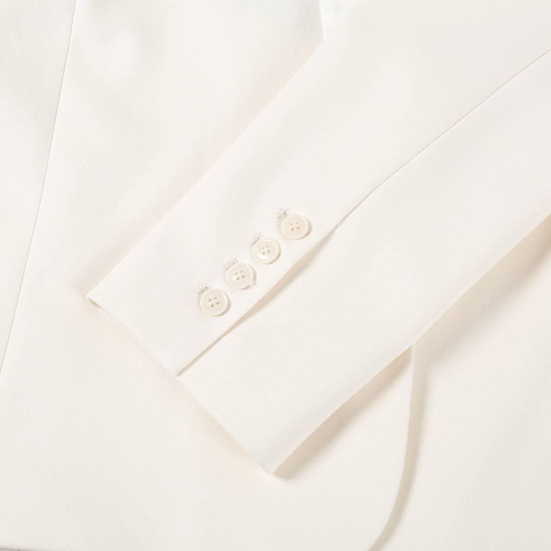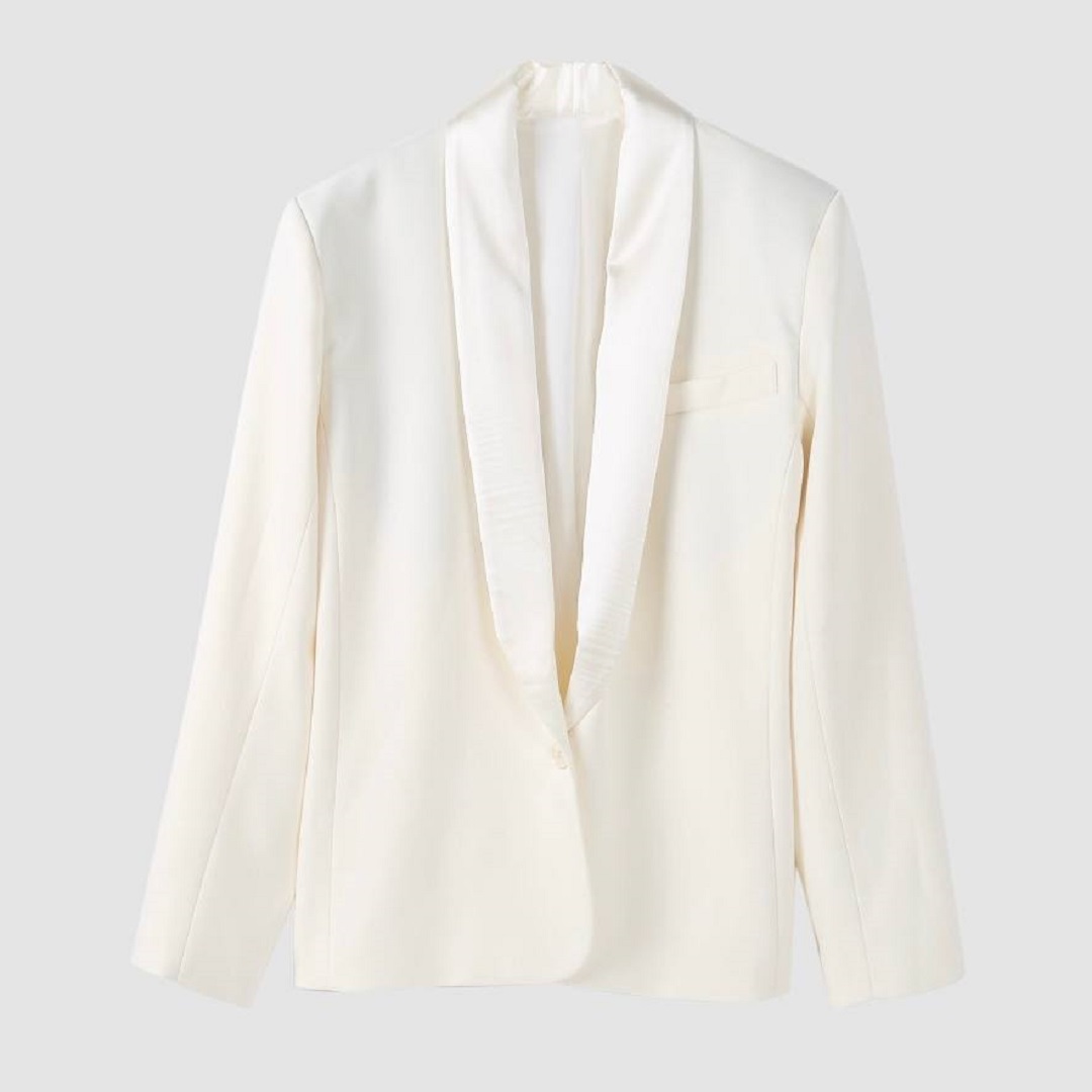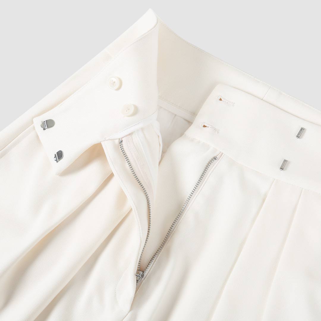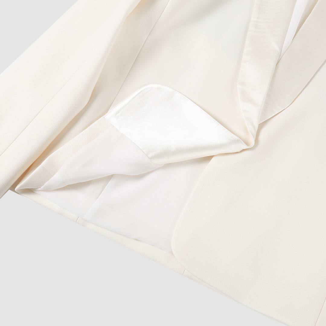 Костюм HELSA выполнен из шелка и шерсти в белом цвете. Он состоит из пиджака и брюк с широким свободным кроем. Носите его с большими сережками и обувью на каблуке.