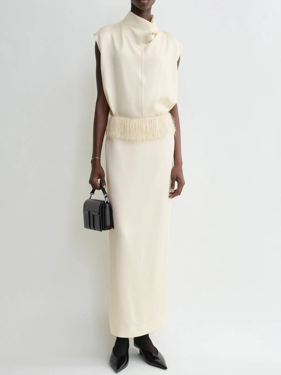 Современное искусство является ключевым источником вдохновения для Toteme, чьи проекты характеризуются смелыми геометрическими формами и неожиданными деталями. Эта блузка и юбка макси выполнена из вискозы и ацетата, юбка имеет форму колонны с особенно высокой талией и дополнена бахромой.