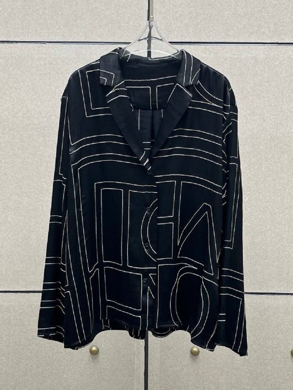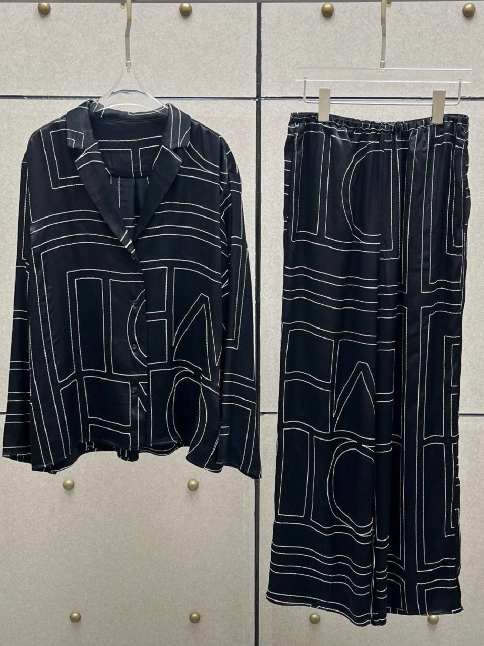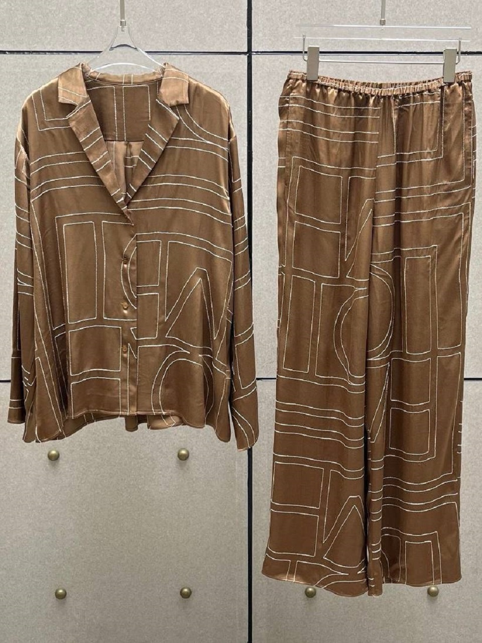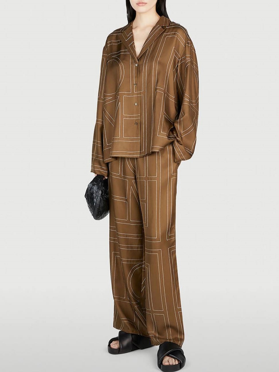 Костюм Toteme с монограммой выполнен из вискозы. Костюм с карманами и эластичным поясом. Носите с ним шлепанцы и крупные сережки.