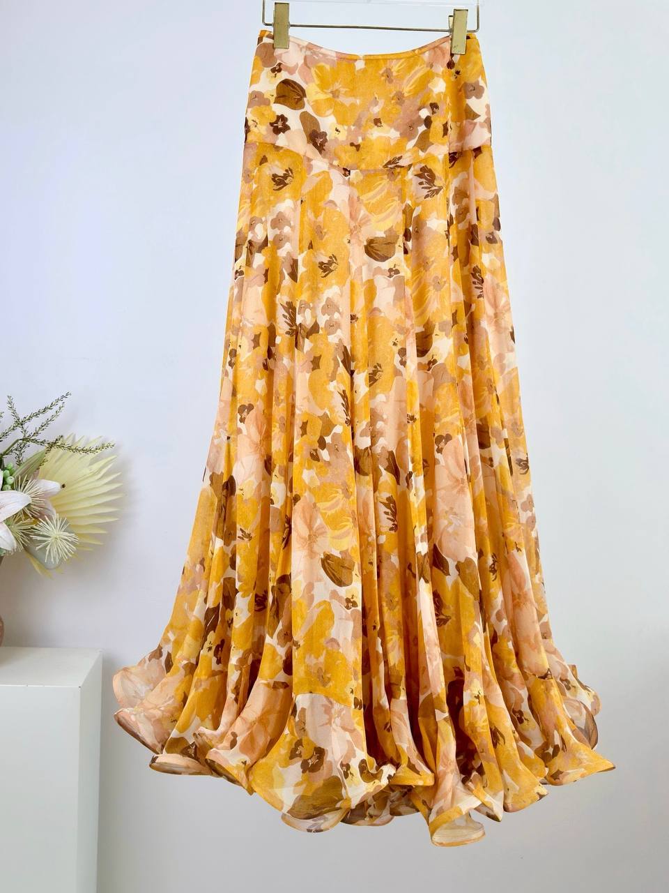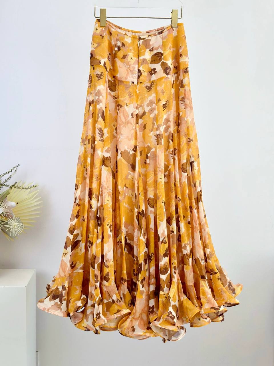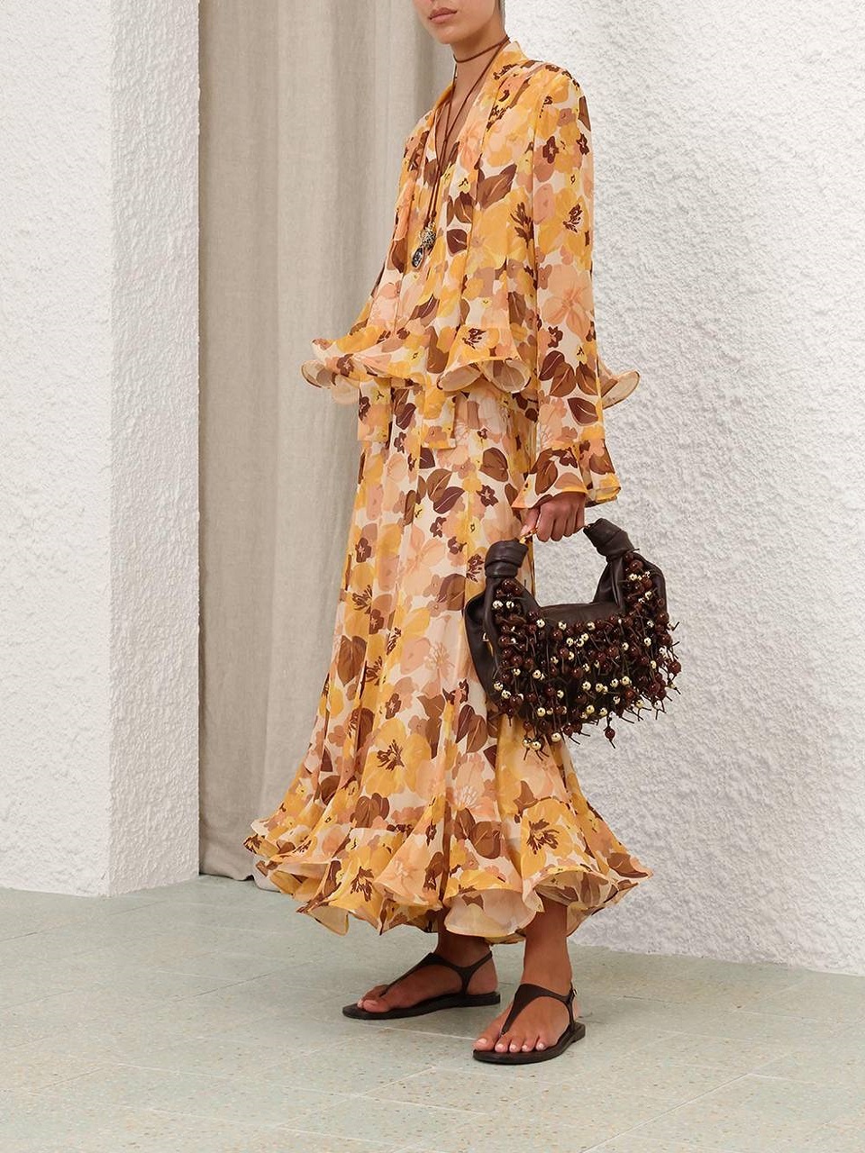 Костюм Zimmermann с оборками имеет сплошной цветочный принт. Юбка с длинным подолом и расклешенная. Носите с костюмом босоножки или балетки.