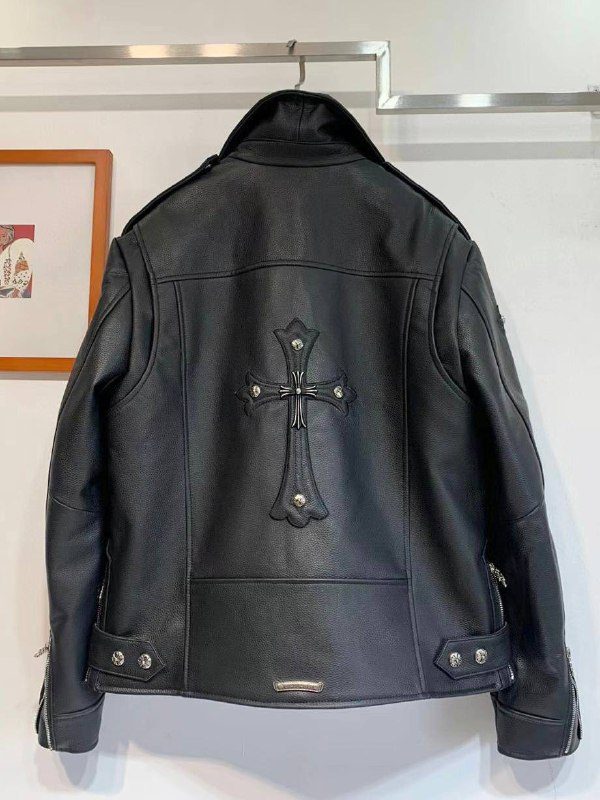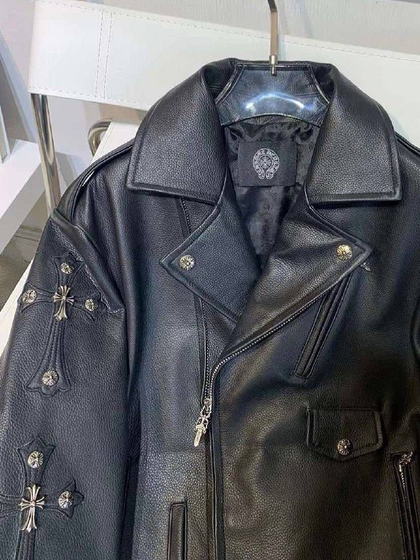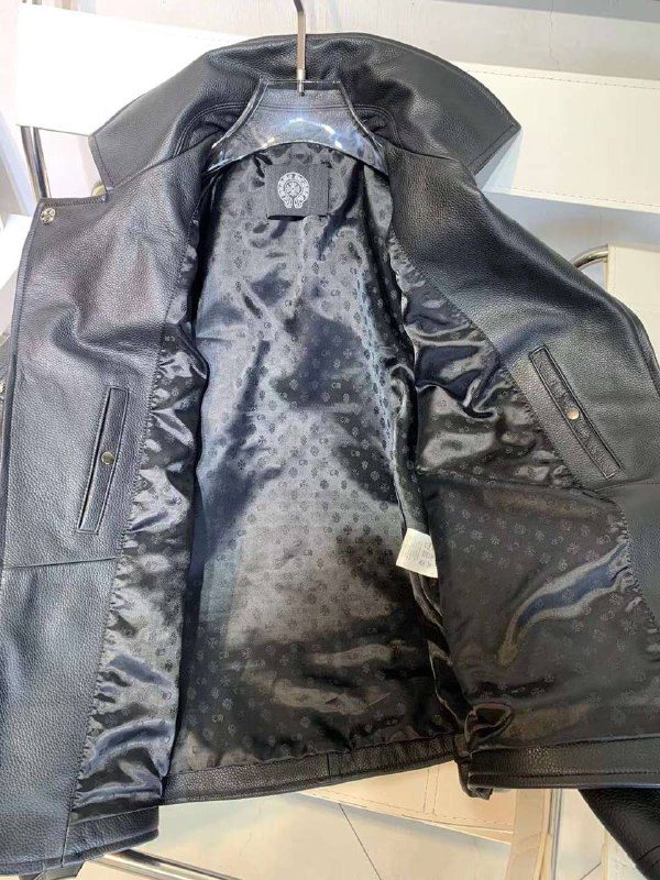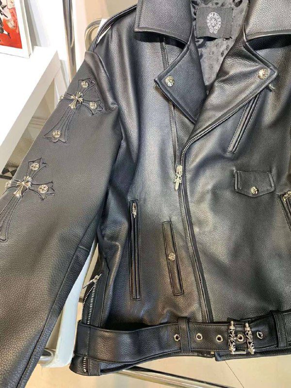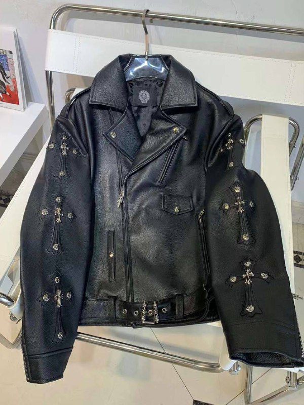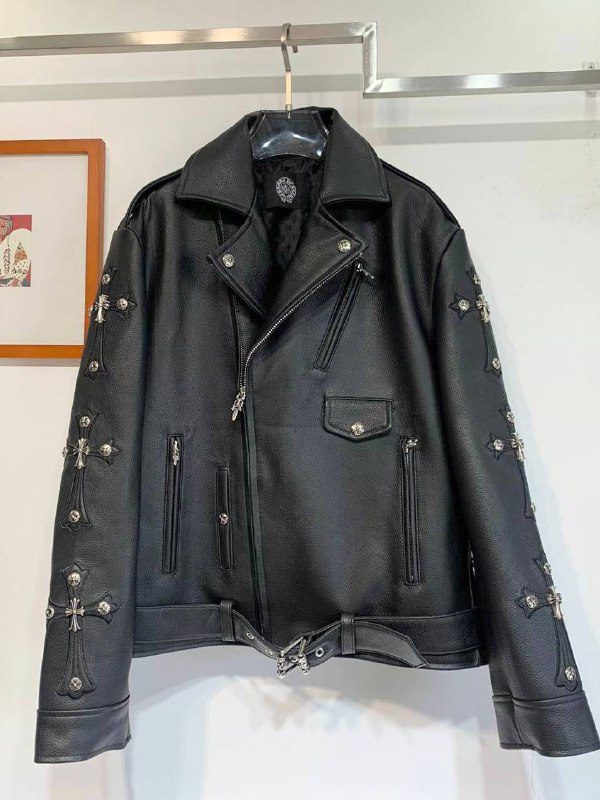 Кожаная куртка Chrome Hearts в черном цвете с фурнитурой и эмблемами бренда. Куртка Chrome Hearts имеет карманы, ремень и воротник. Купив кожаную куртку Chrome Hearts в дополните свой повседневный образ.