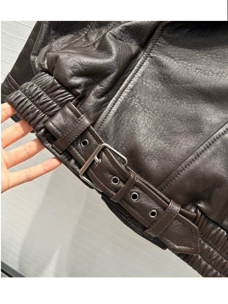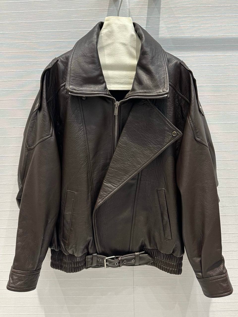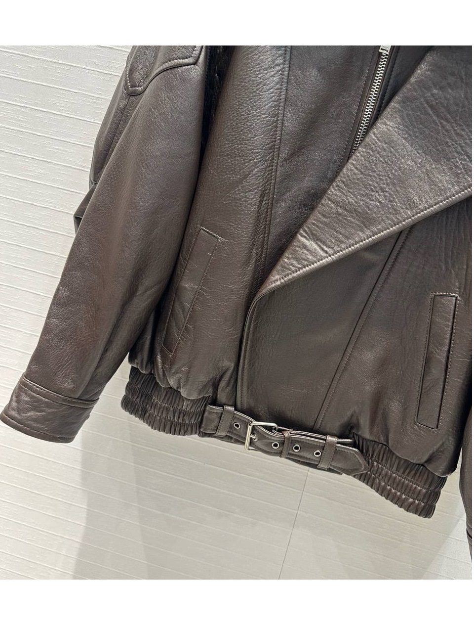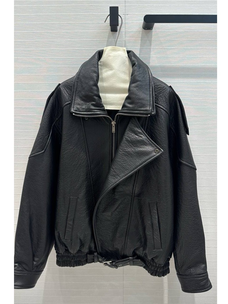 Куртка Saint Laurent сделана из натуральной кожи в черном и коричневом цвете. Данная модель с большим воротником и резинкой внизу, украшена куртка ремнем внизу.