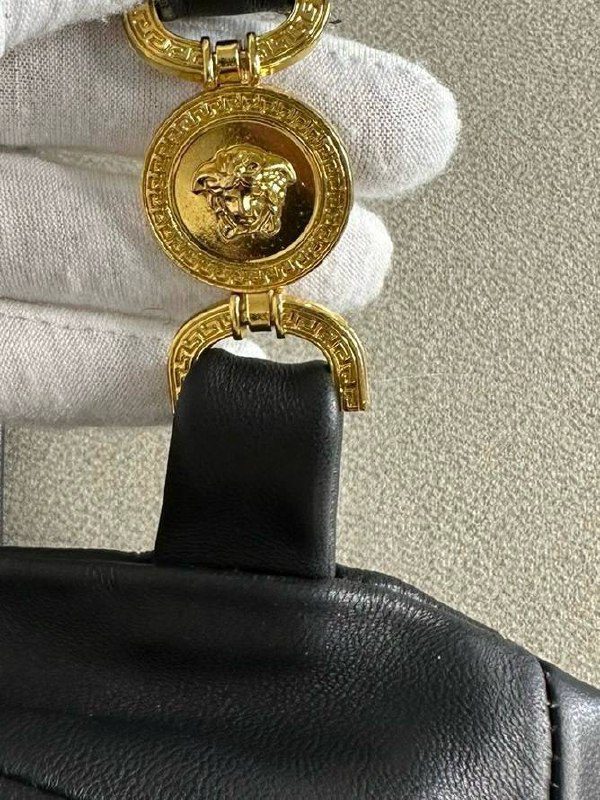 Кожаный топ Versace сделан в виде корсета на тонких бретелях украшенными золотыми вставками логотипа бренда. Купив черный топ Versace вы дополните свой образ.