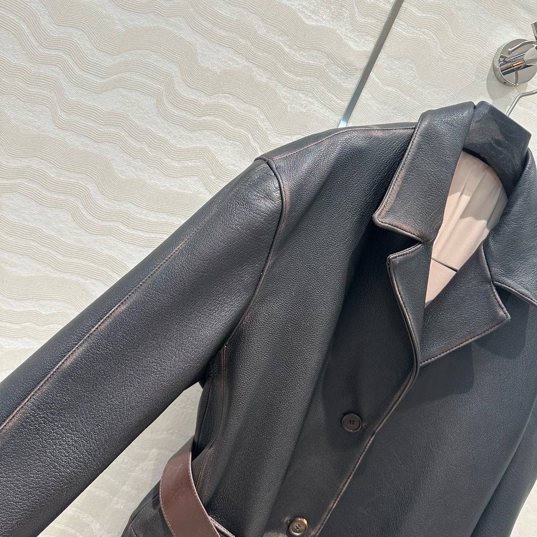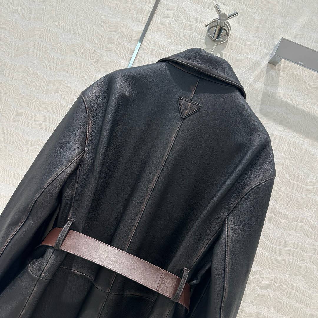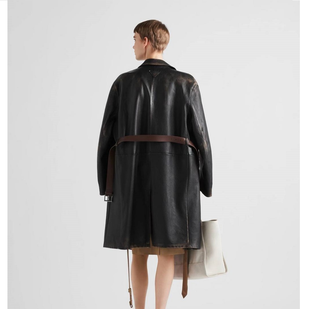 Тренч Prada с потертостями выполнен из натуральной кожи. Даная модель имеет классический воротник, длинные рукава, два прорезных кармана по бокам и съемный пояс. Купив тренч Prada вы дополните свой образ этого сезона.