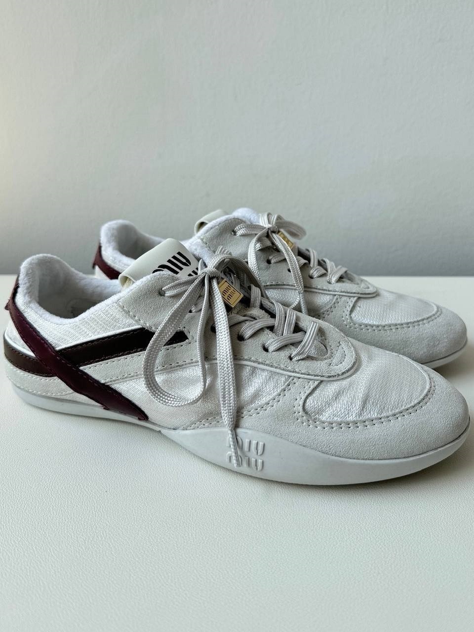 Кроссовки Miu Miu Gymnasium созданы в спортивном ретро-стиле. Сделаны из замши и контрастные кожаные панели. Носите их с чем угодно: от джинсов до платьев.