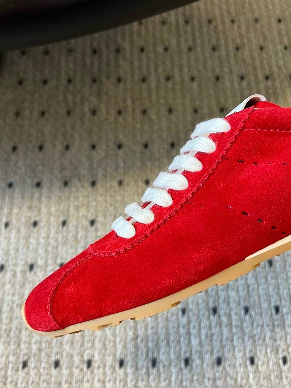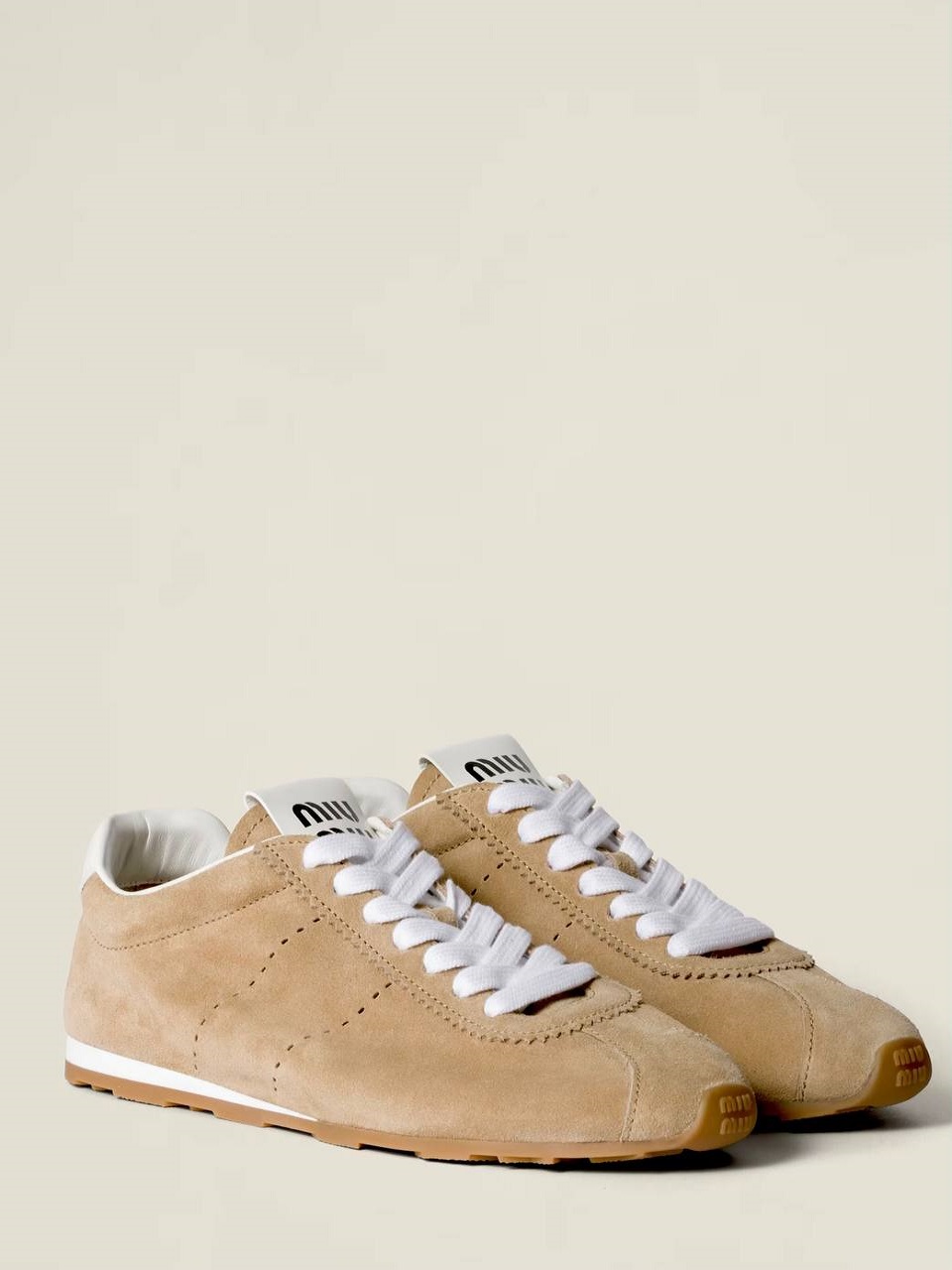 Кроссовки Miu Miu Plume изначально были выпущены как обувь для занятий спортом в помещении и с тех пор стали культовым элементом уличной моды. Эта версия выполнена из бежевой и красной замши с резиновыми подошвами.