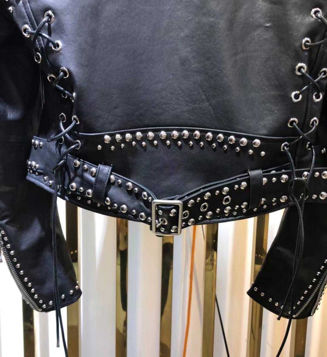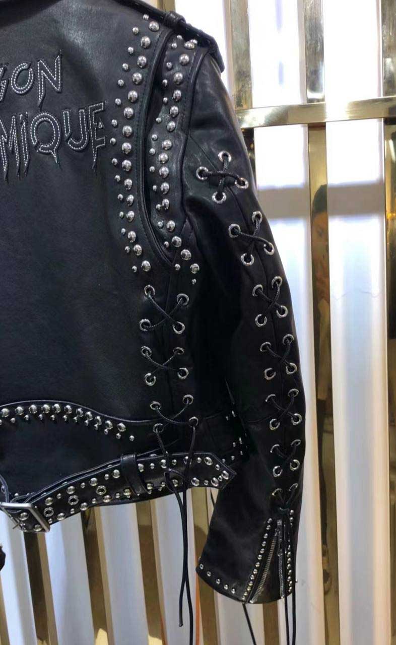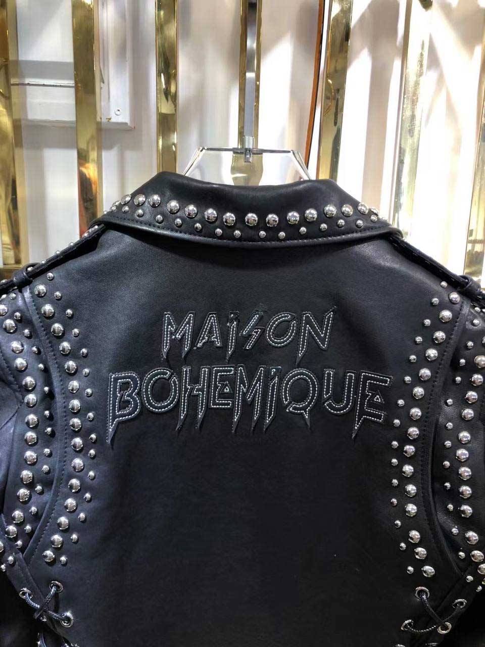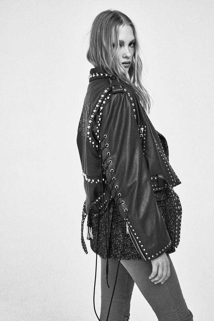 Куртка Maison Bohemique в байкерском стиле с заклепками и шнуровкой на спинке и рукавах. Плечевые срезы украшены погонами. Нижний край фиксирован широким ремнем, который фиксирован шлевками и стальной пряжкой с клепками, стойка воротник. Куртка Bohemique будет сочетаться с казаками Isabel Marant.