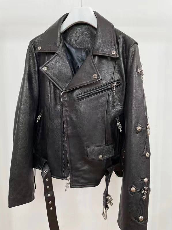 Куртка в стиле классической косухи. Натуральная кожа, откидной воротник с лацканами, куртка украшена металлическими заклёпками, нагрудный прорезной карман на груди и два по бокам, спереди имитация кармана с клапаном на кнопке, рукава и спина украшена выпуклыми кожаными патчами в духе бренда Chrome Hearts с серебристыми заклёпками, куртка дополнена кожаным ремешком с металлической пряжкой и шлевками для него, по бокам фиксируется шнуровкой. Купить куртку можно в универсальном черном цвете.