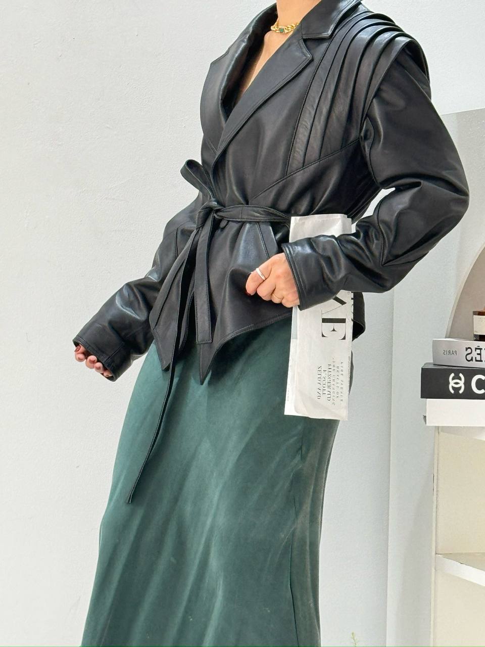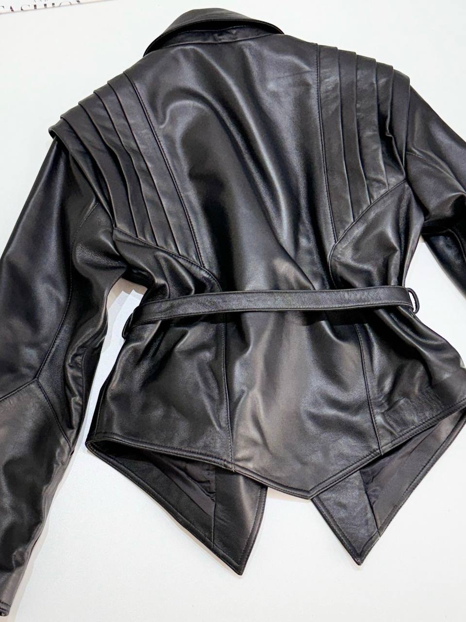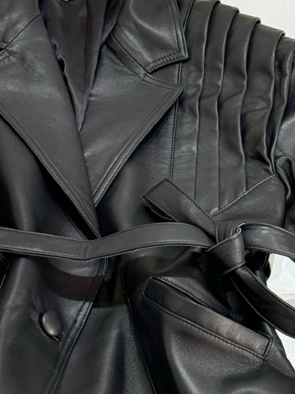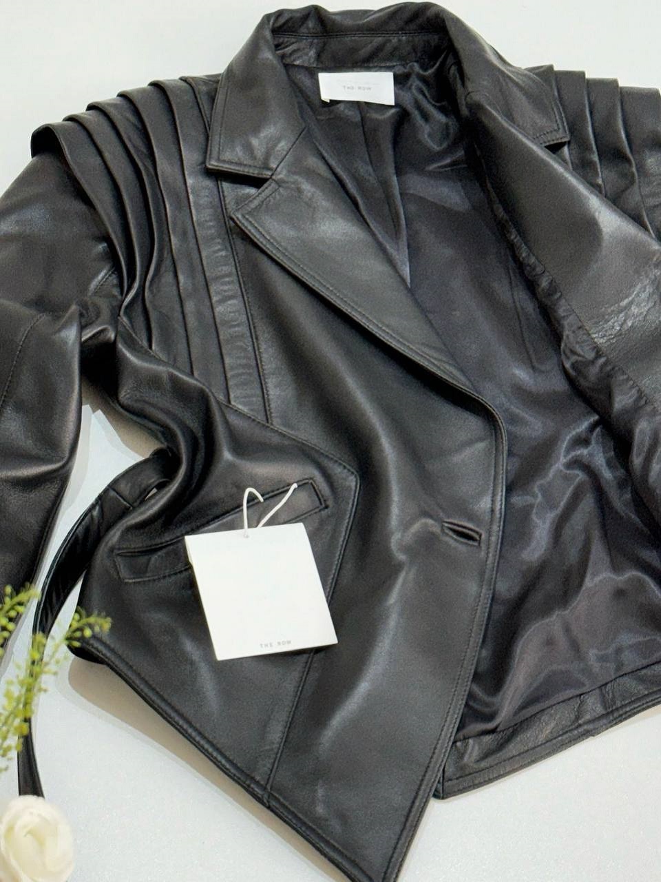 Куртка The Row изготовленная из черной кожи, эта куртка слегка мятая, чтобы напоминать любимую вещь, и затягивается поясом-кушаком. Подкладка из атласного твила обеспечивает гладкое наложение слоев.
