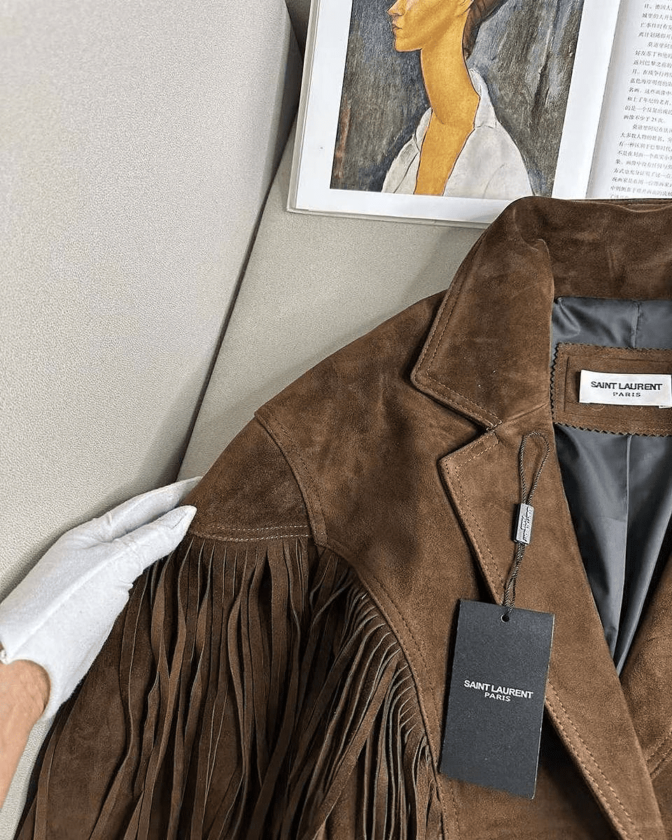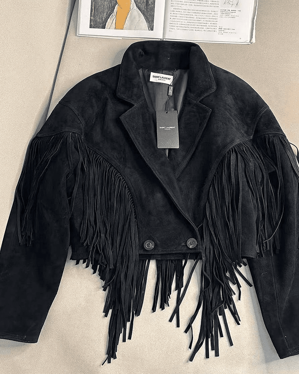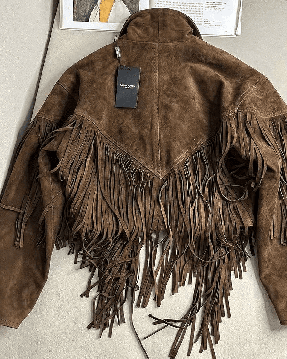 Куртка замшевая Saint Laurent в коричневом и черном цвете. Данная модель короткая украшена бахромой. Коллекция SS2025