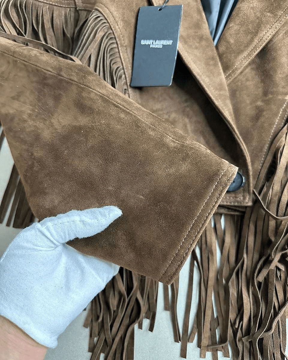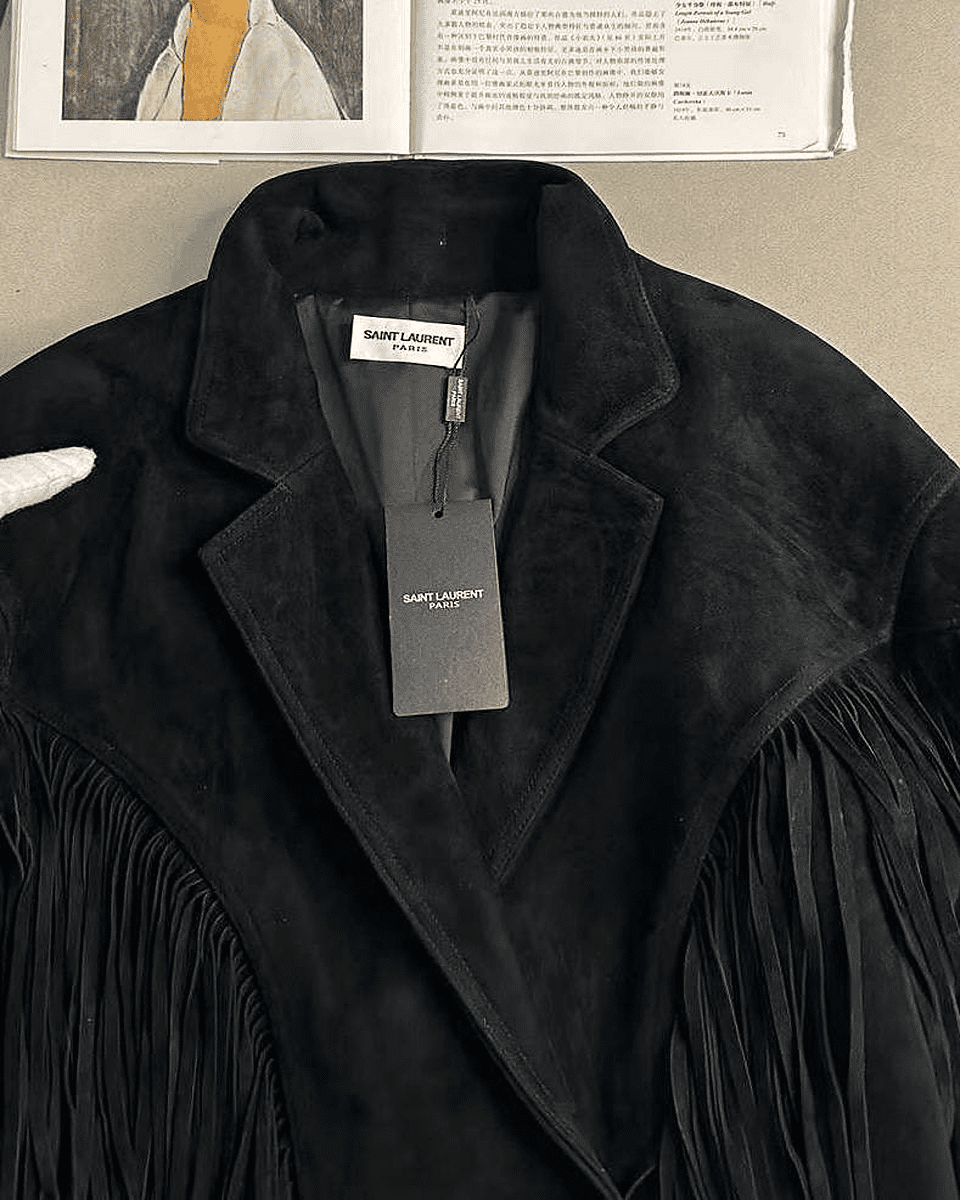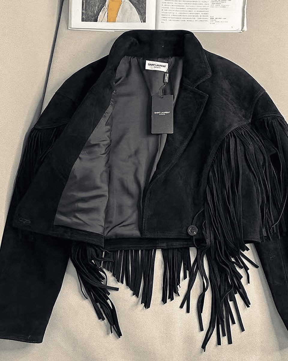 Куртка замшевая Saint Laurent в коричневом и черном цвете. Данная модель короткая украшена бахромой. Коллекция SS2025