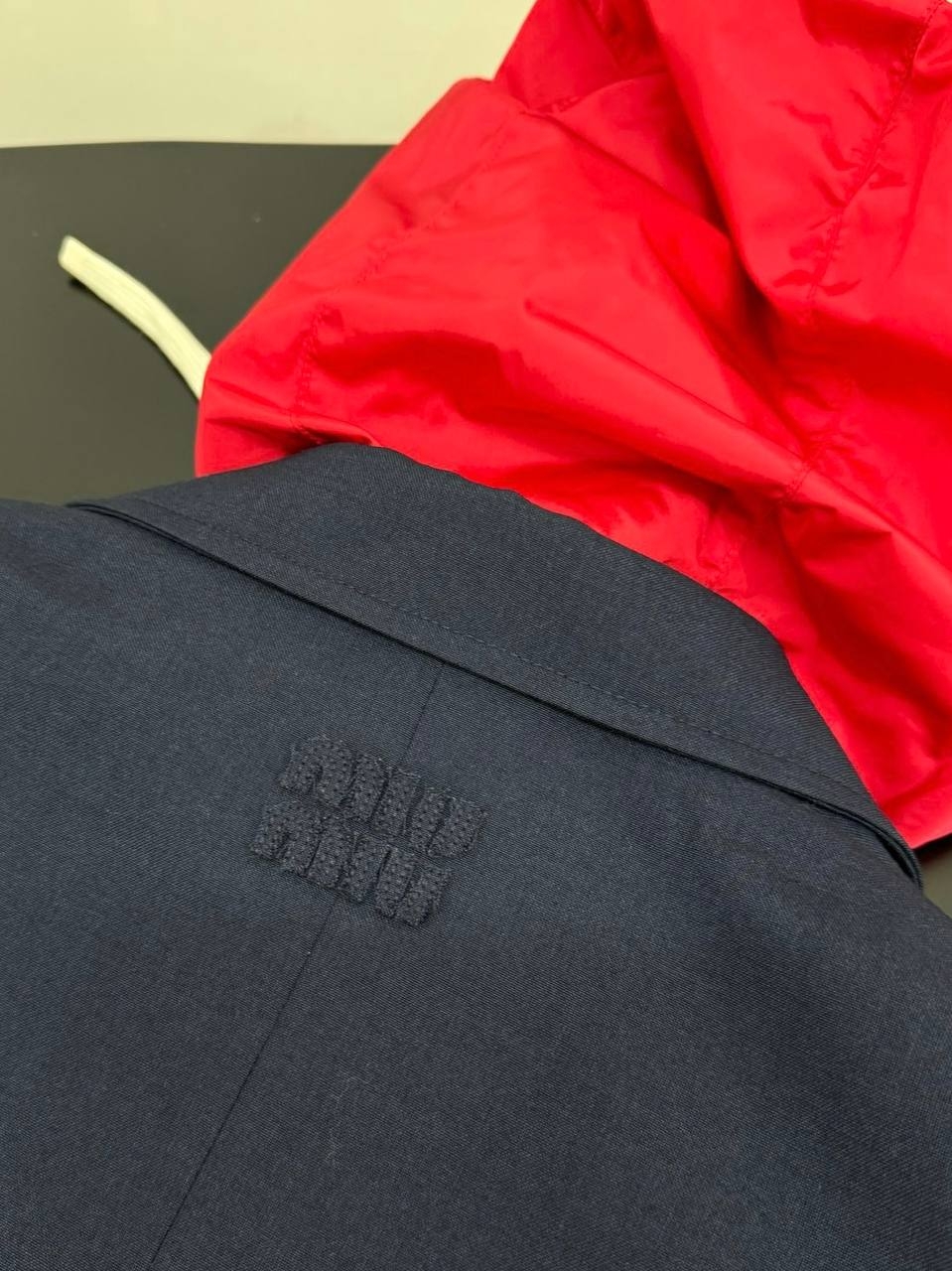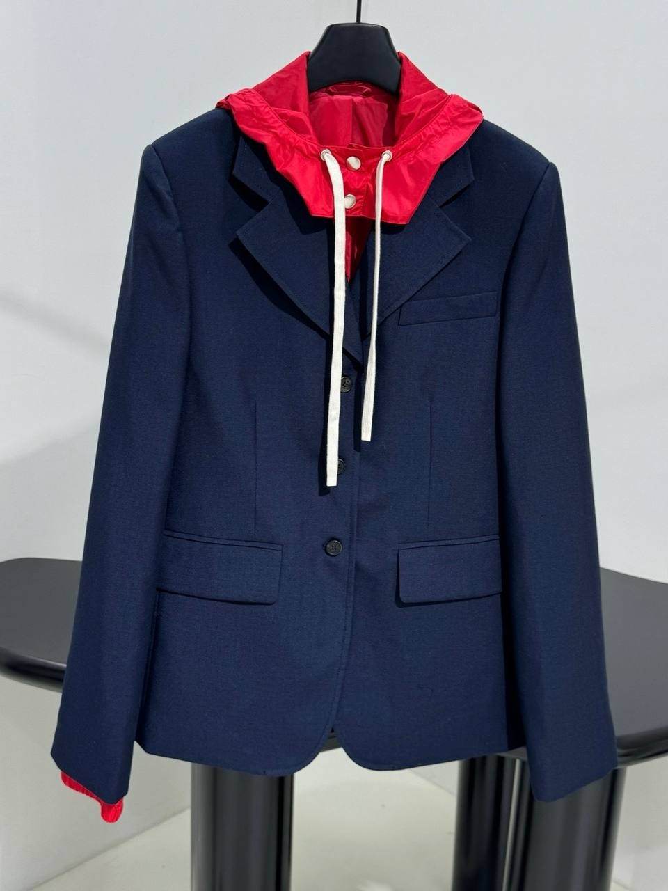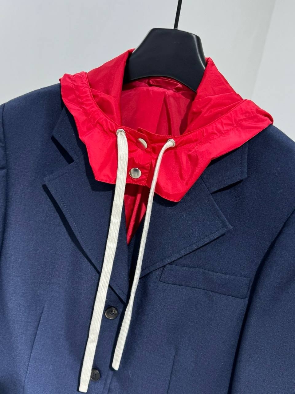 Куртка Miu Miu выполнена из натуральной шерсти. Двубортная куртка имеет вид пиджака, но красные рукава и капюшон делают ее повседневной. Носите ее как с кроссовками так и с обувью на каблуке.