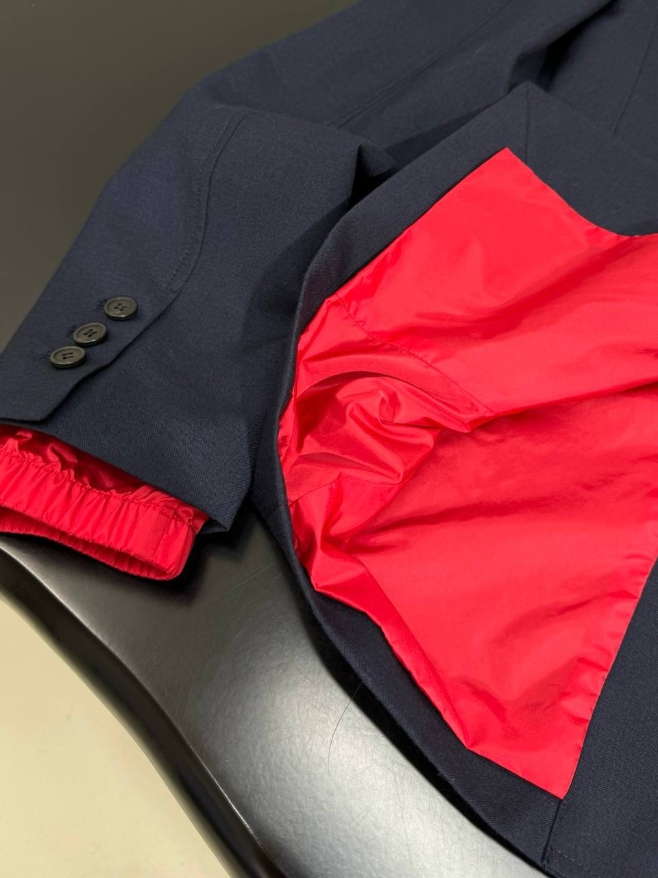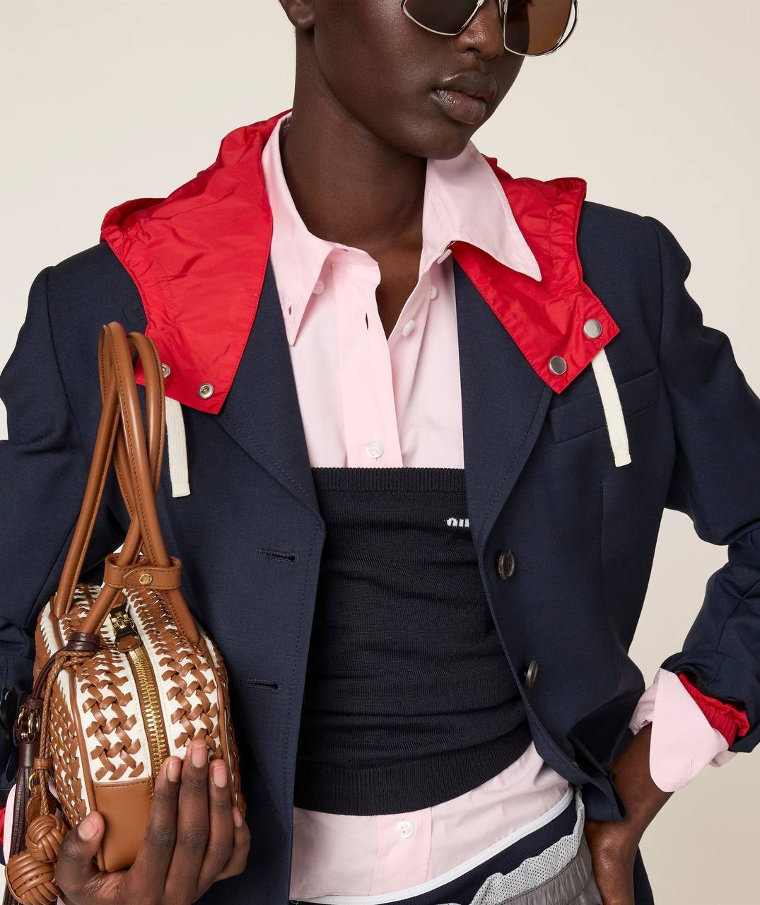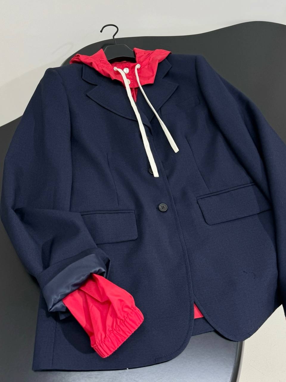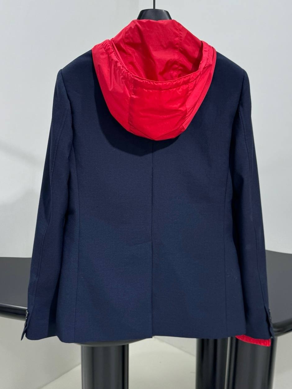 Куртка Miu Miu выполнена из натуральной шерсти. Двубортная куртка имеет вид пиджака, но красные рукава и капюшон делают ее повседневной. Носите ее как с кроссовками так и с обувью на каблуке.
