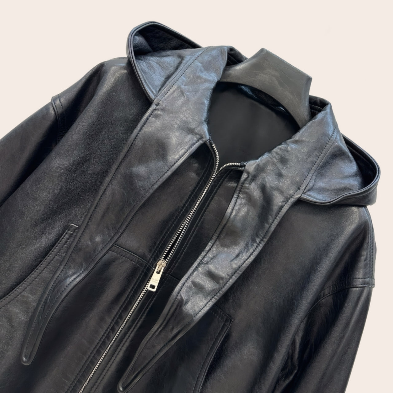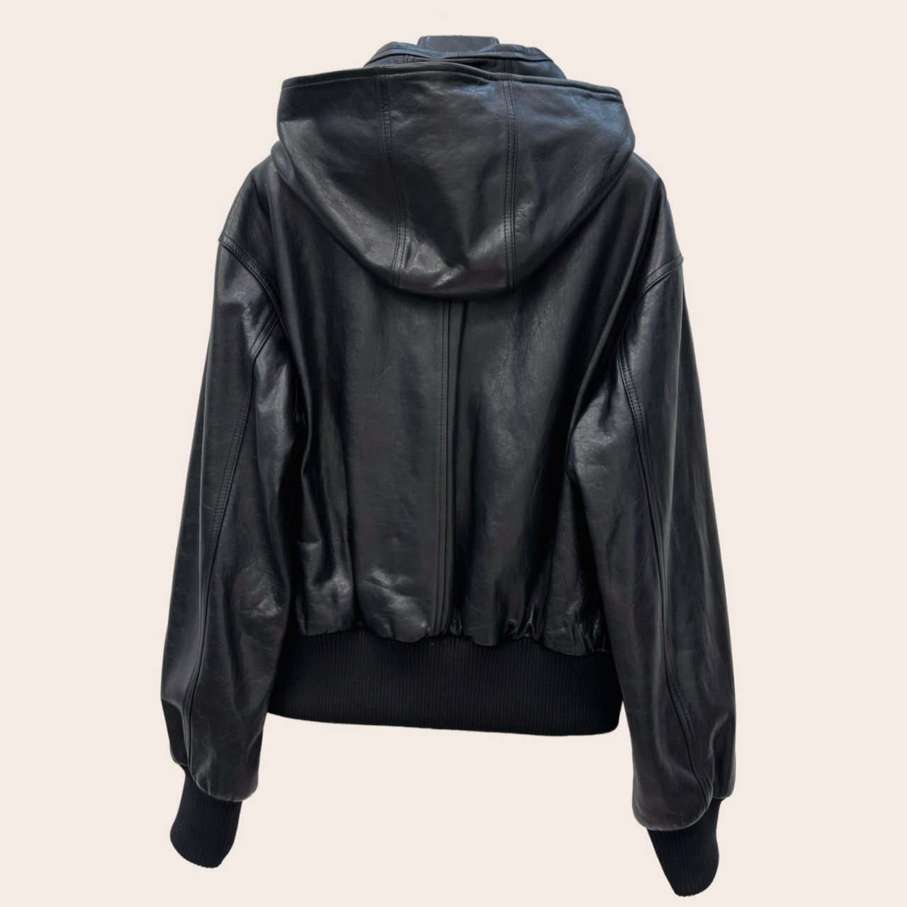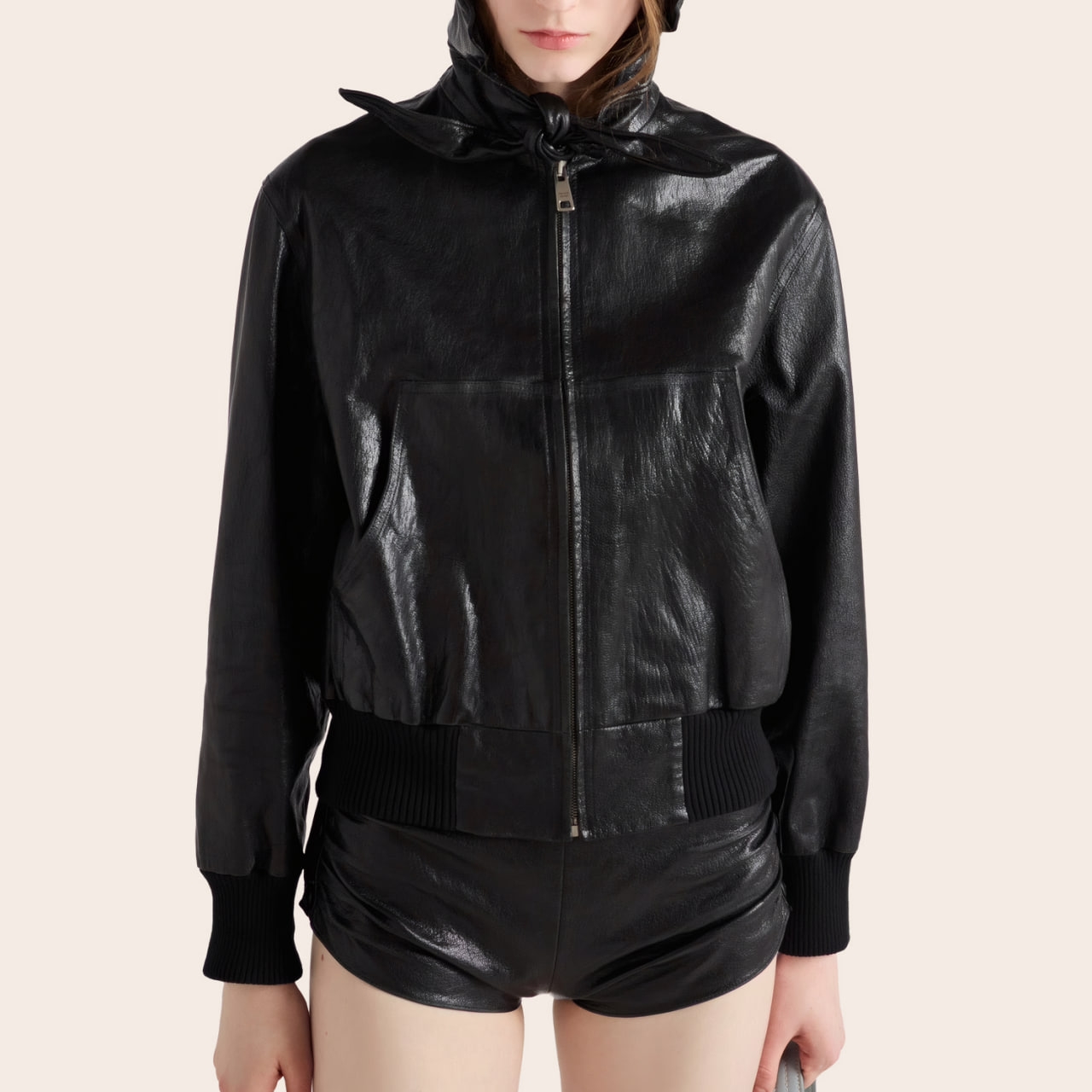 Ни один гардероб не будет полным без классической кожаной куртки. Эта модель от Prada с капюшоном застегивается на молнии и дополнена воротником, который завязывается, на рукавах и подоле сделан рубчик.