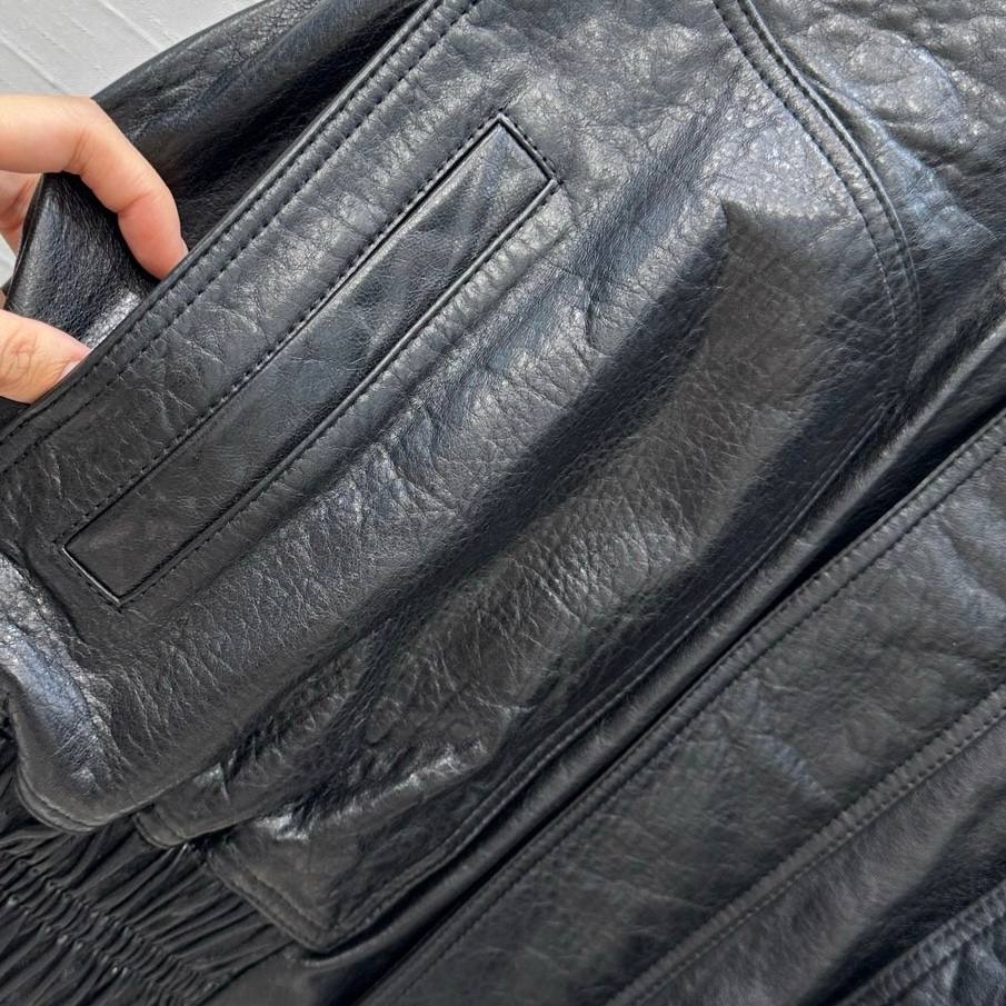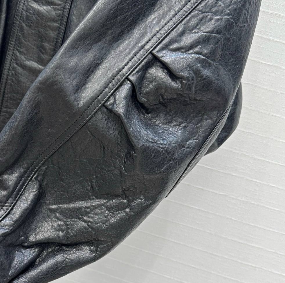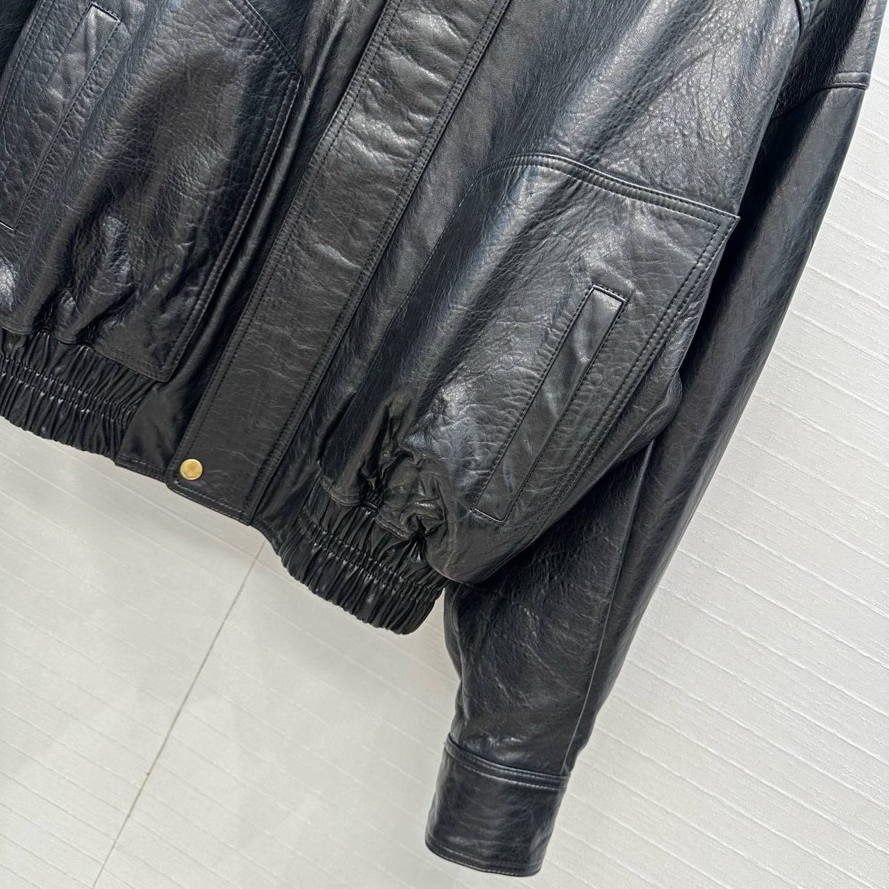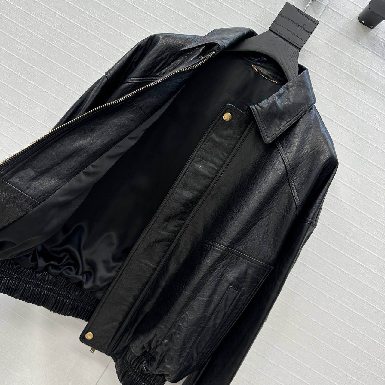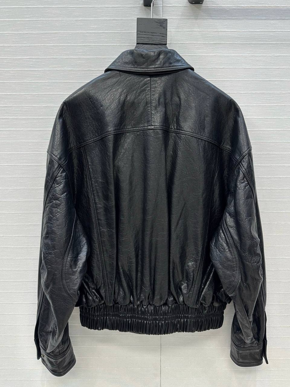 Коллекция Saint Laurent 2025 отдает дань уважения основателю бренда, предлагая новую интерпретацию моделей, которые он носил в 1980-х. Представленная на подиуме куртка выполнена из мягкой кожи, имеет свободный крой, резинки внизу и на рукавах. Ее можно носить как с классическими брюками, так и с женственными платьями.