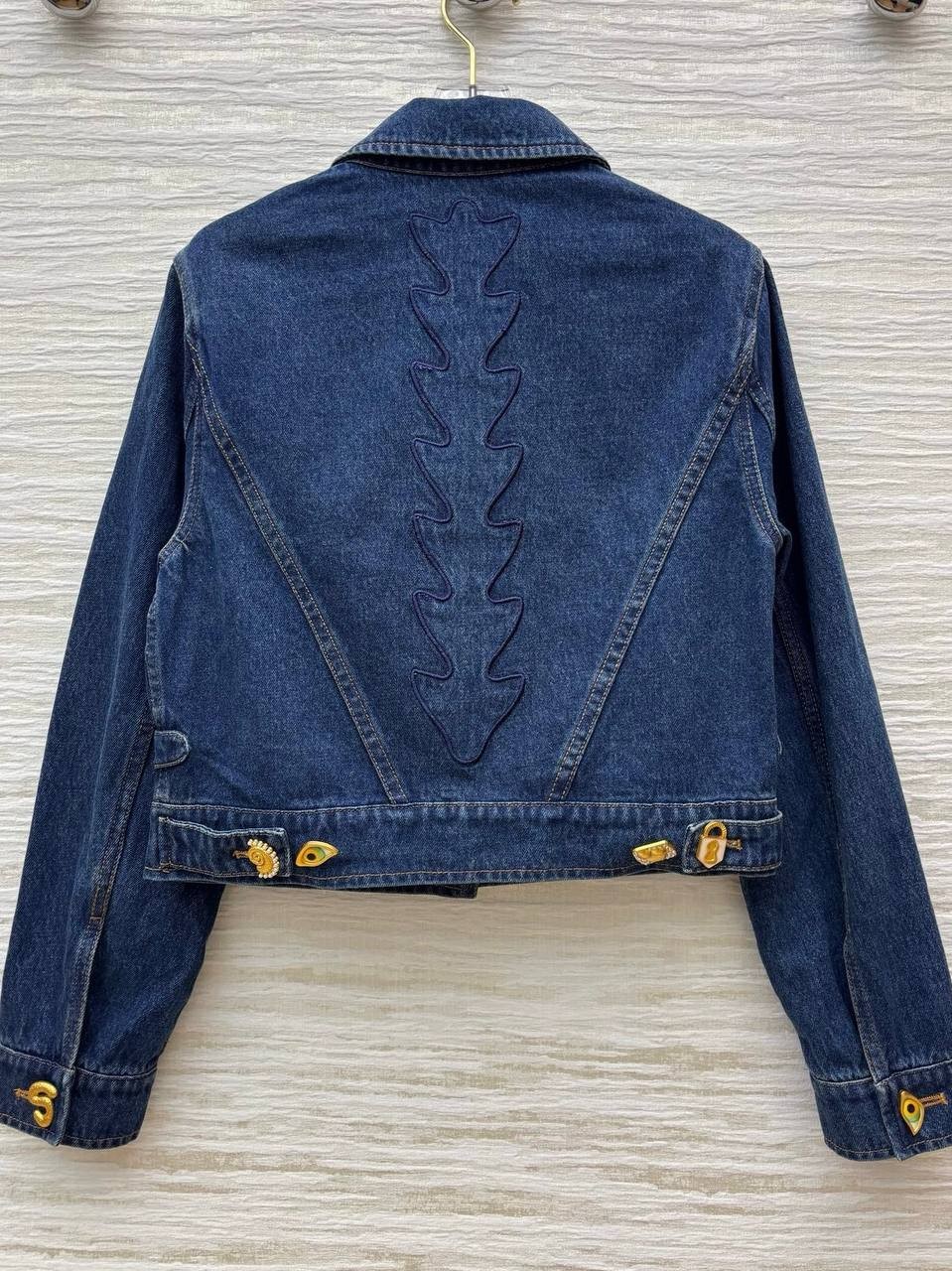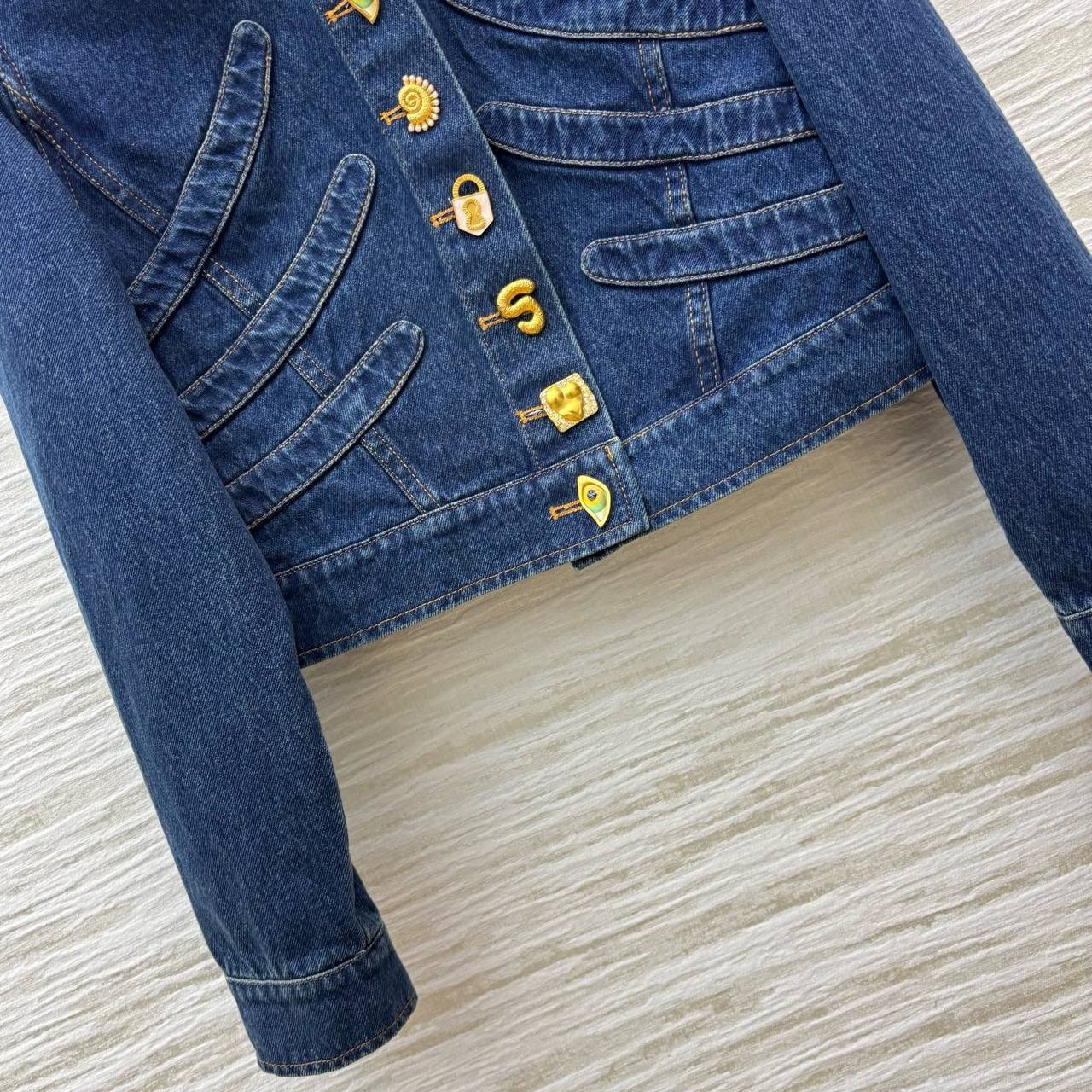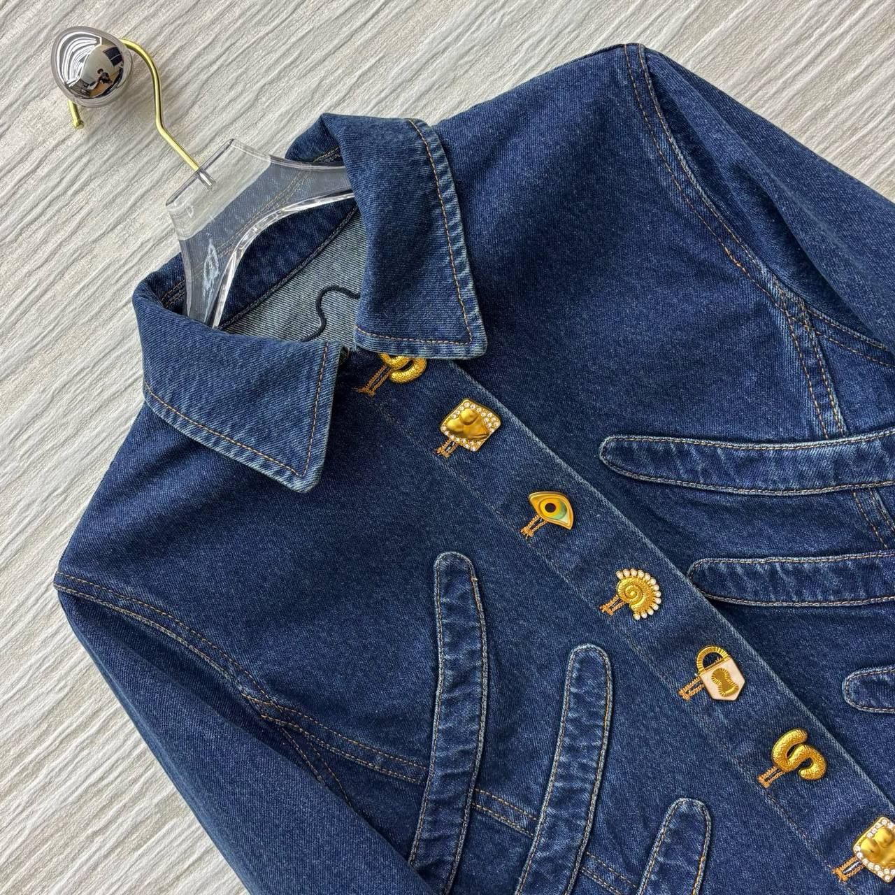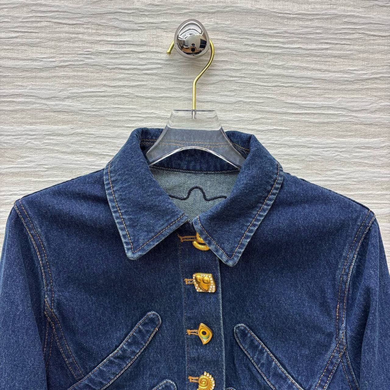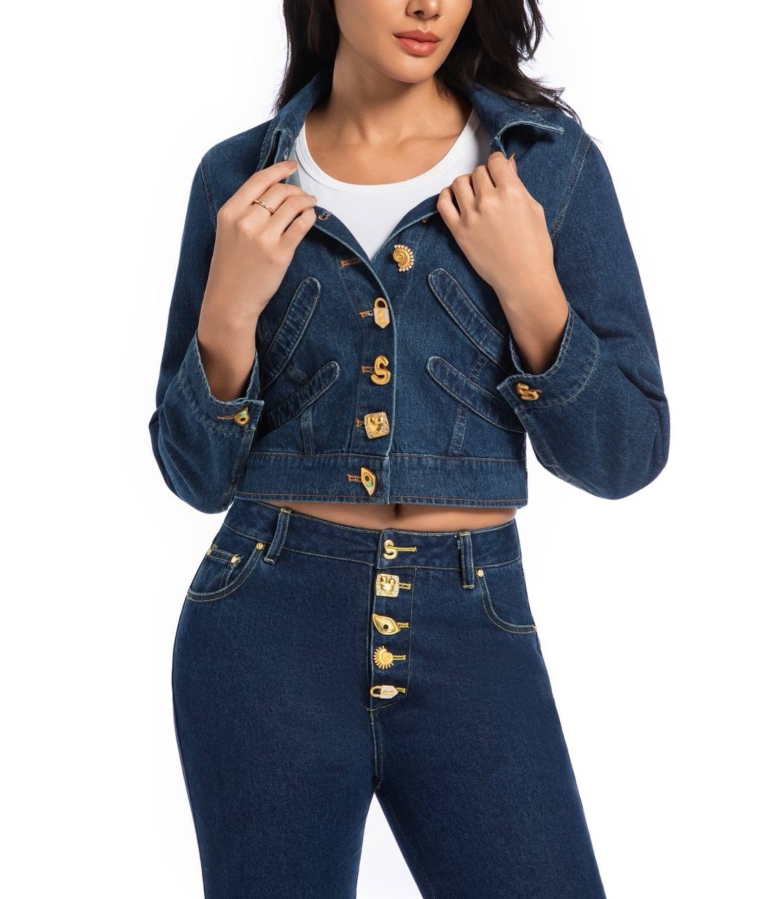 Однобортная куртка из синего денима в синем цвете выполнена из натурального хлопка. Укороченная джинсовая куртка украшена золотыми разными пуговицами.
