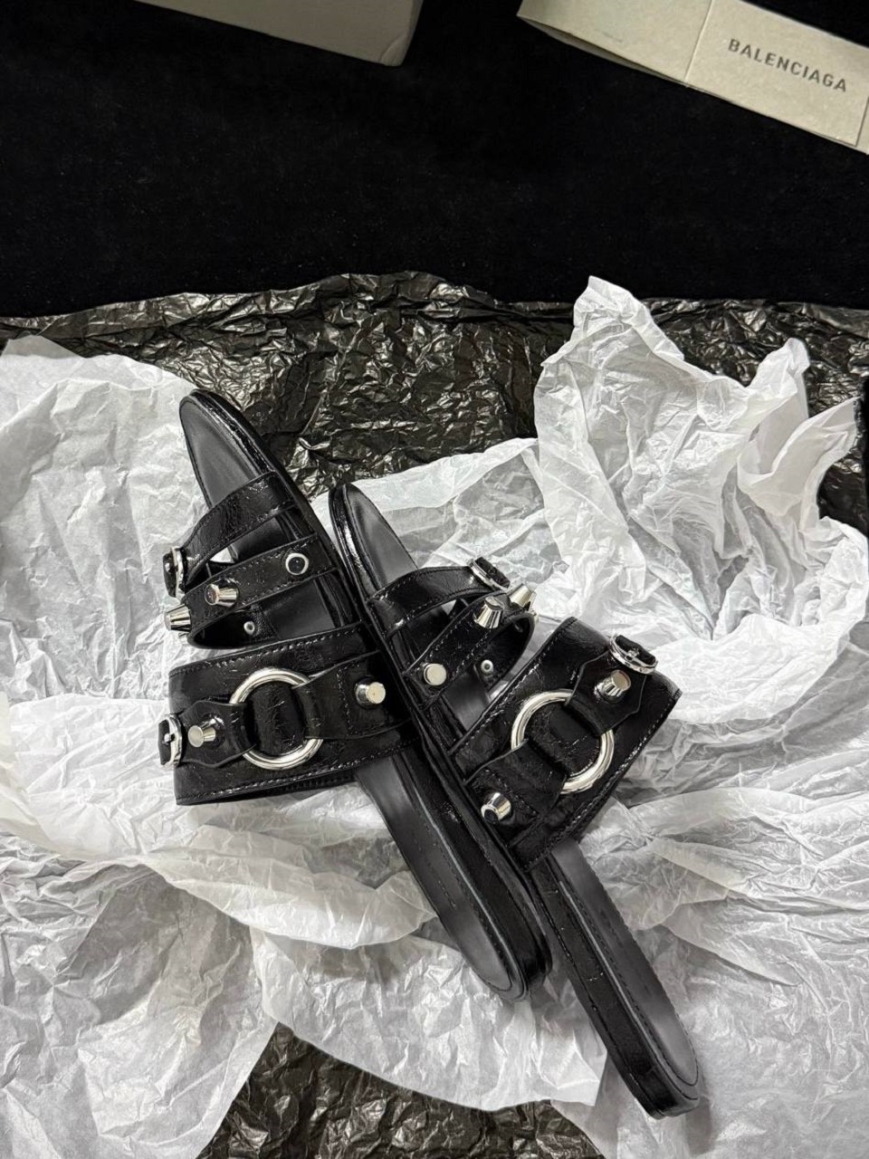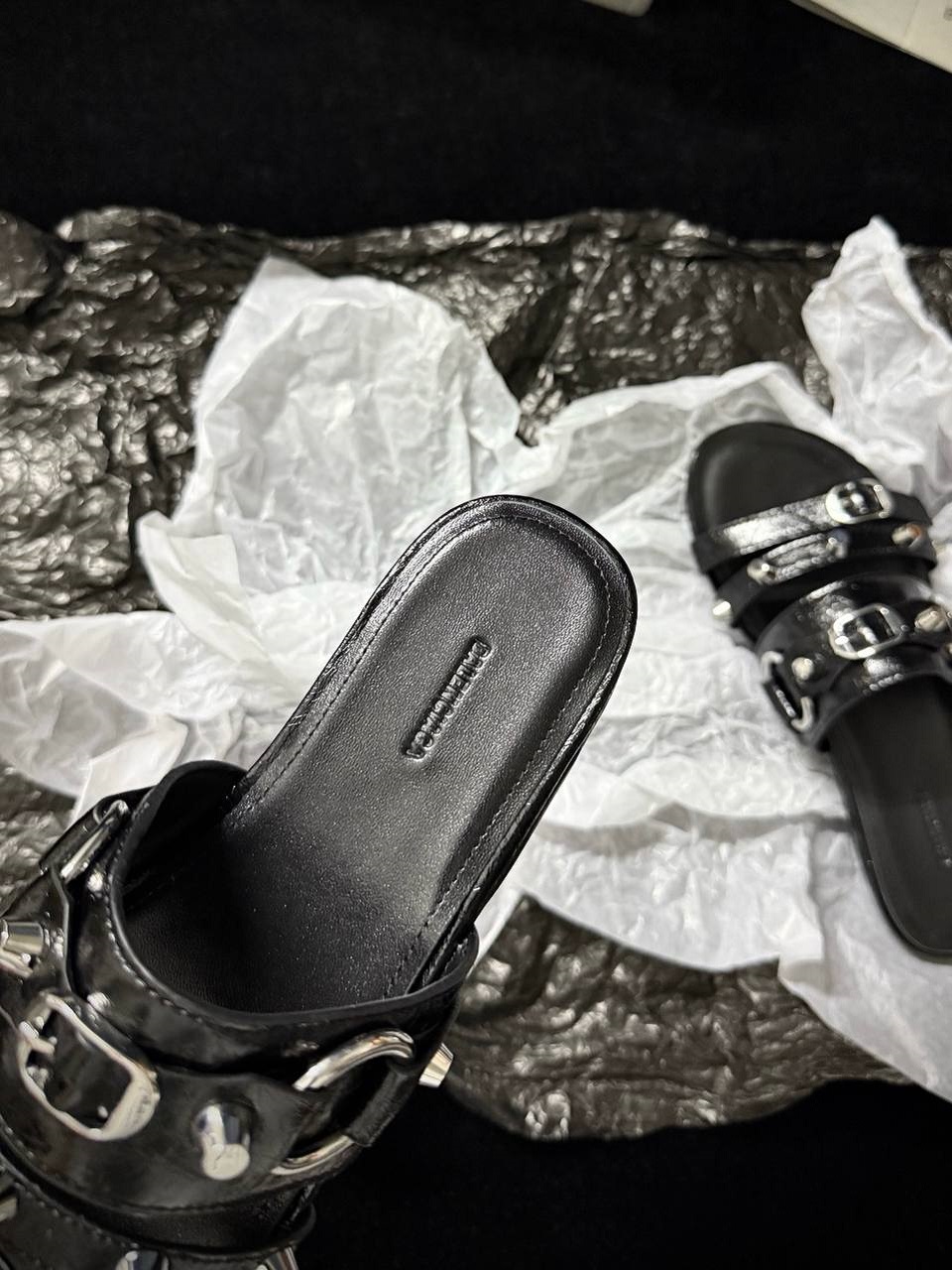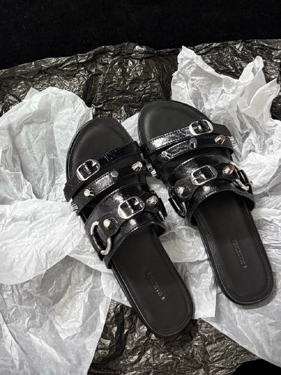 Мюли Balenciaga украшены теми же бронзовыми заклепками и пряжками, которые украшают культовые сумки бренда «City». Сделанные из мятой кожи, они имеют мягкие стельки и плоскую подошву.