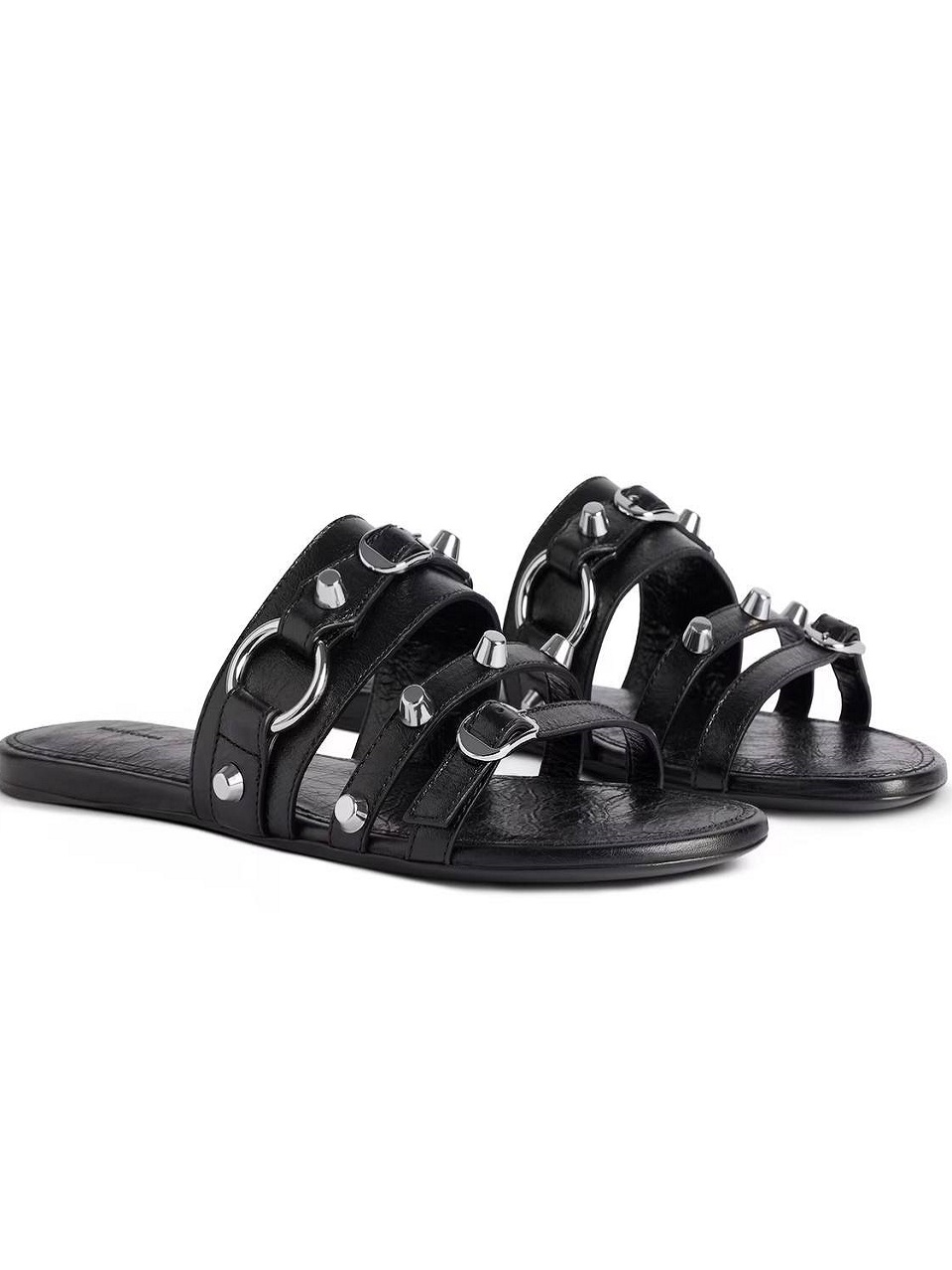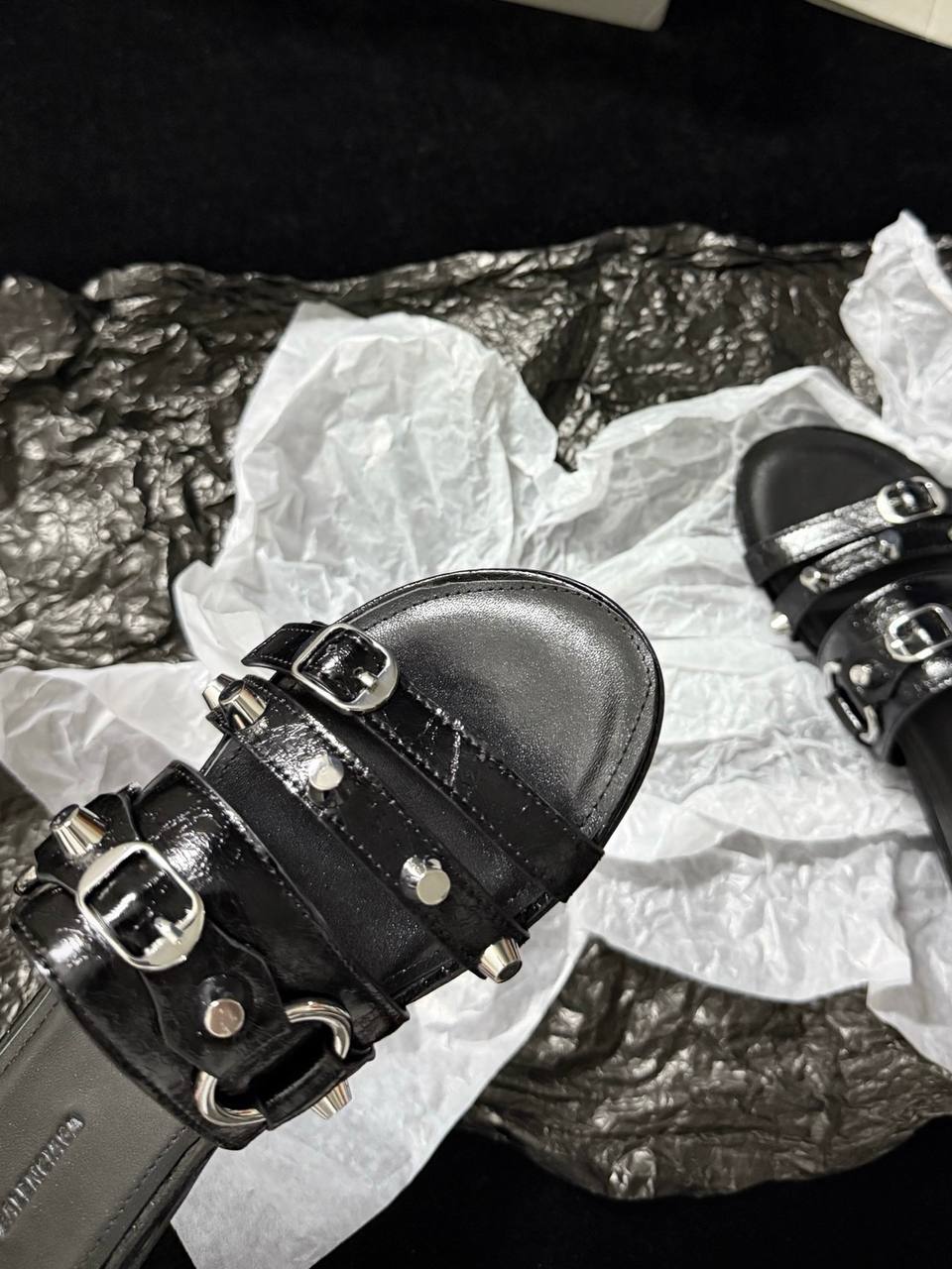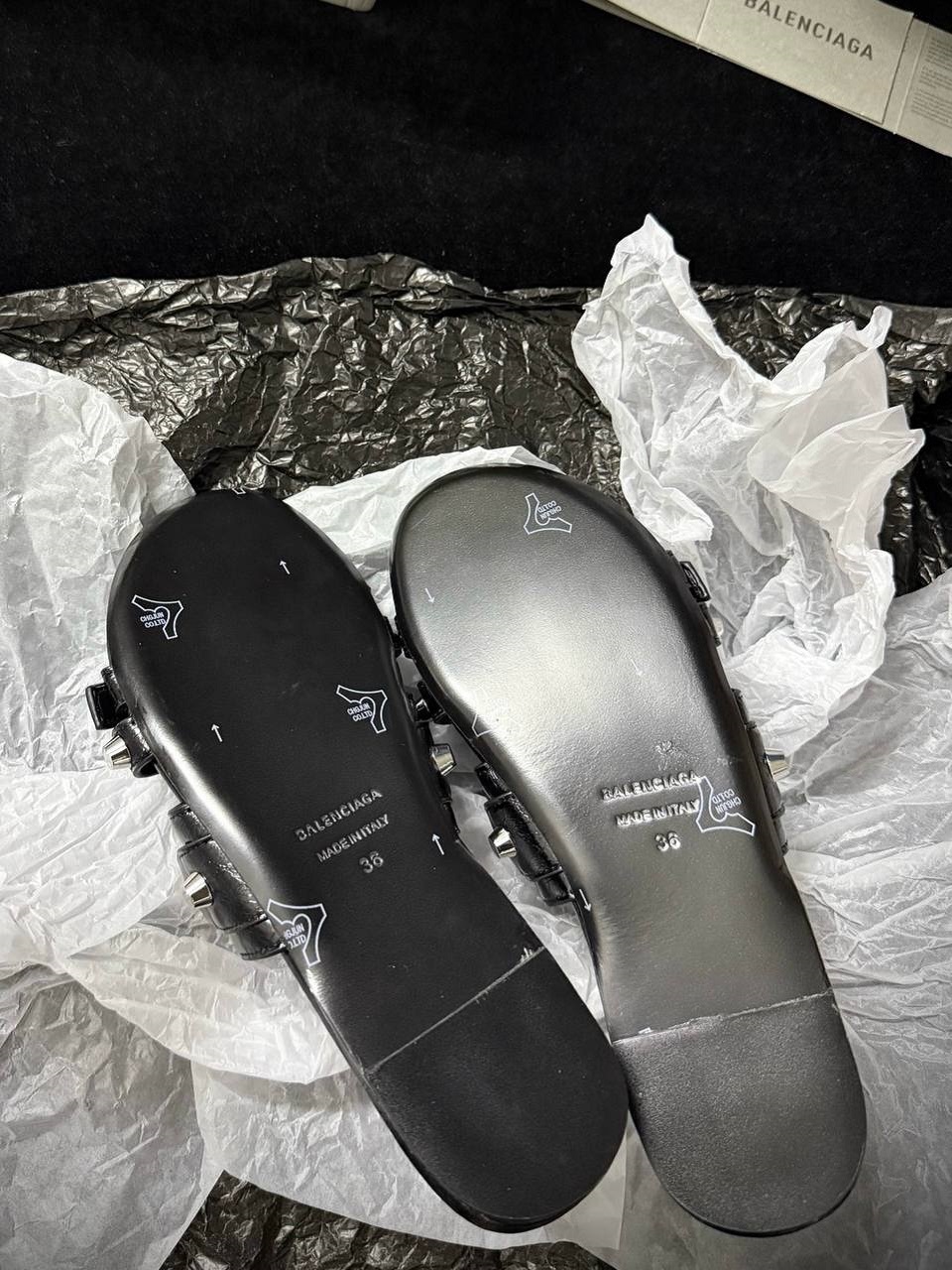 Мюли Balenciaga украшены теми же бронзовыми заклепками и пряжками, которые украшают культовые сумки бренда «City». Сделанные из мятой кожи, они имеют мягкие стельки и плоскую подошву.